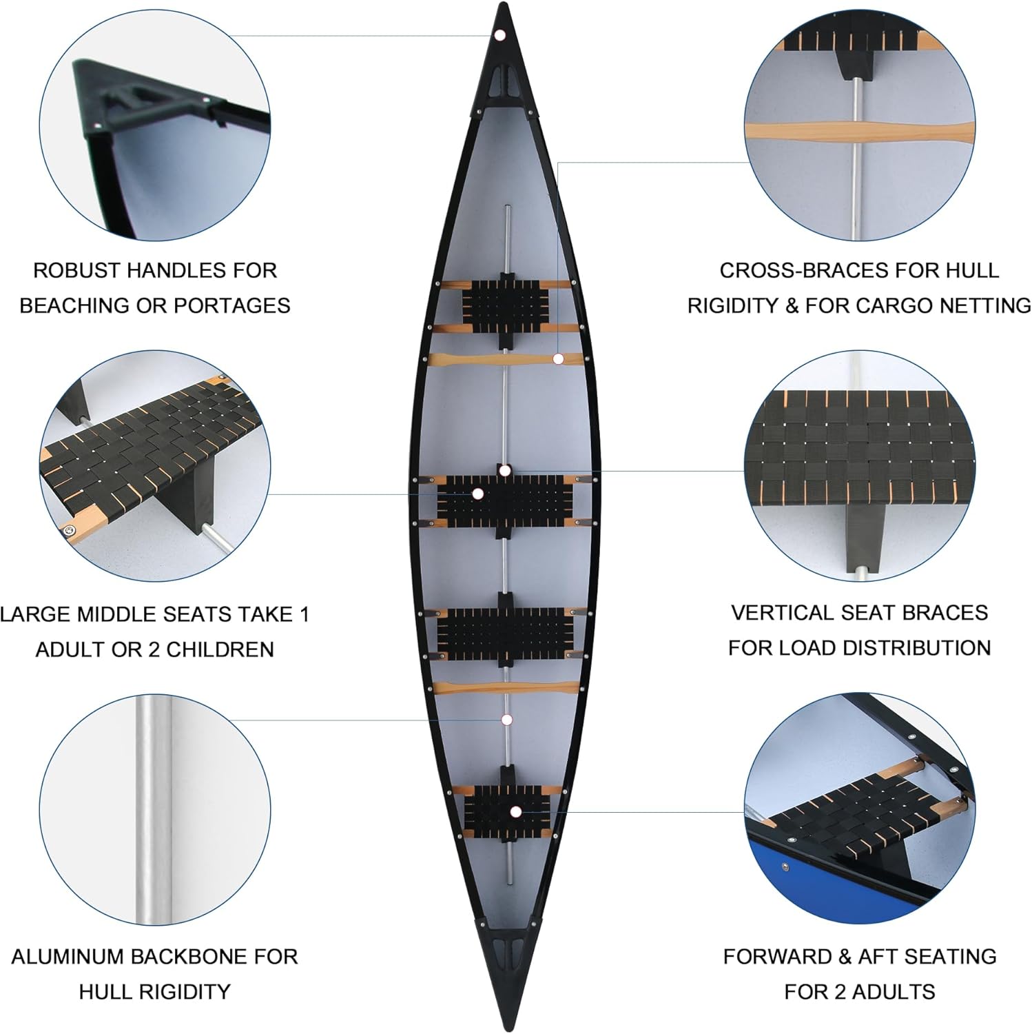 - Optimized for Safety: Engineered to support up to 936lbs, our canoe's design prioritizes stability and safety, featuring a hull weight of 104.9 pounds and durable construction with PP and fiberglass blades and an aluminum alloy tube rod.