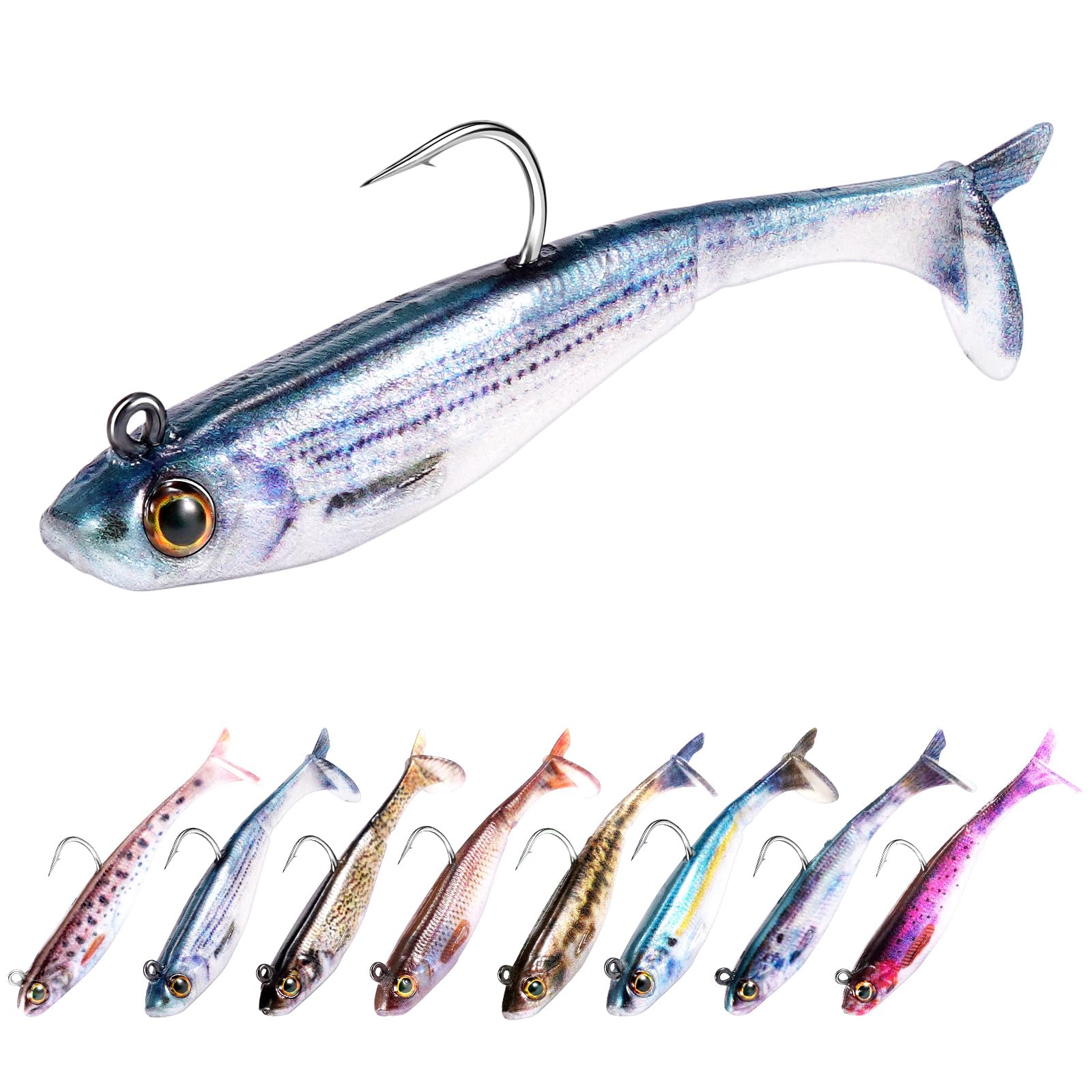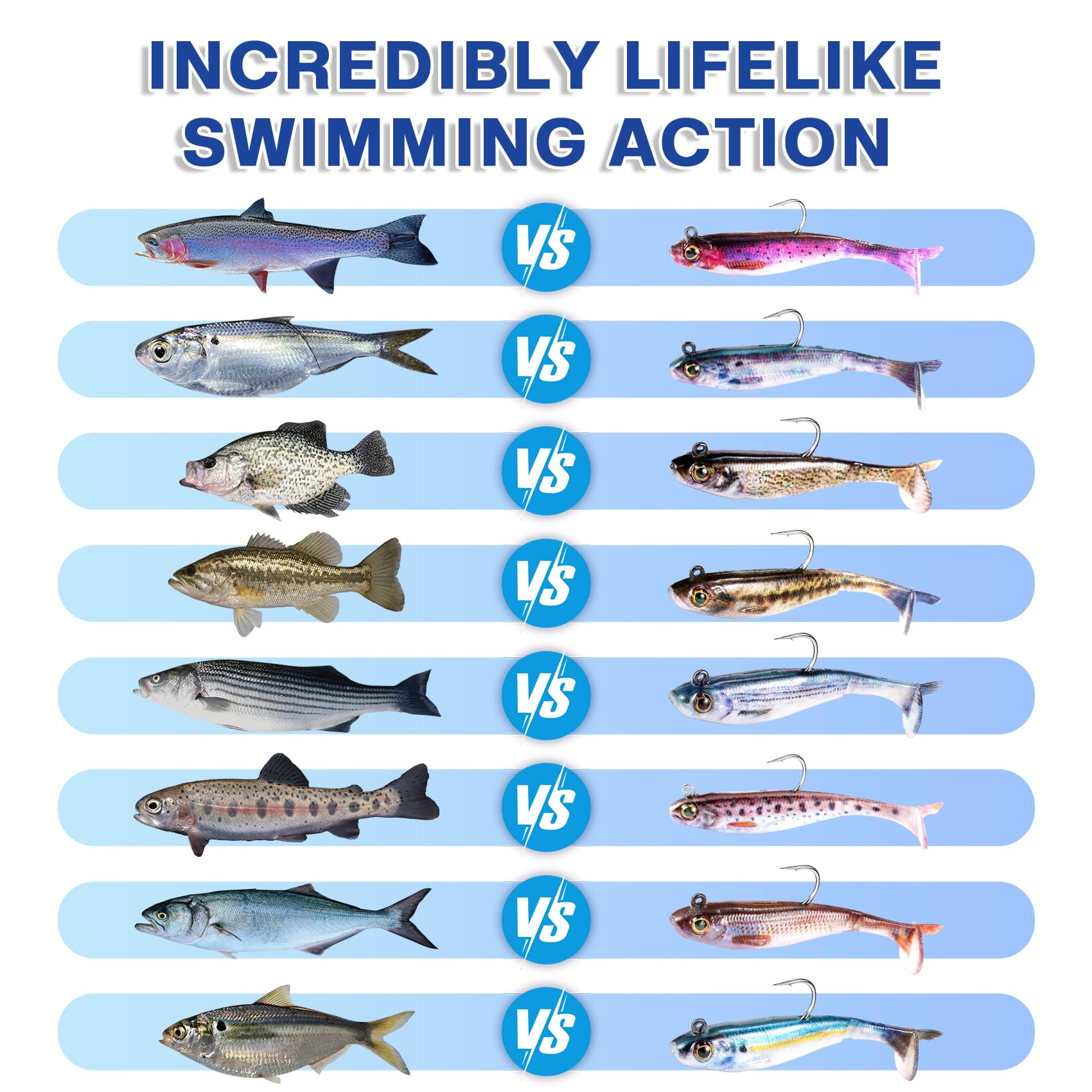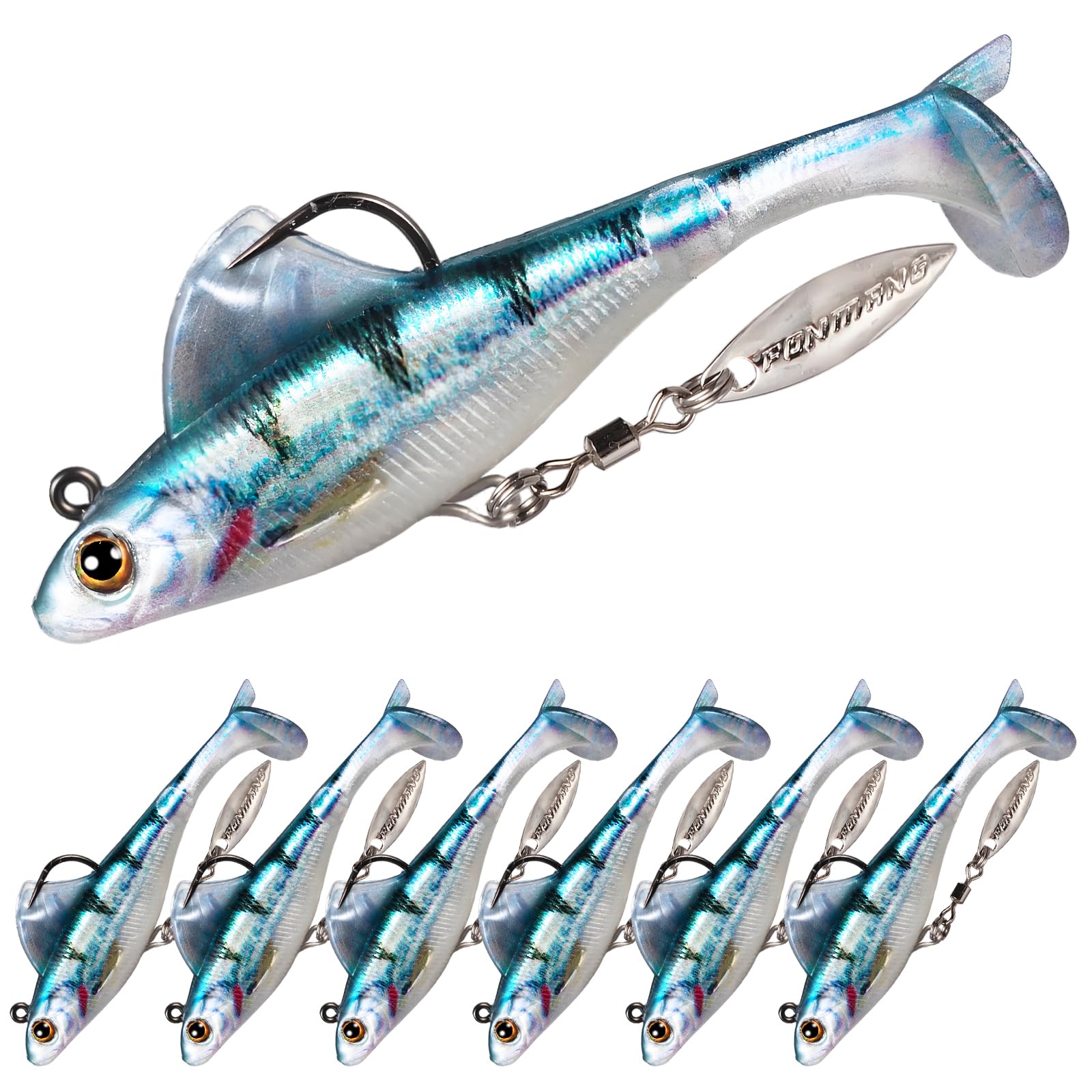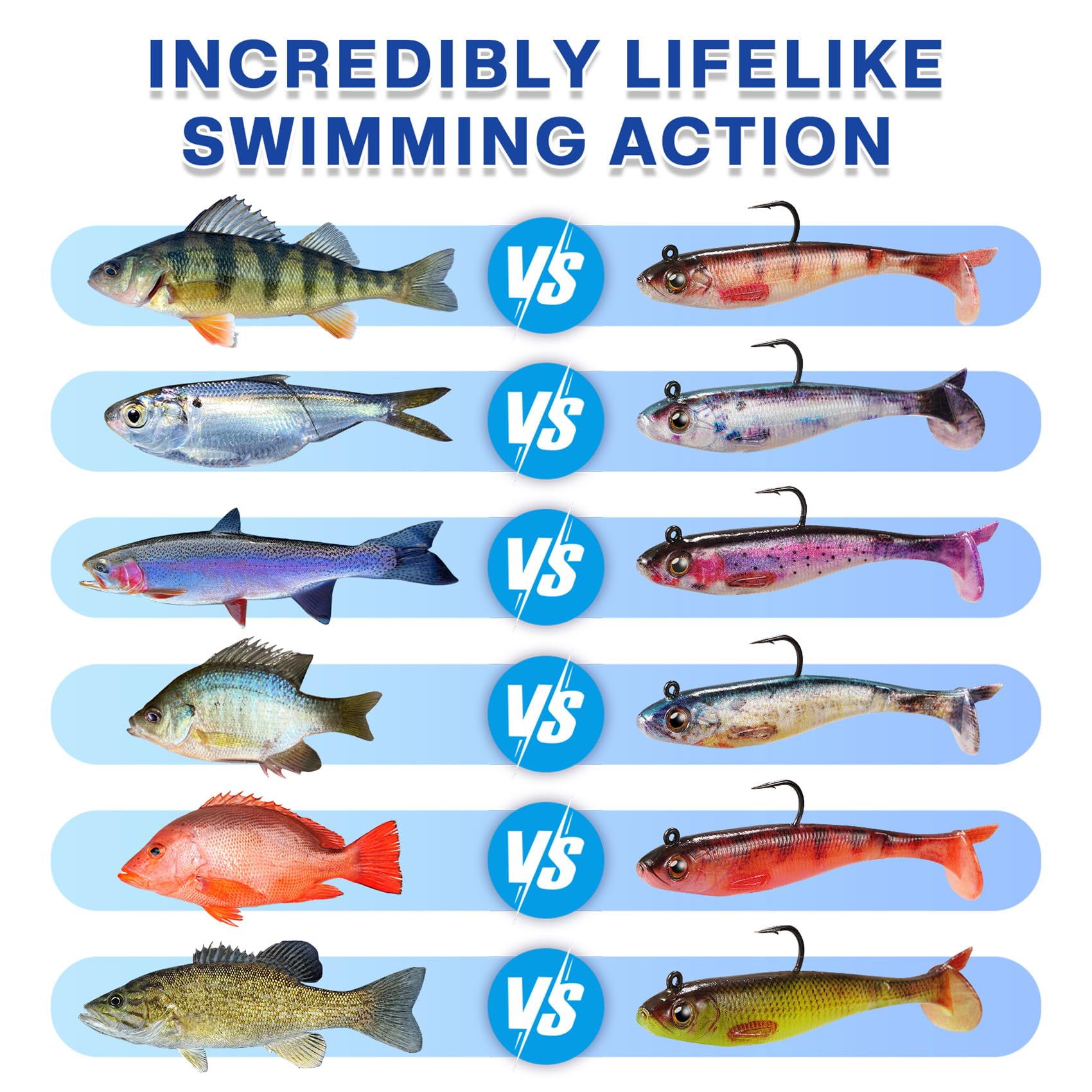 - METICULOUSLY DESIGNED SWIMBAITS - The soft plastic lures features a sharp and durable Mustad 1# jig hook and is equipped with ideal weight and balance. It also features a flat belly so when paused, the tail will stand up, making it more enticing for fish to bite