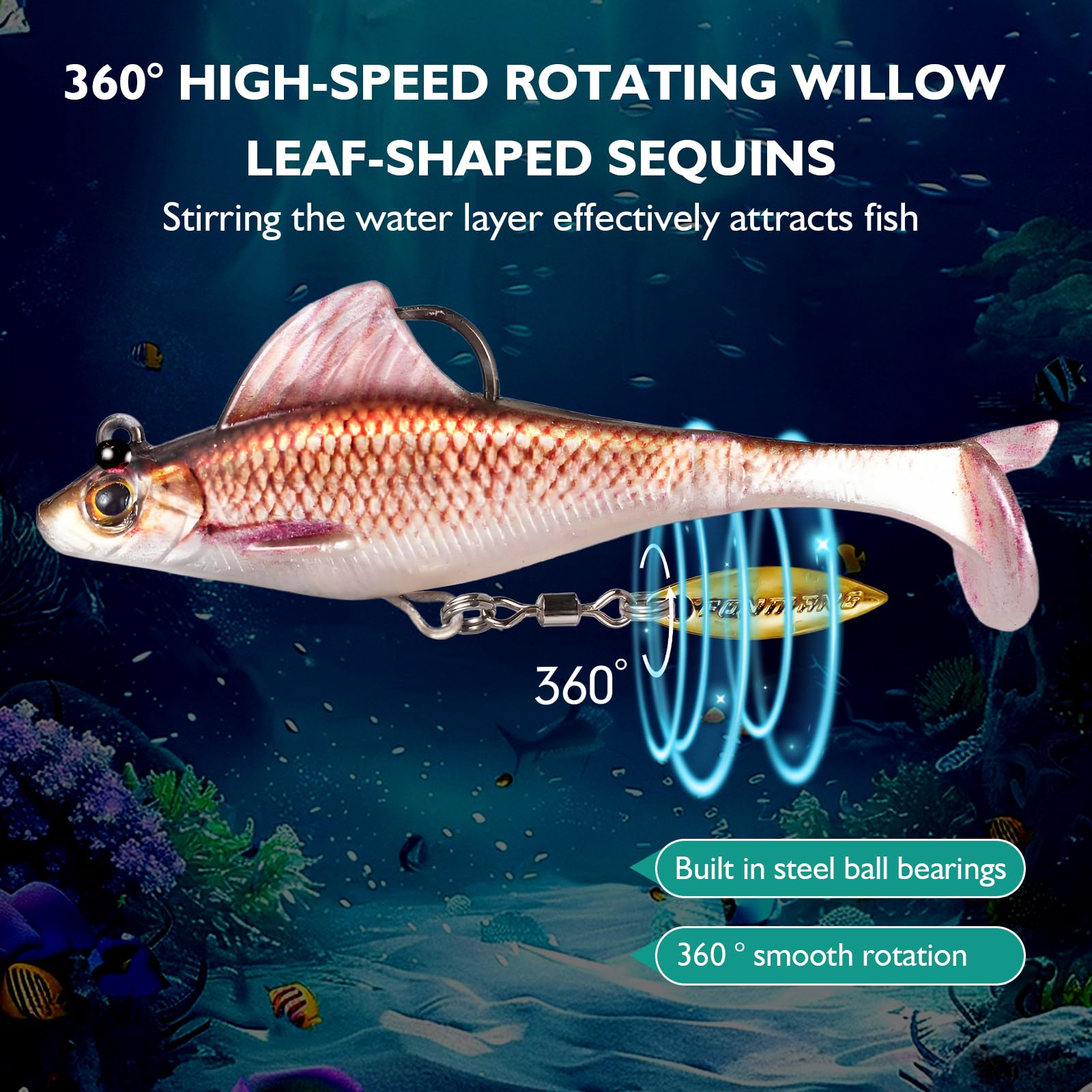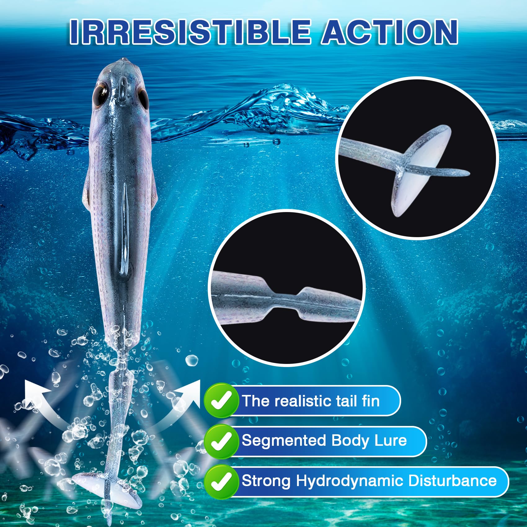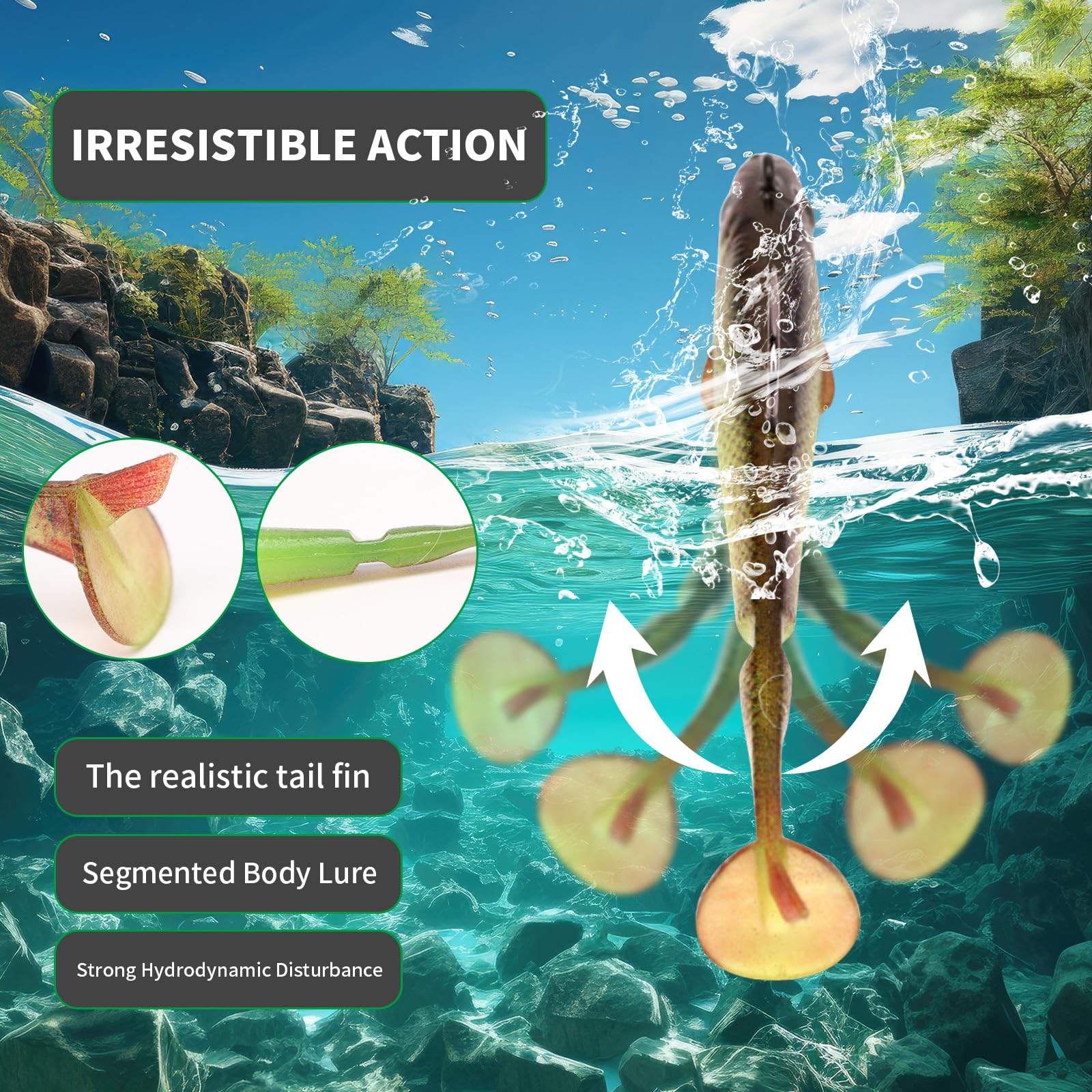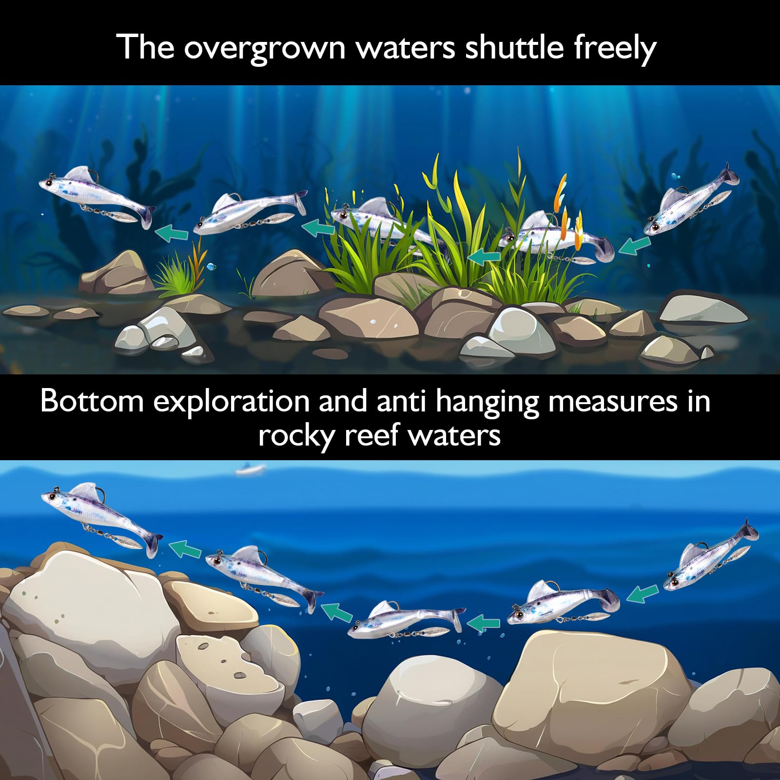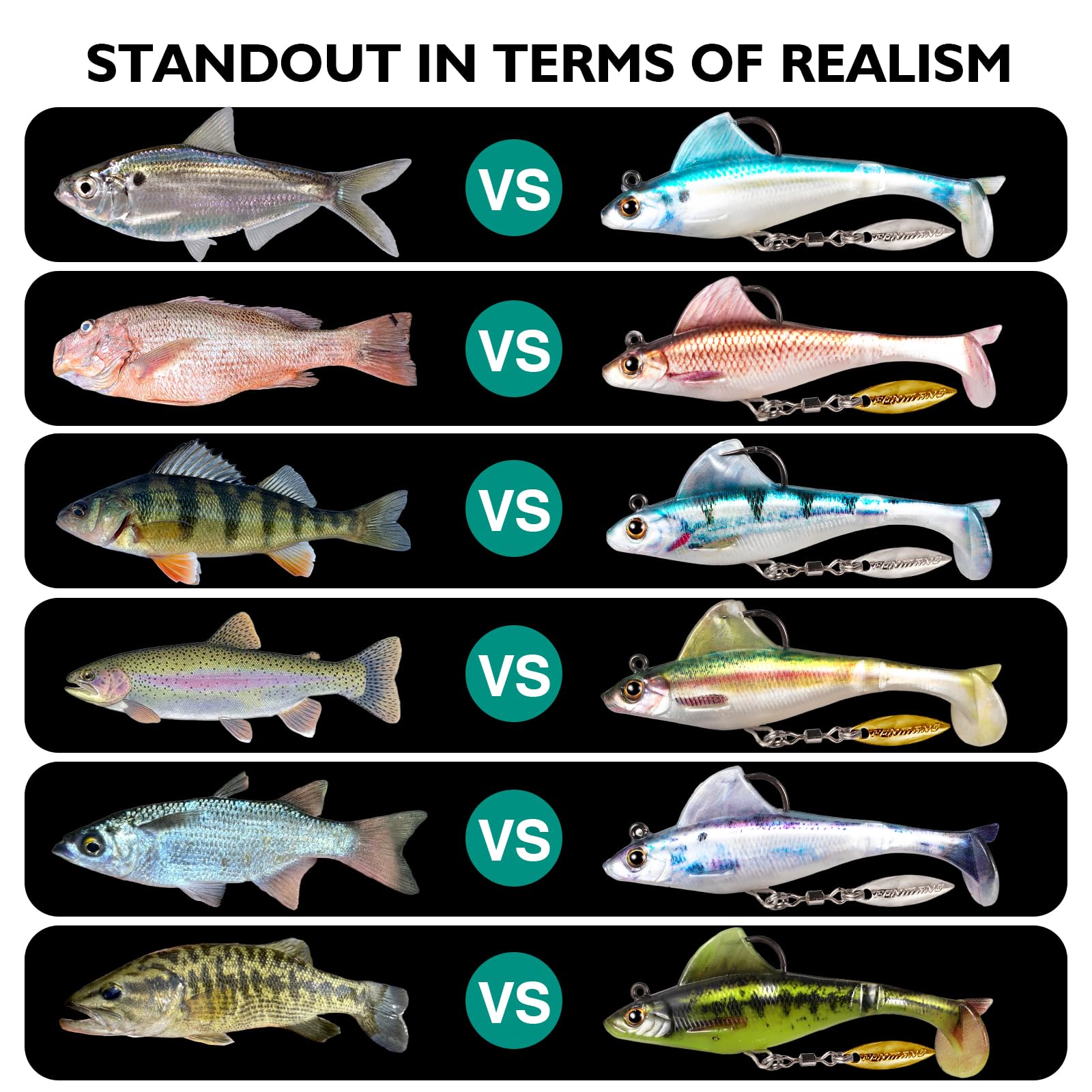 - ENHANCED SWIMMING ACTIONS - Featuring segmented bodies and an additional fin on the tail that responds to slow retrieves, the FONMANG Swimbait lures can be smoothly maneuvered along the bottom to create a subtle disturbance. When positioned higher in the water column and retrieved faster, these fishing lures showcase a robust tail kick and a hint of body roll, showcasing their intricate details across a broad area