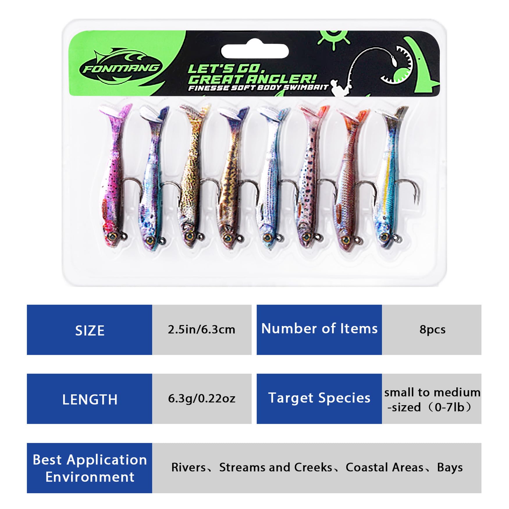 - The FONMANG 2.5-inch soft plastic paddle tail swimbait is primarily suited for small to medium-sized fish weighing 0-7 lbs, such as Smallmouth Bass, Trout, and Bluegill, as well as for a wide range of other fish species found in rivers, streams, creeks, coastal areas, and bays.