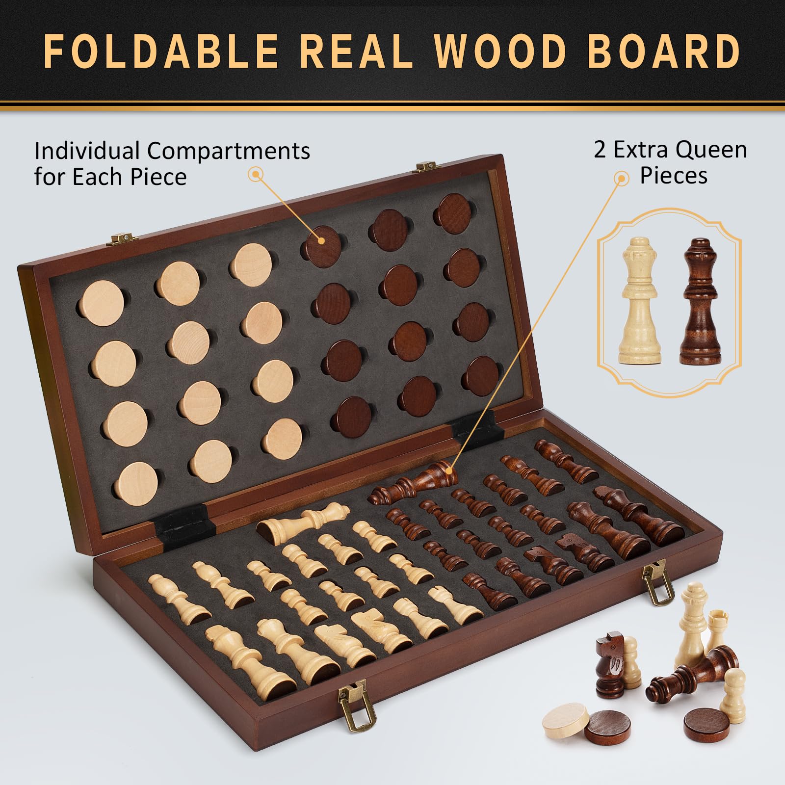 2 in 1 Magnetic Wooden Chess and Checkers Board Game Set, 15" Folding Chess Boards with 2 Extra Queens, Portable Travel Chess Sets with Pieces Storage Slots, Beginner Chess Game Set for Kids, Adults