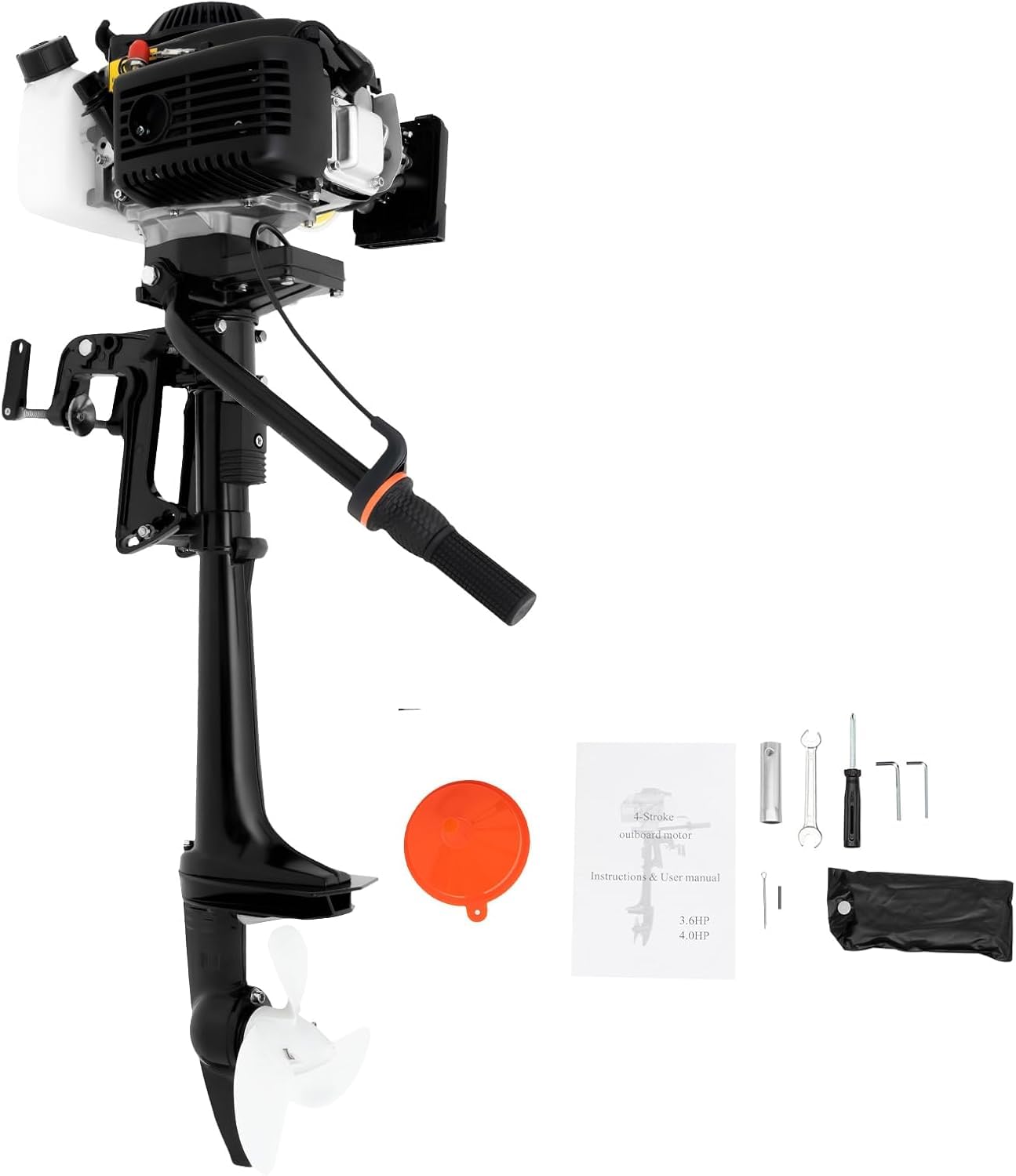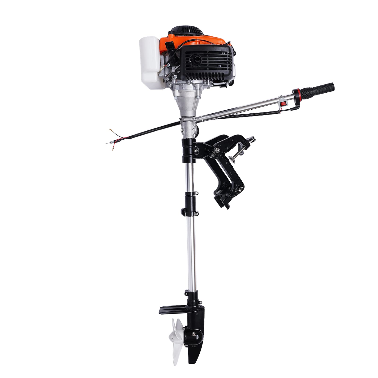 - 2-stroke 3.5HP Outboard Motor:2-stroke engine with a maximum output of 2.5kW and 3.5hp, and a maximum speed of 5000rpm, provides you with unparalleled speed. The streamlined design of a 6.7'' three-blade propeller can reduce water resistance and provide stronger power during operation.