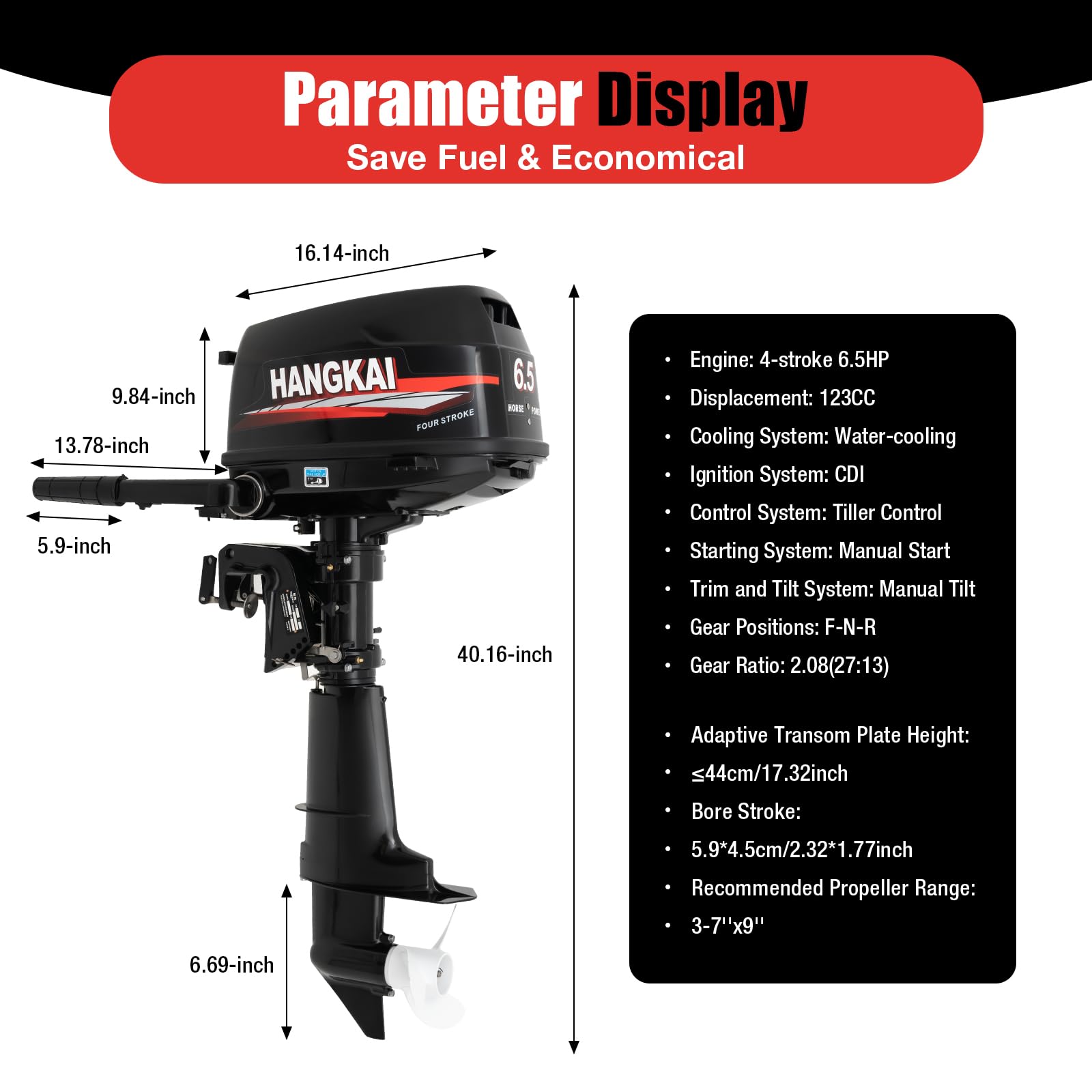 As an outboard motor, it is relatively small(35.4*15*7in) and lightweight(21.6lbs), making it very suitable for small ships and people who frequently navigate short distances. An efficient carburetor burns fuel more fully, with a fuel consumption rate of 0.3 gal/h not only saving fuel but also reducing expenses.
