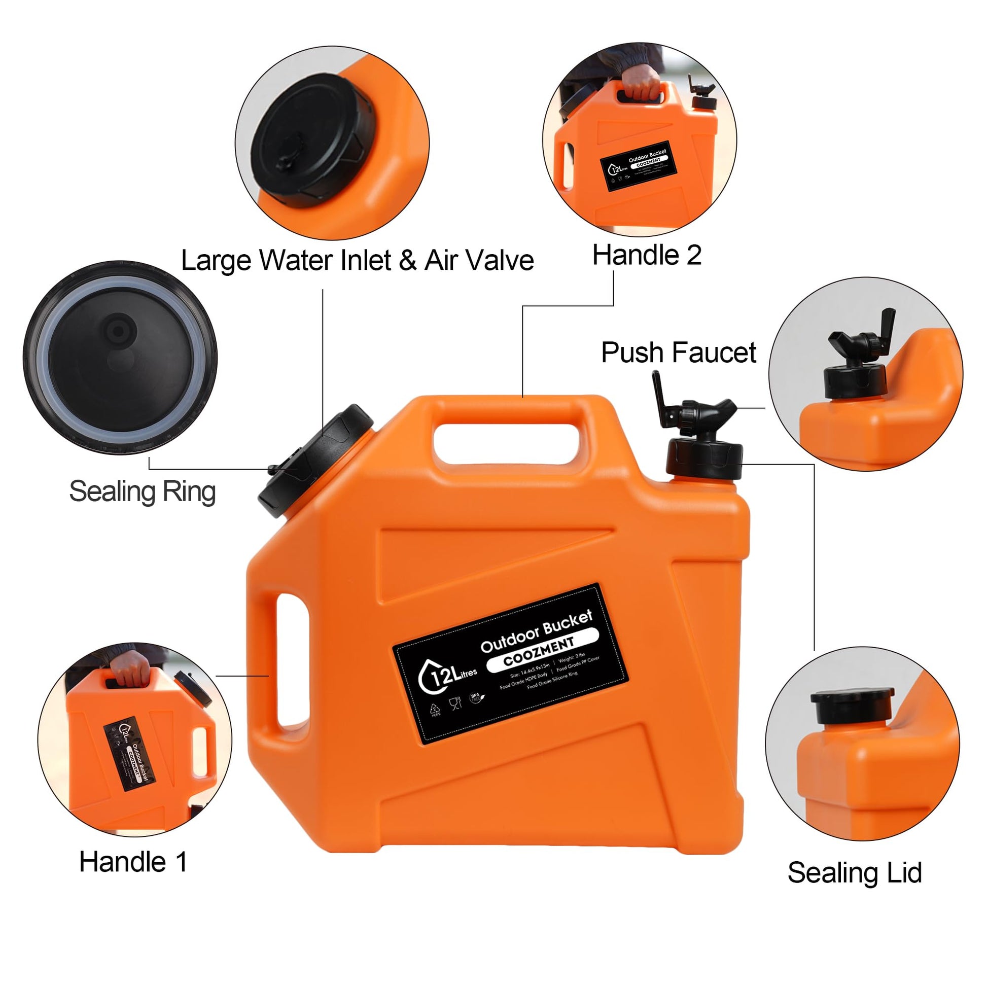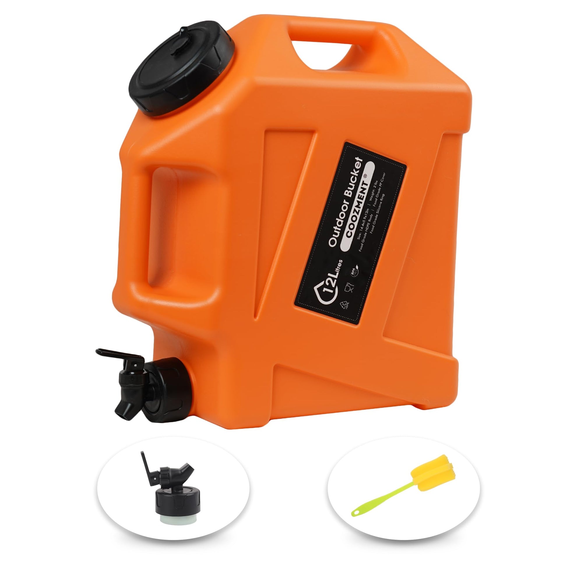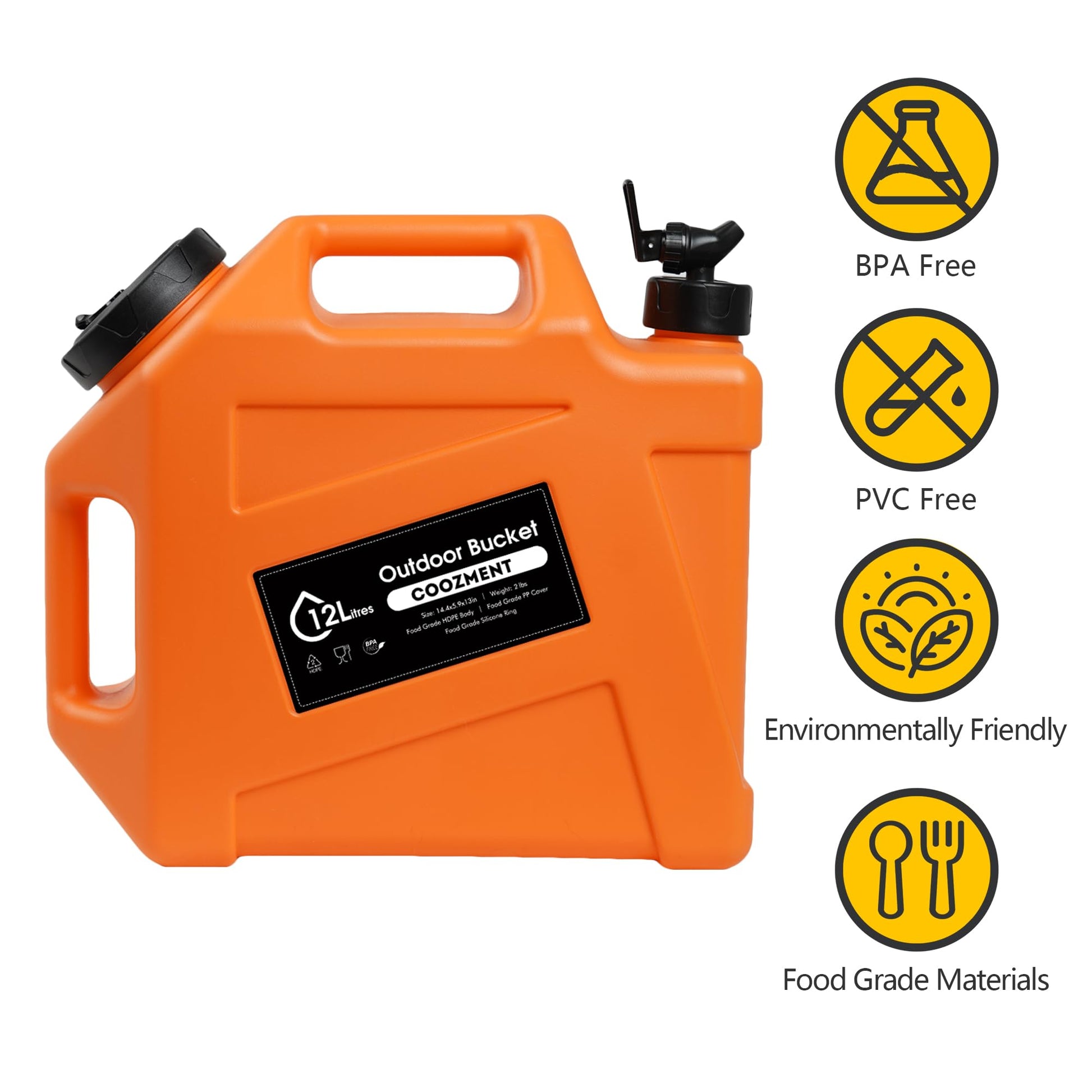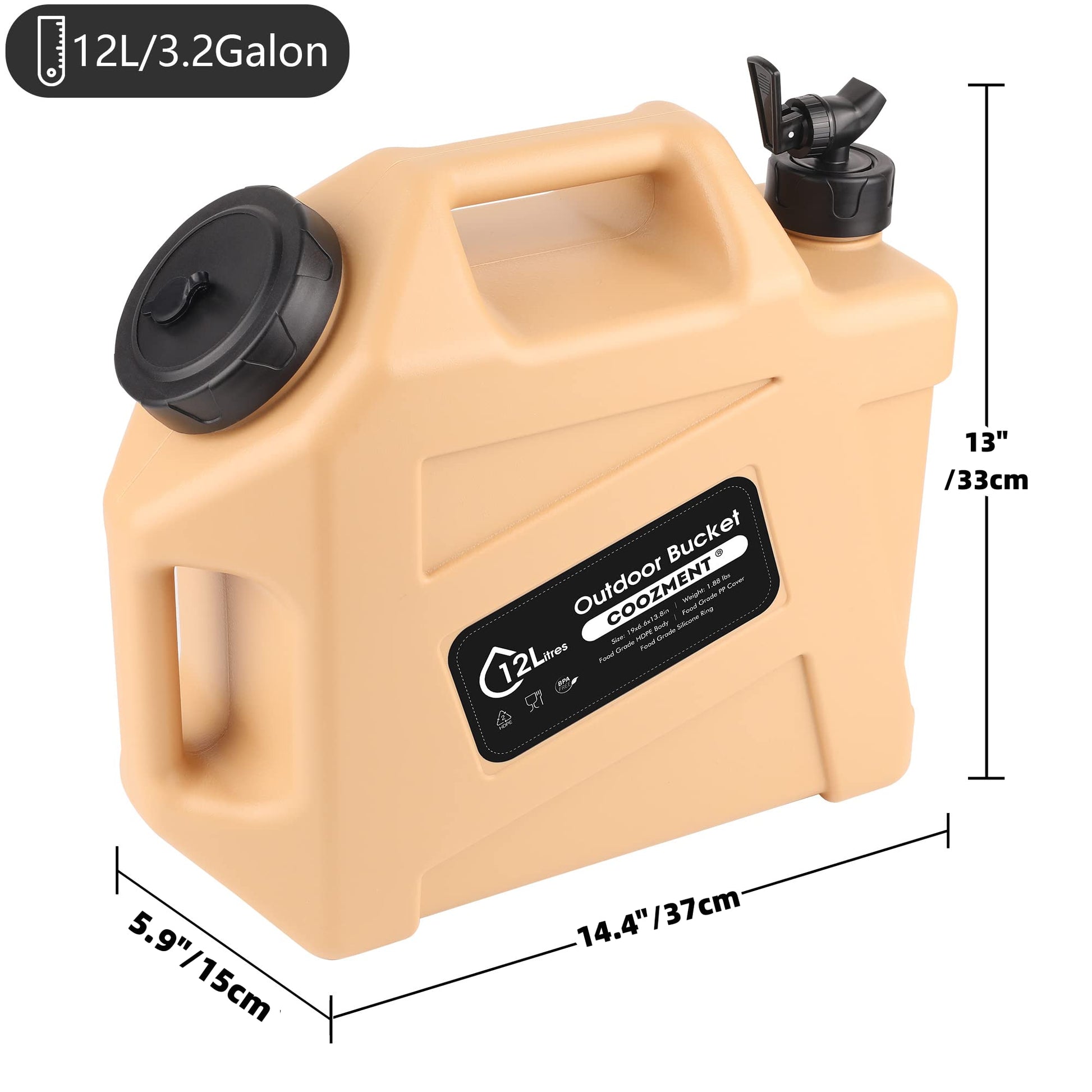This portable outdoor water storage containers has a capacity of 12L and dimensions of 14.4" x 13" x 5.9", making it very suitable for outdoor activities such as camping and hiking. The water bottle is made of food grade PE material, and the food grade PP lid has excellent sealing performance and is free of BPA and PVC, which will not affect the taste of water and drinks.