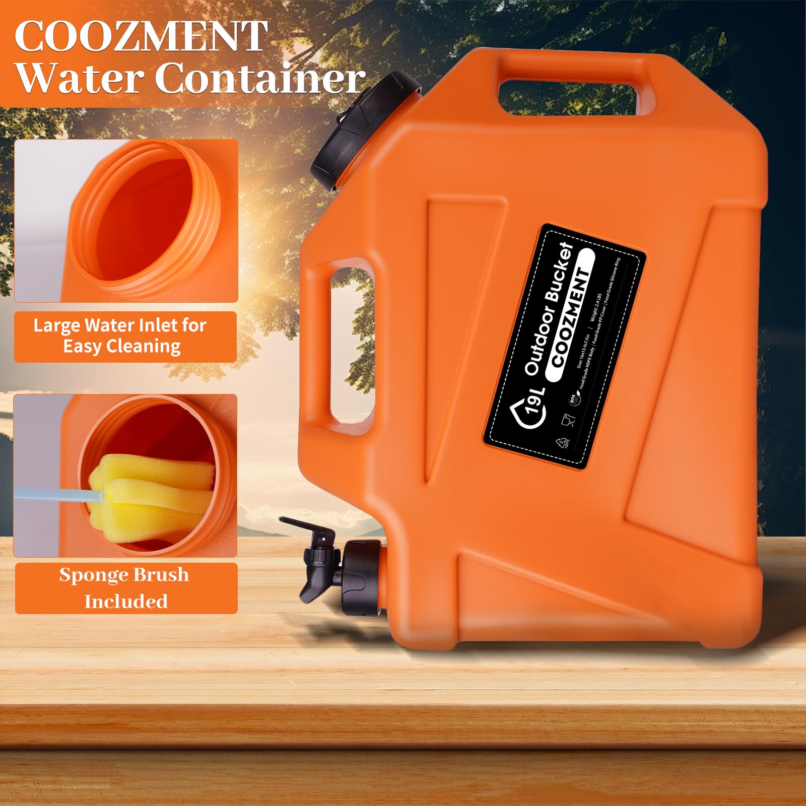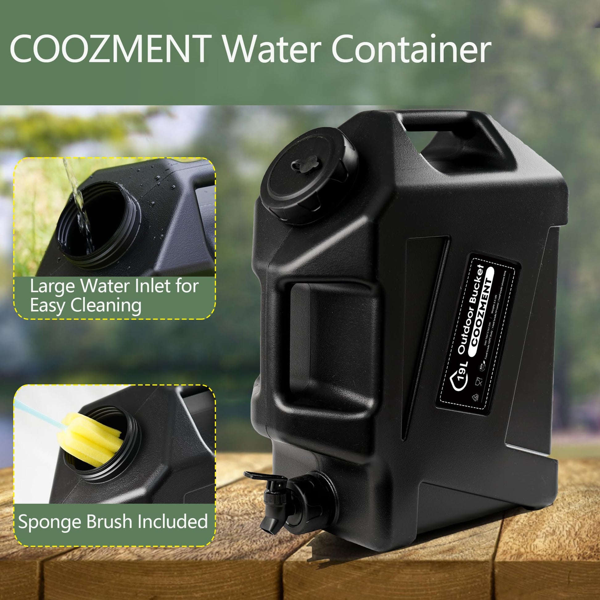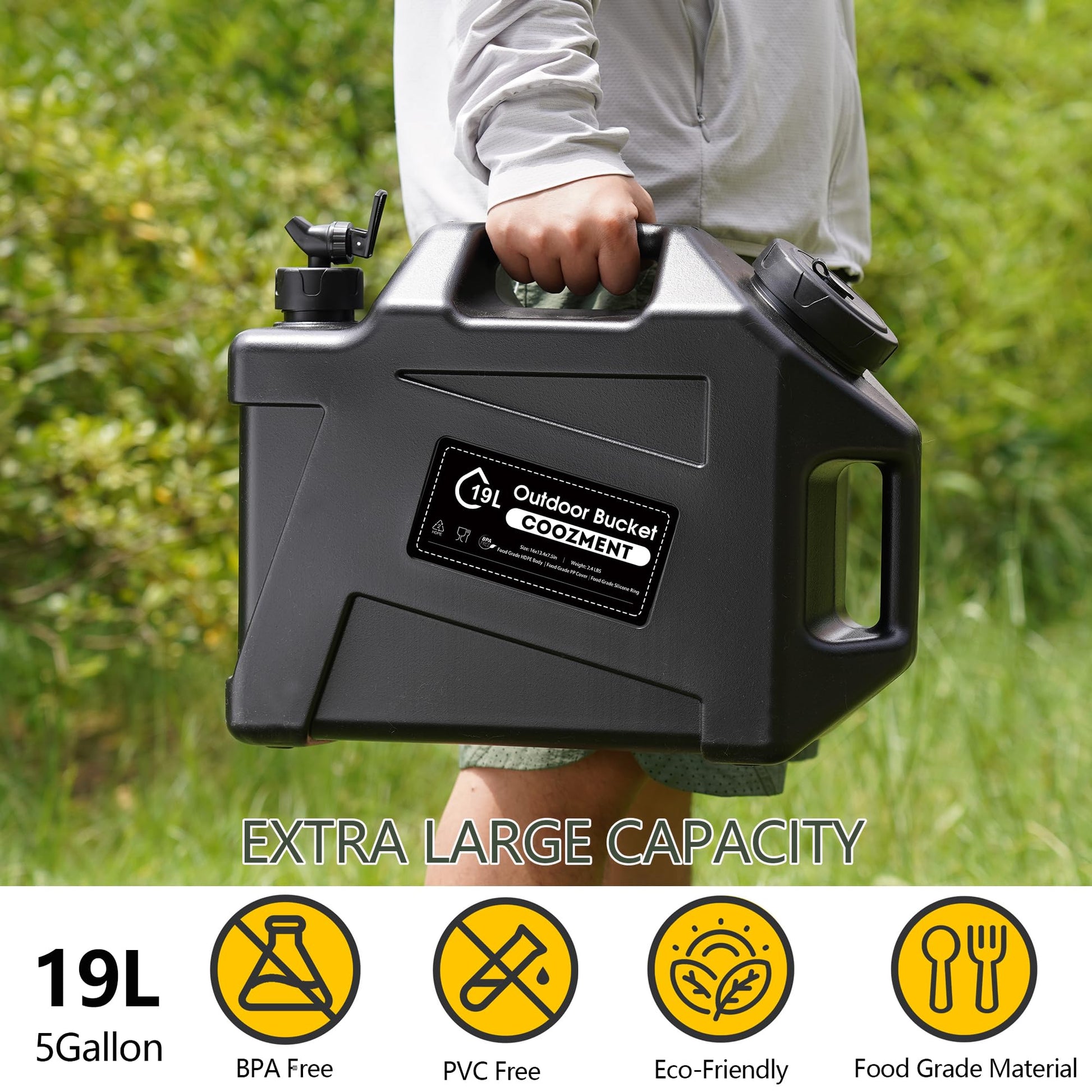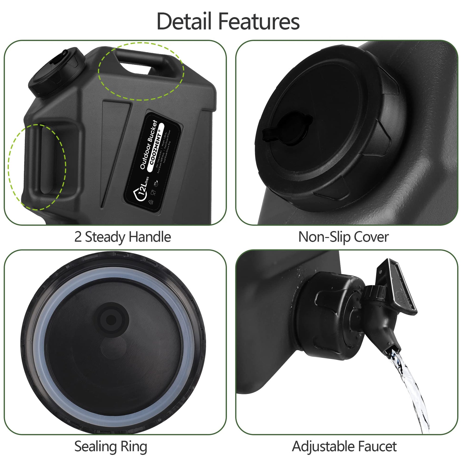 This portable outdoor water storage containers has a capacity of 12L and dimensions of 14.4" x 13" x 5.9", making it very suitable for outdoor activities such as camping and hiking. The water bottle is made of food grade PE material, and the food grade PP lid has excellent sealing performance and is free of BPA and PVC, which will not affect the taste of water and drinks.