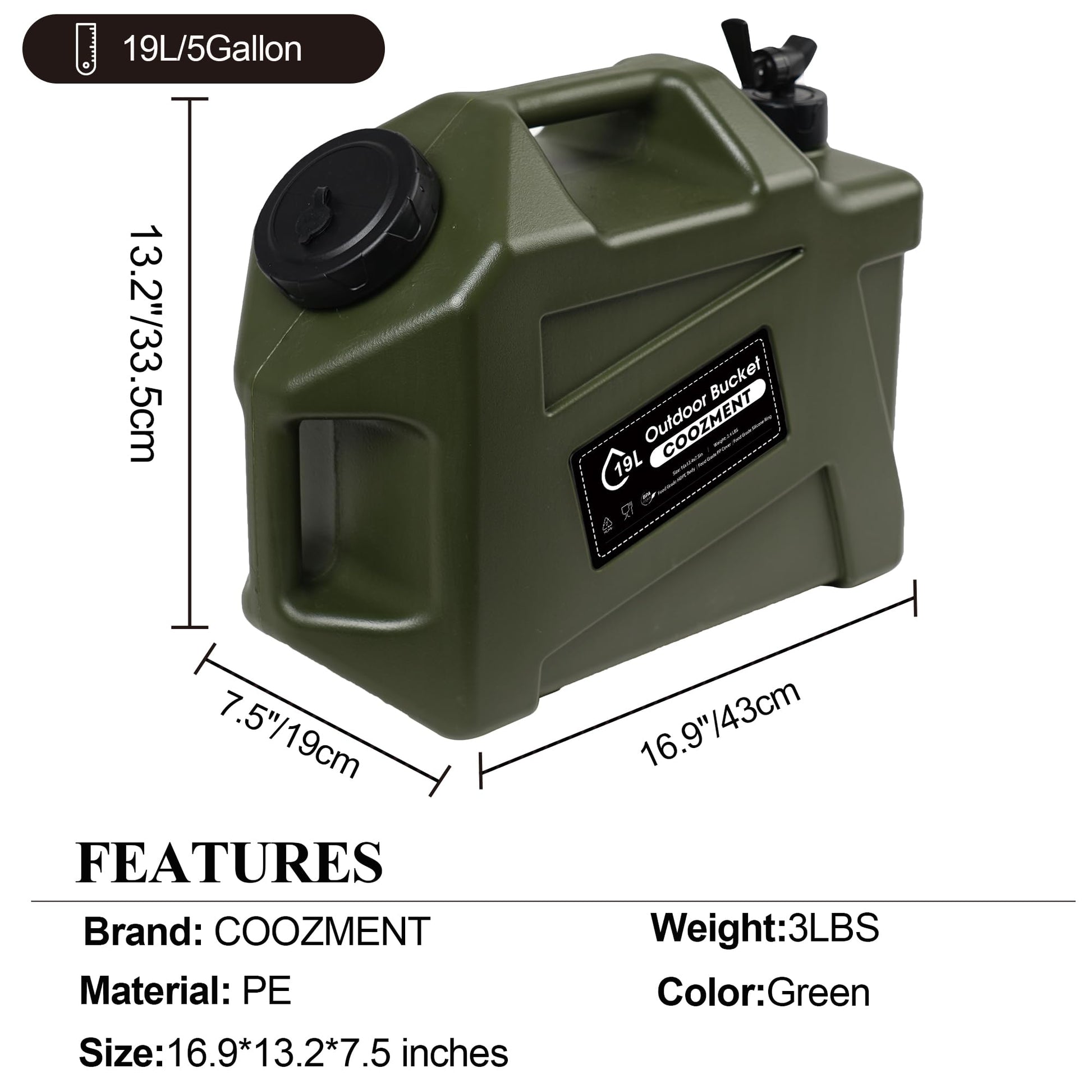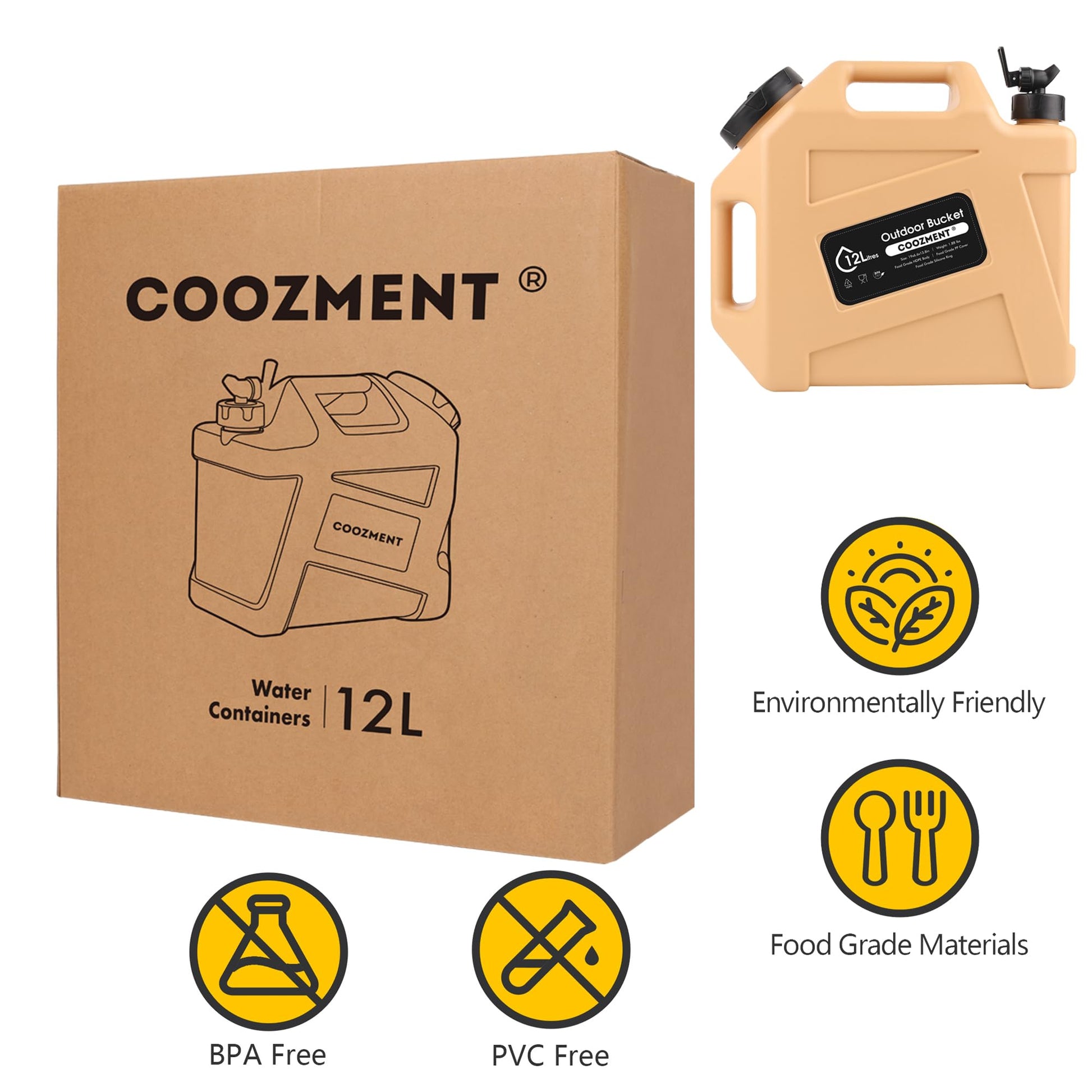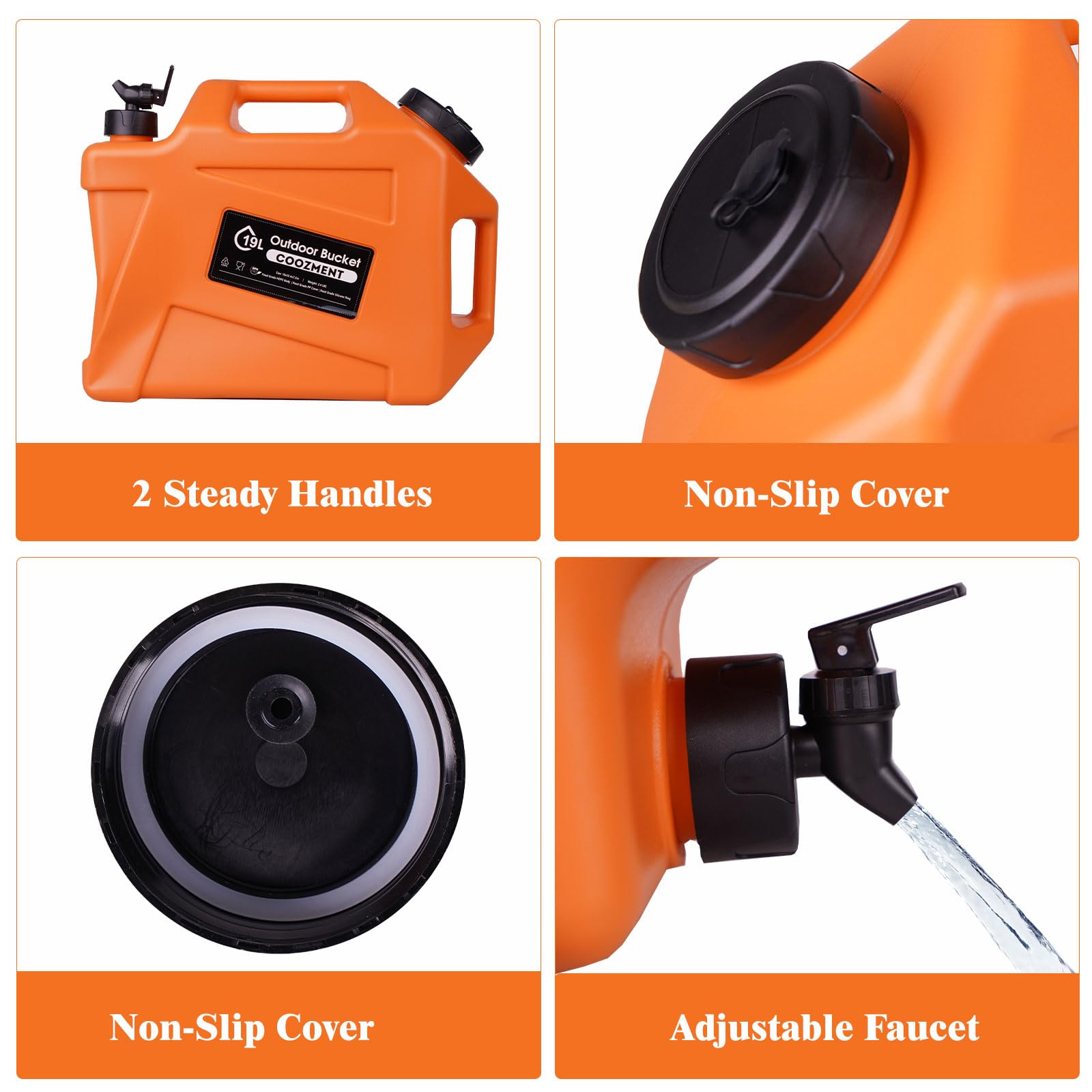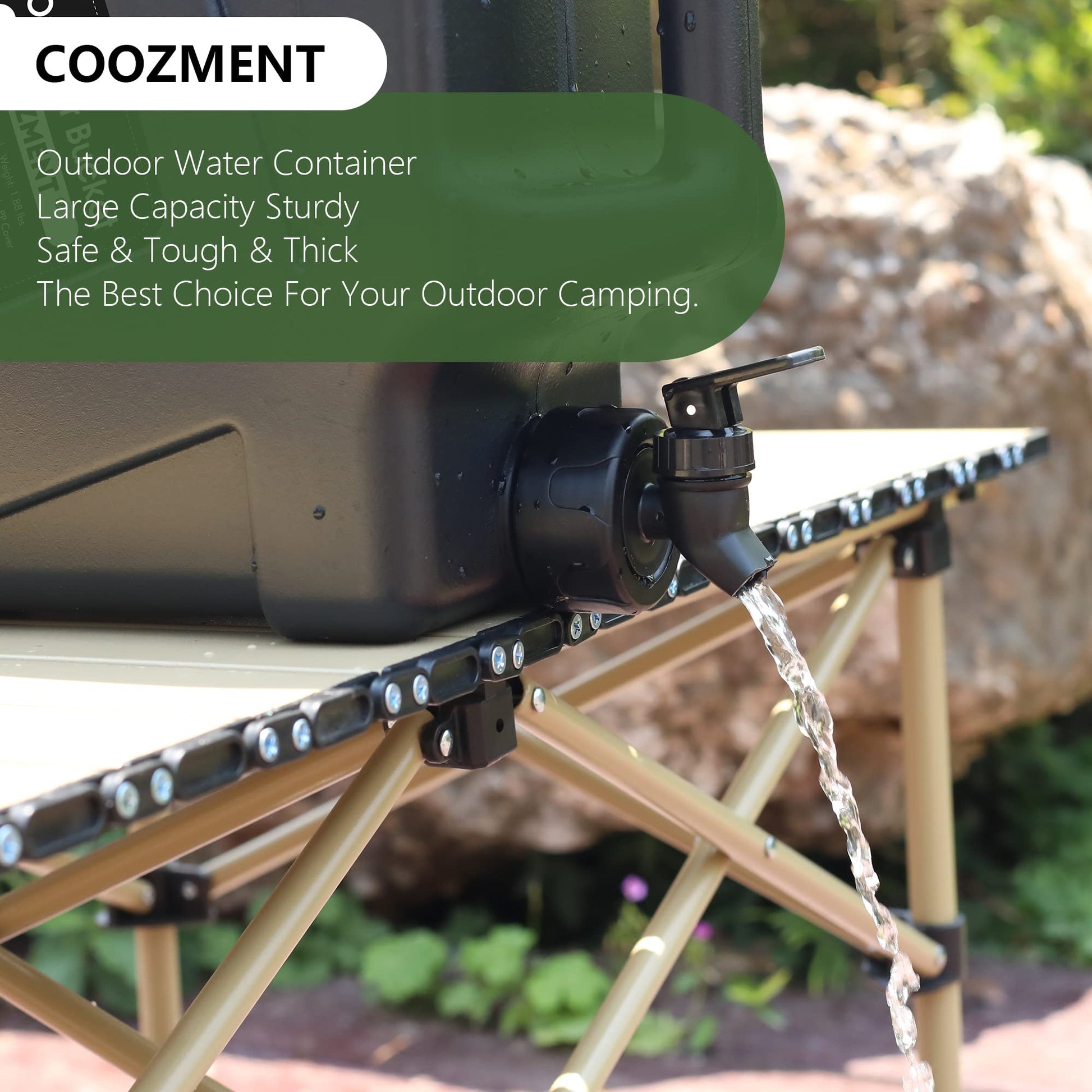 This portable outdoor water storage containers has a capacity of 12L and dimensions of 14.4" x 13" x 5.9", making it very suitable for outdoor activities such as camping and hiking. The water bottle is made of food grade PE material, and the food grade PP lid has excellent sealing performance and is free of BPA and PVC, which will not affect the taste of water and drinks.