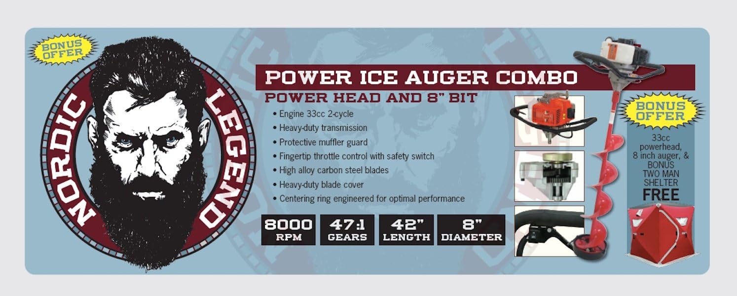 The Nordic Legend B33 Powerhead features heat treated gears at a 47:1 gear ratio so you cut fast, but NEVER bog down. The two man shelter has extra heavy duty fiberglass rods that are solid, not hollow! The shelter features 300 denier fabric with a superior black out coating that keeps the light outside! The package comes with six ice anchors, shelter carry bag, 33cc powerhead, 8 inch auger, and ice blade cover.