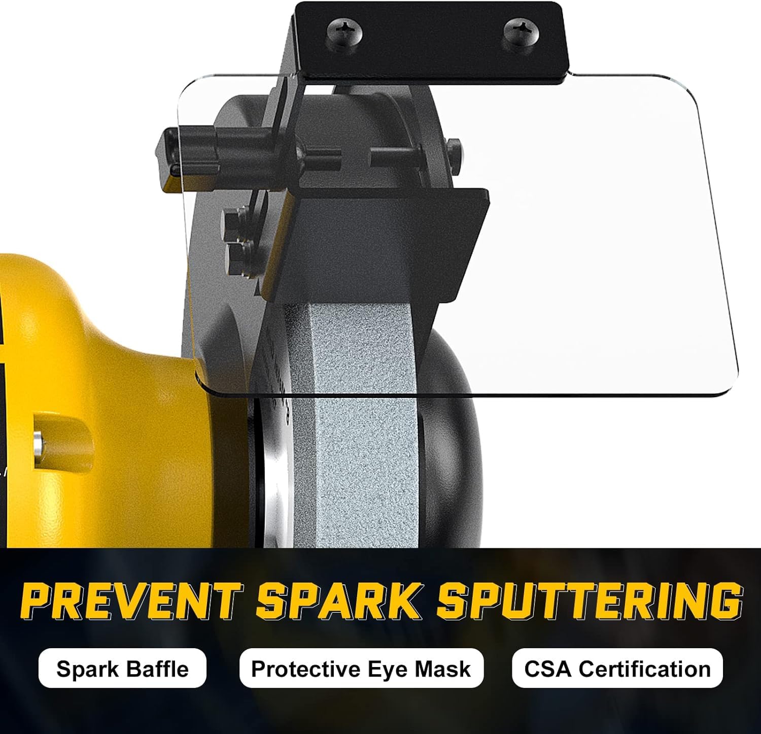 - SECURITY FUNCTION: The bench grinder equipped with transparent eye shield to prevent damage to your eyes, and the spark arrestor can effectively block most of the sparks generated during grinding