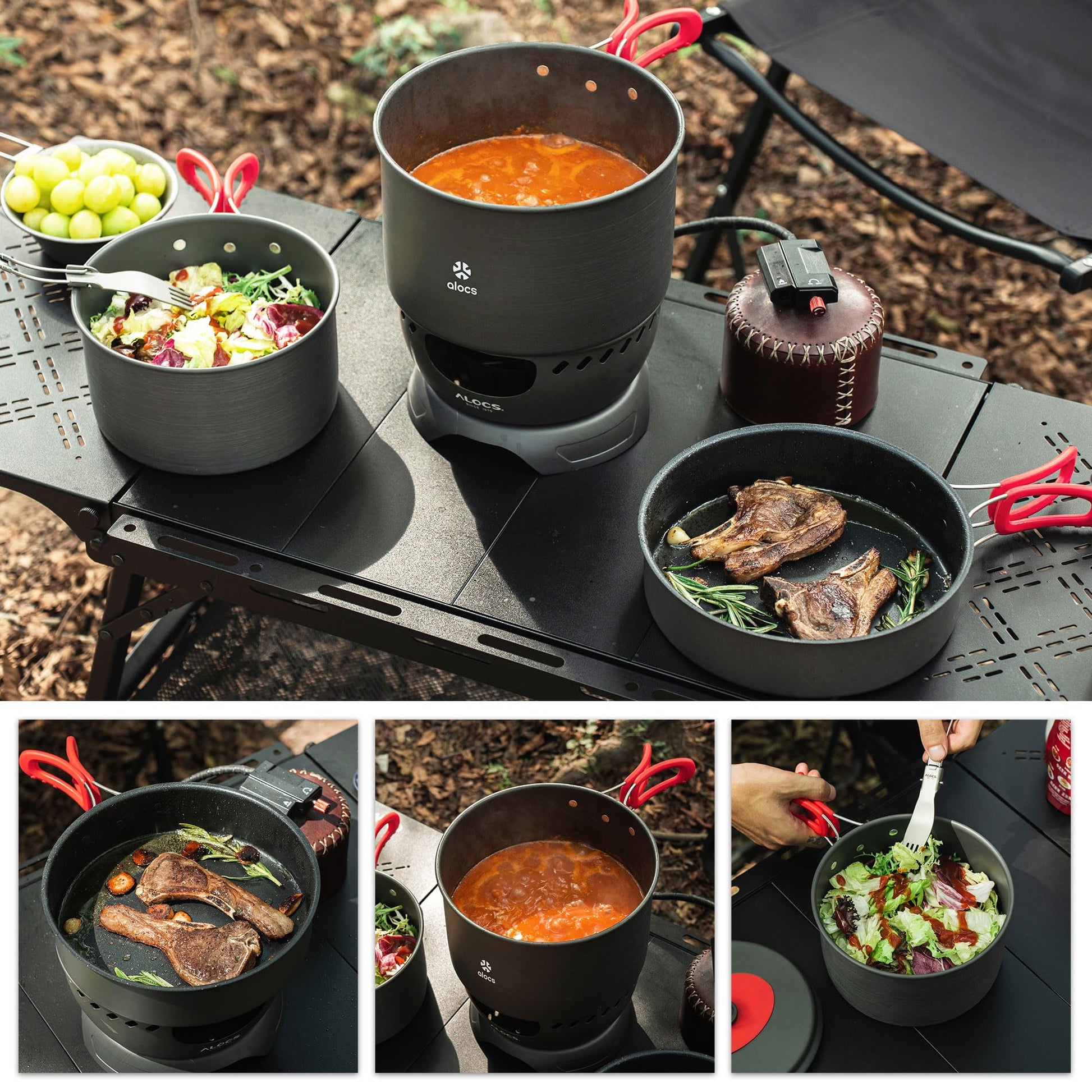 - Widely Application: Alocs camping utensil set comes equipped with all of your kitchen essentials, offering an ideal solution for boiling water and cooking food outdoors, Quick heat transfer save time and fuel, It is a good partner for camping cooking, picnic, hiking, party.