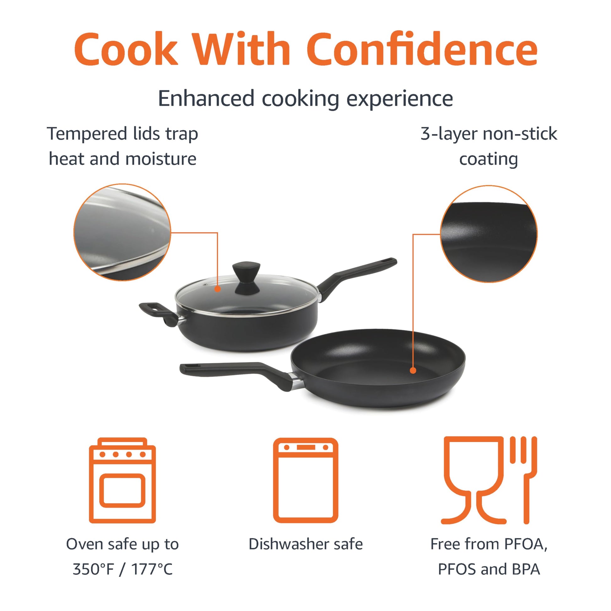 - Suitable for all stovetops except for induction, oven safe up to 350゜F (177℃) ; Pots, pans and lids are dishwasher safe.