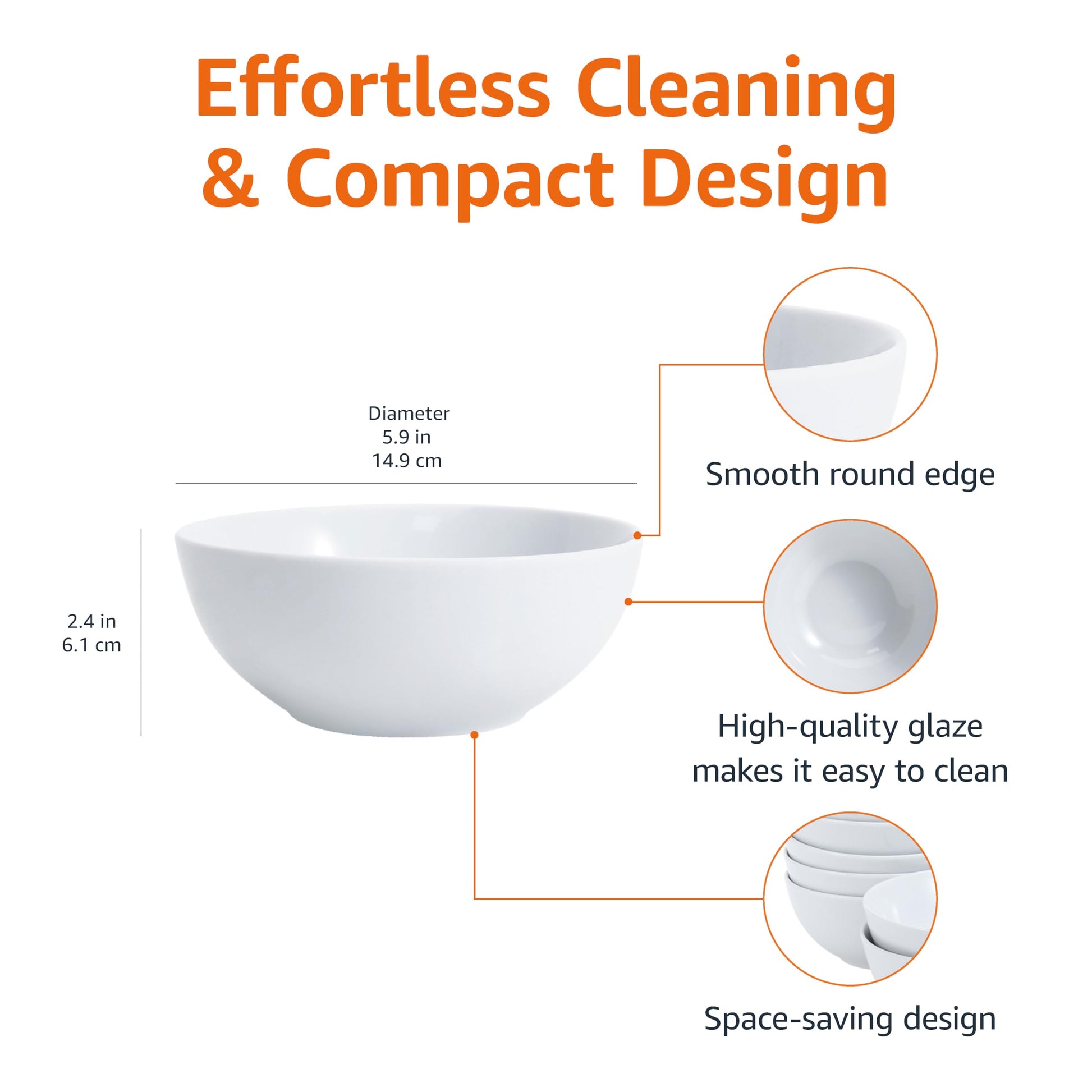 Amazon Basics 16-Pack White Porcelain Coupe Bowl, 5.9" diameter, Round, Microwave-safe, Commercial-grade
