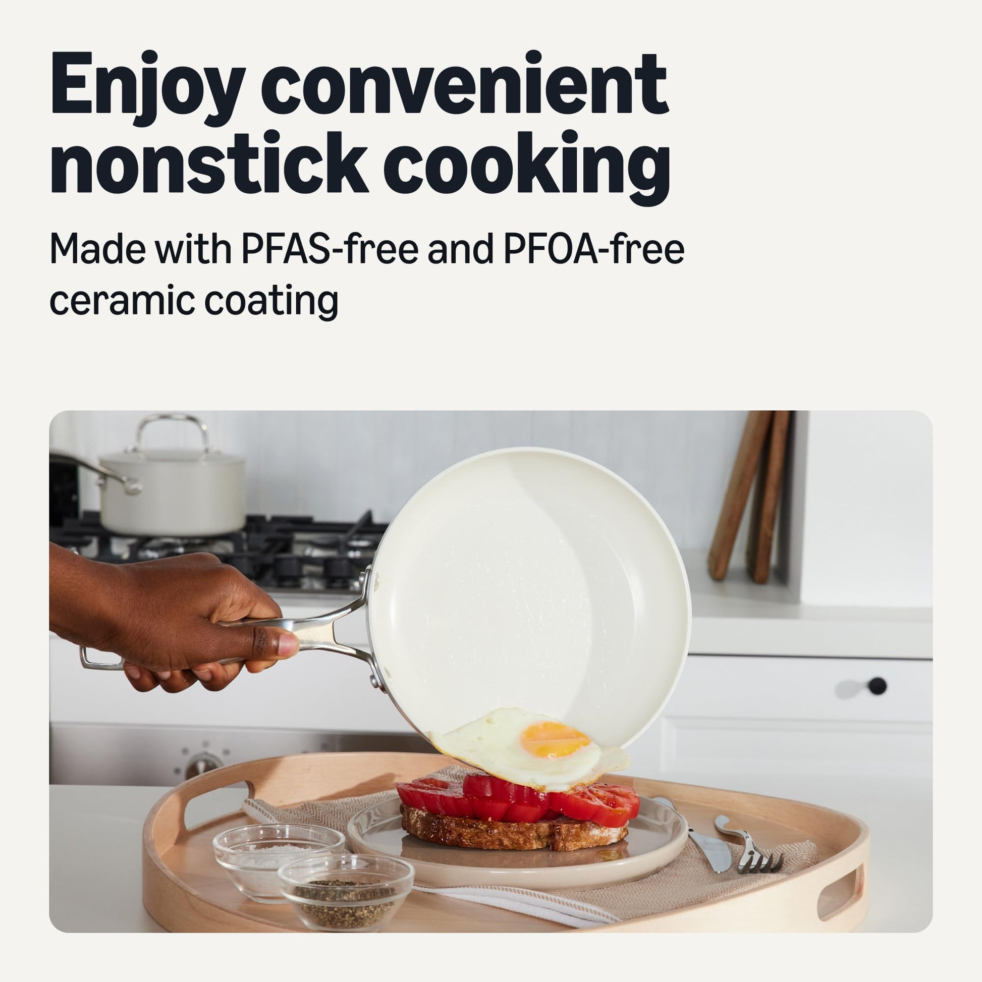 Amazon Basics Ceramic Nonstick Cookware, 3-Piece Set of Pans, All Cooktop Friendly, Dishwasher-Safe, Linen Gray