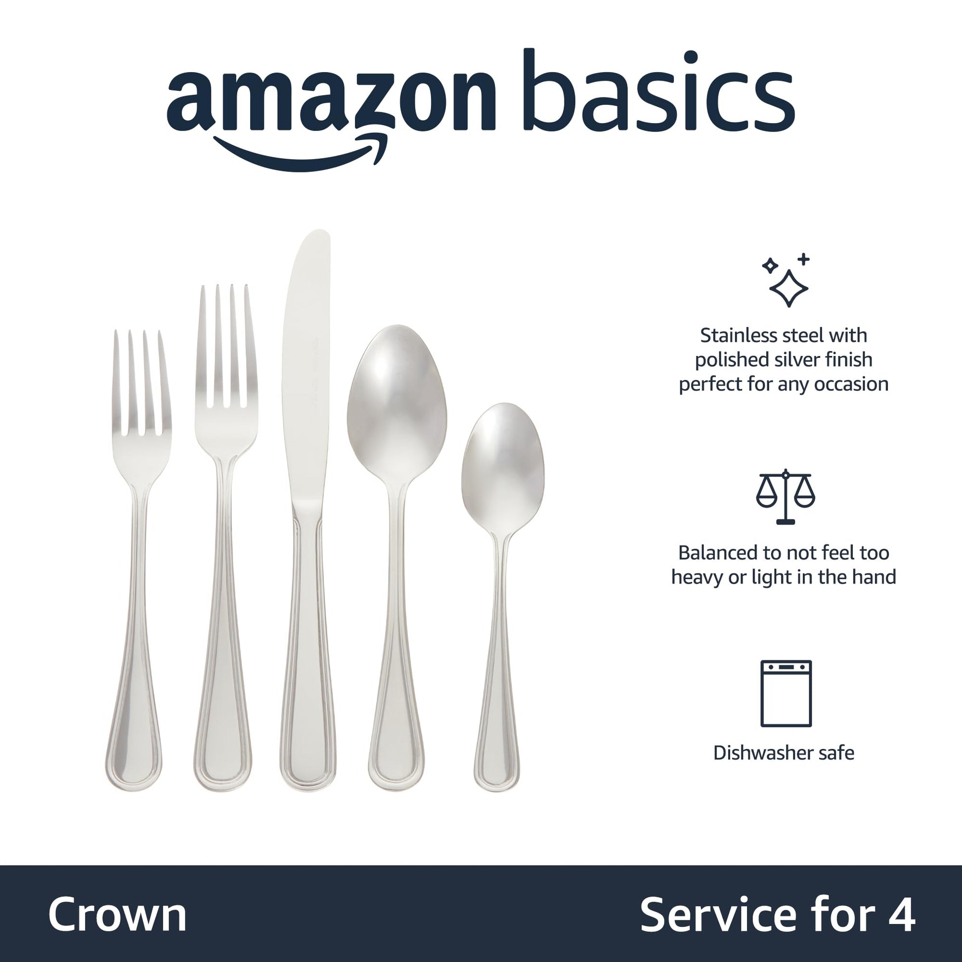 Amazon Basics Silverware Set, Stainless Steel Flatware, Dishwasher Safe, Service for 4, 20-Piece Forks and Spoons, Crown Edge