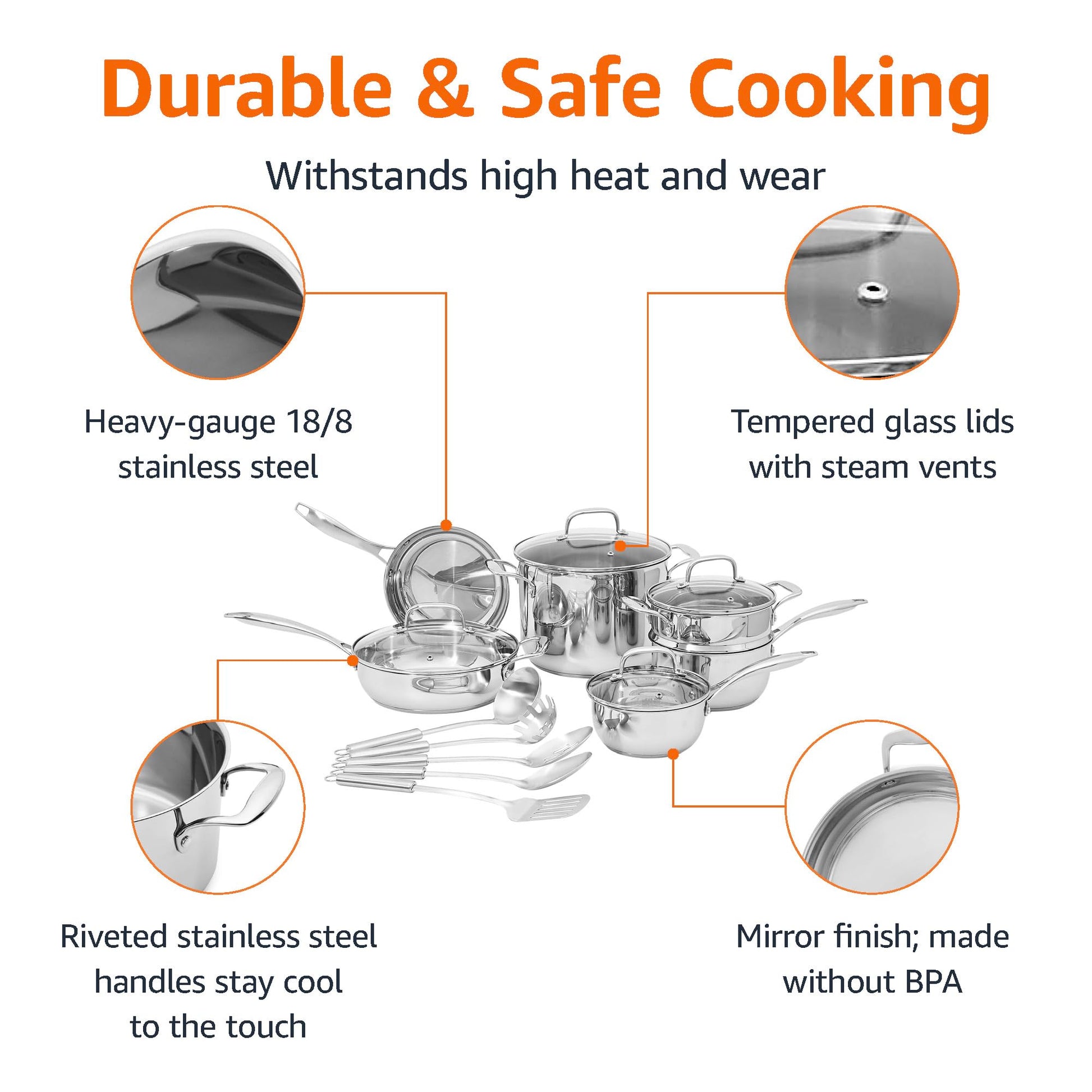 - Heavy-gauge 18/8 stainless steel pots, pans, and utensils; aluminum core pan bottoms distribute heat evenly and quickly; mirror finish; made without BPA