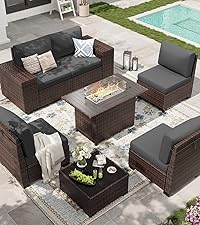 - 【DURABLE & LONG-TERM USING】The inner structure of outdoor sofa and table are made of solid steel, there is Strong and not easy to rust, and the outdoor patio set for Backyard Porch is so sturdy that every single patio couch can hold up to 350 pounds. The fabric of the Patio Set is made of polyester fiber, which does not fade or pills, and looks new even after long-term using. The sectional furniture is made of PE resin wicker, So that the set can remain intact in any harsh environment. The frame made of FSC-certified wood is more environmentally friendly.