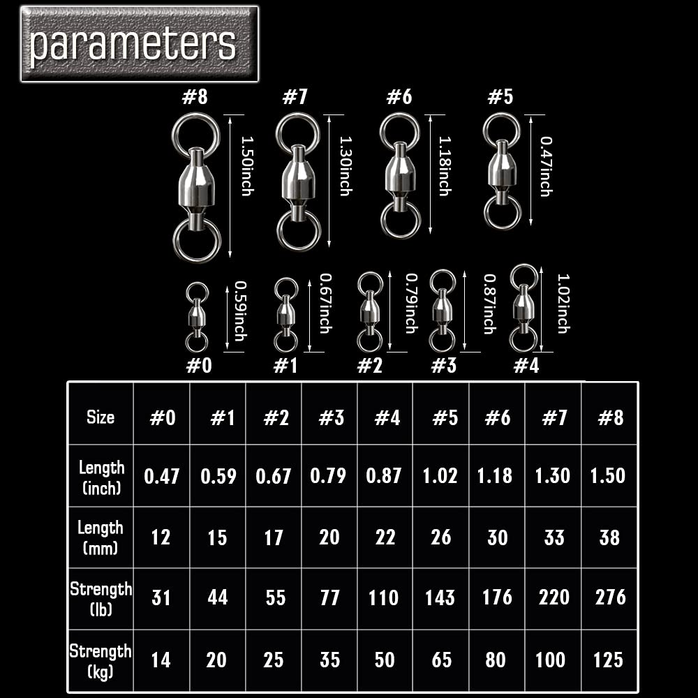AMYSPORTS Ball Bearing Swivels are made for high performance in fishing activities. Features of these fishing swivels such as corrosion resistance, abrasion resistance, shock resistance and tension,make it become popular with fishermen. There are ball bearings inside it to make sure more smoother and high speed rotation. Free rotation will make your fishing lures more attractive. The stainless steel and black nickel polished could prevent these from rusting in saltwater. You can freely use it in both saltwater or freshwater. The material keep it from rusting and breaking.You will never lose your connectors on it.