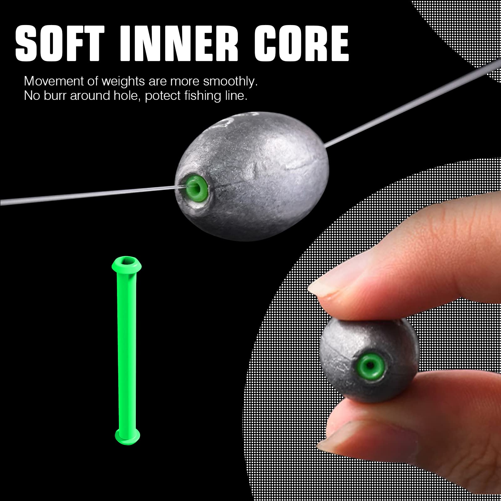 - Smooth Inner Surface Drop Sinkers:The inner with soft plastic core,it could protect your fishing line,make sure not cutting it or twist it.The line pass through the middle hole easily,it would keep the weight on it. The smooth surface outside help to reduce resistance in air and water,make it drop into water fastly,sinking without shocking fishes.