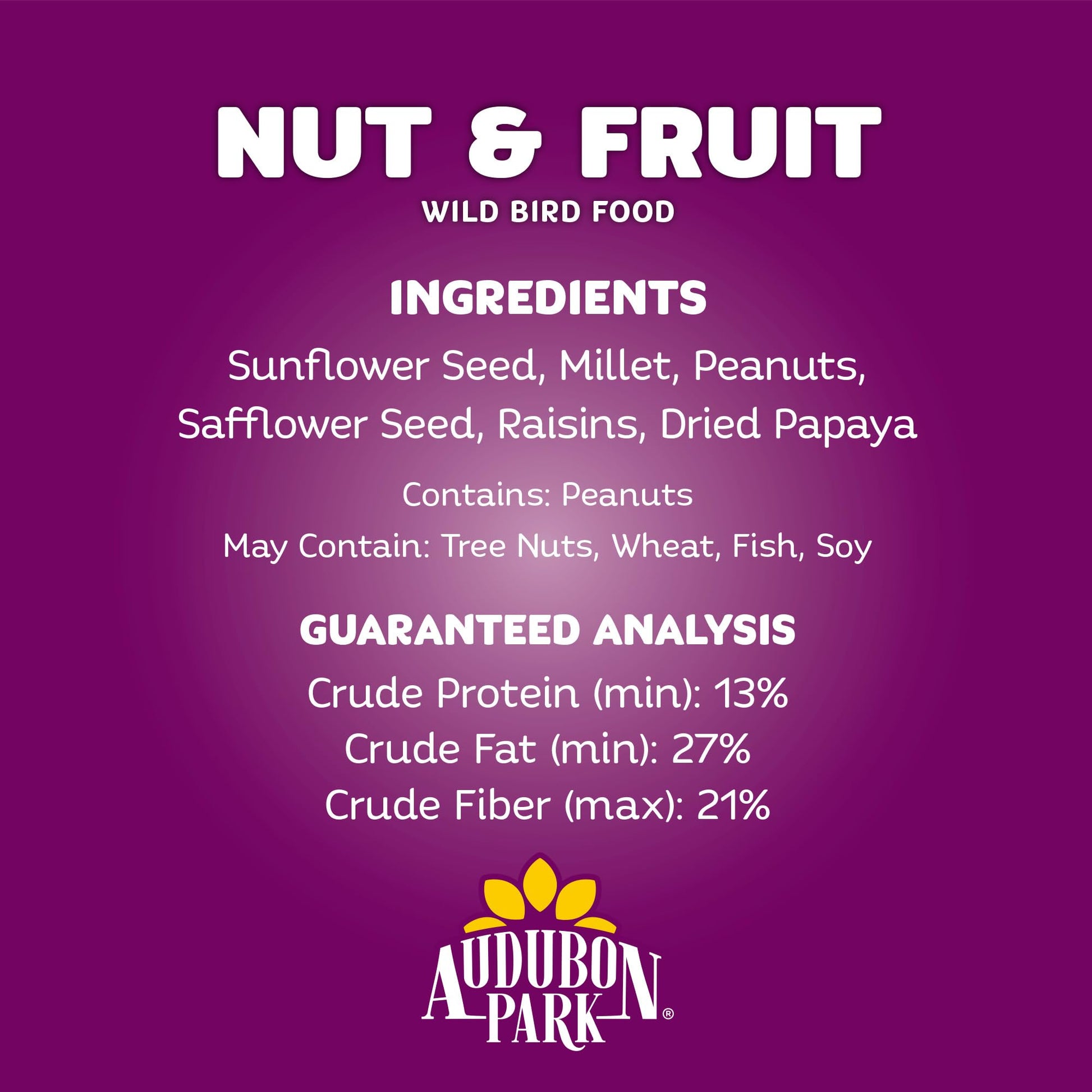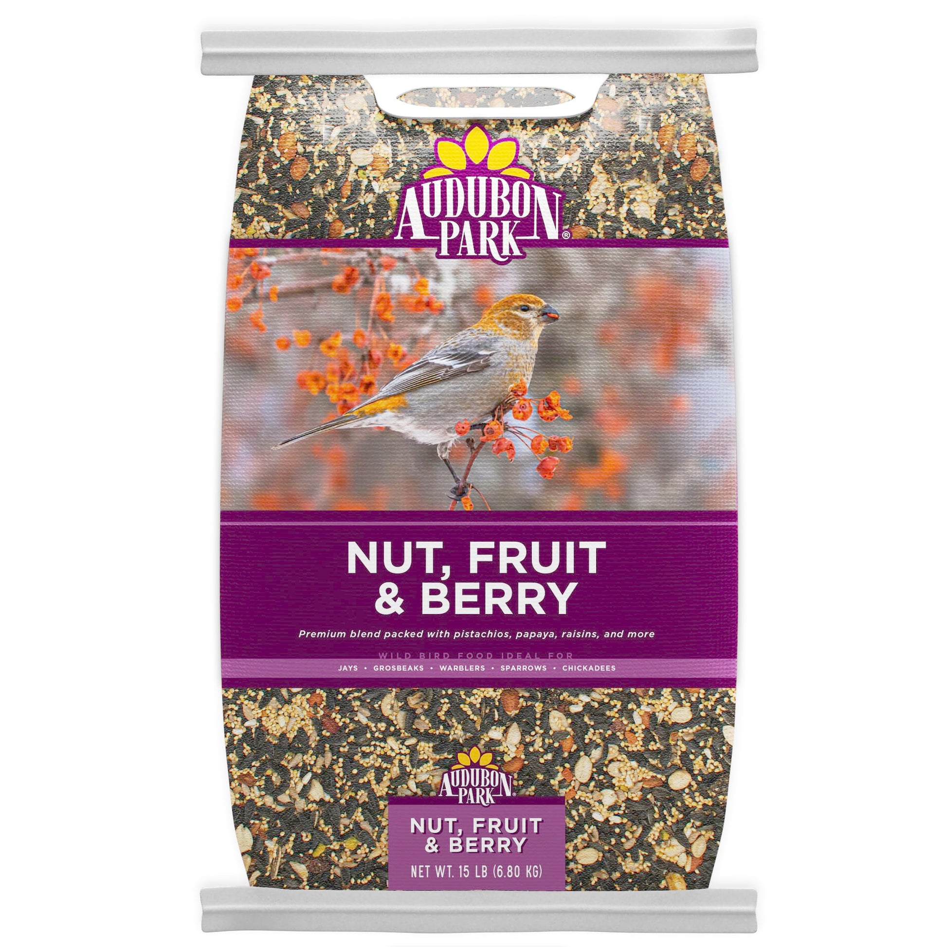 Audubon Park Nut, Fruit & Berry Wild Bird Food is packed full of 100% real fruit, nuts, and seeds to attract a variety of fruit-loving songbirds to your feeder. Offer this deluxe bird feed blend year-round to attract unique visitors who won’t be able to resist the delicious, nutritious ingredients. Nut, Fruit & Berry can be used in tube, hopper, or platform bird feeders.