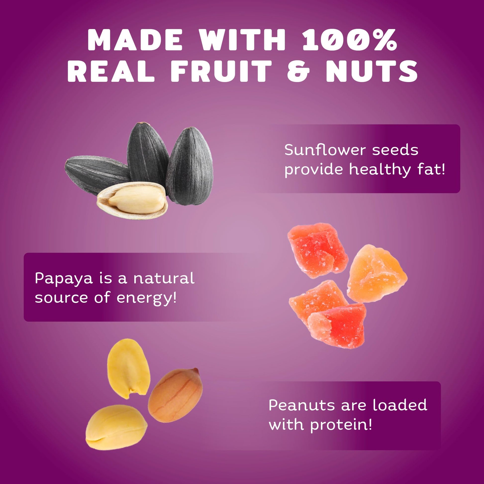 - Premium blend packed with pistachios, peanuts, papaya, raisins, cranberries, and more