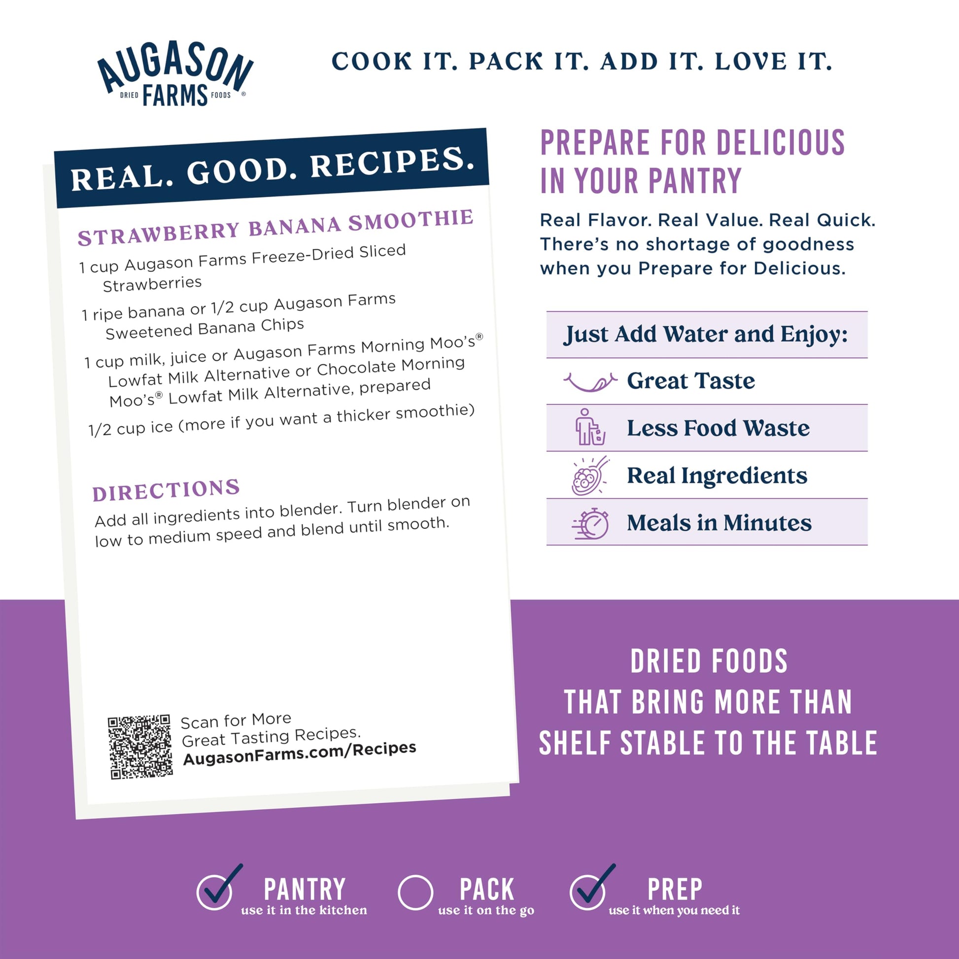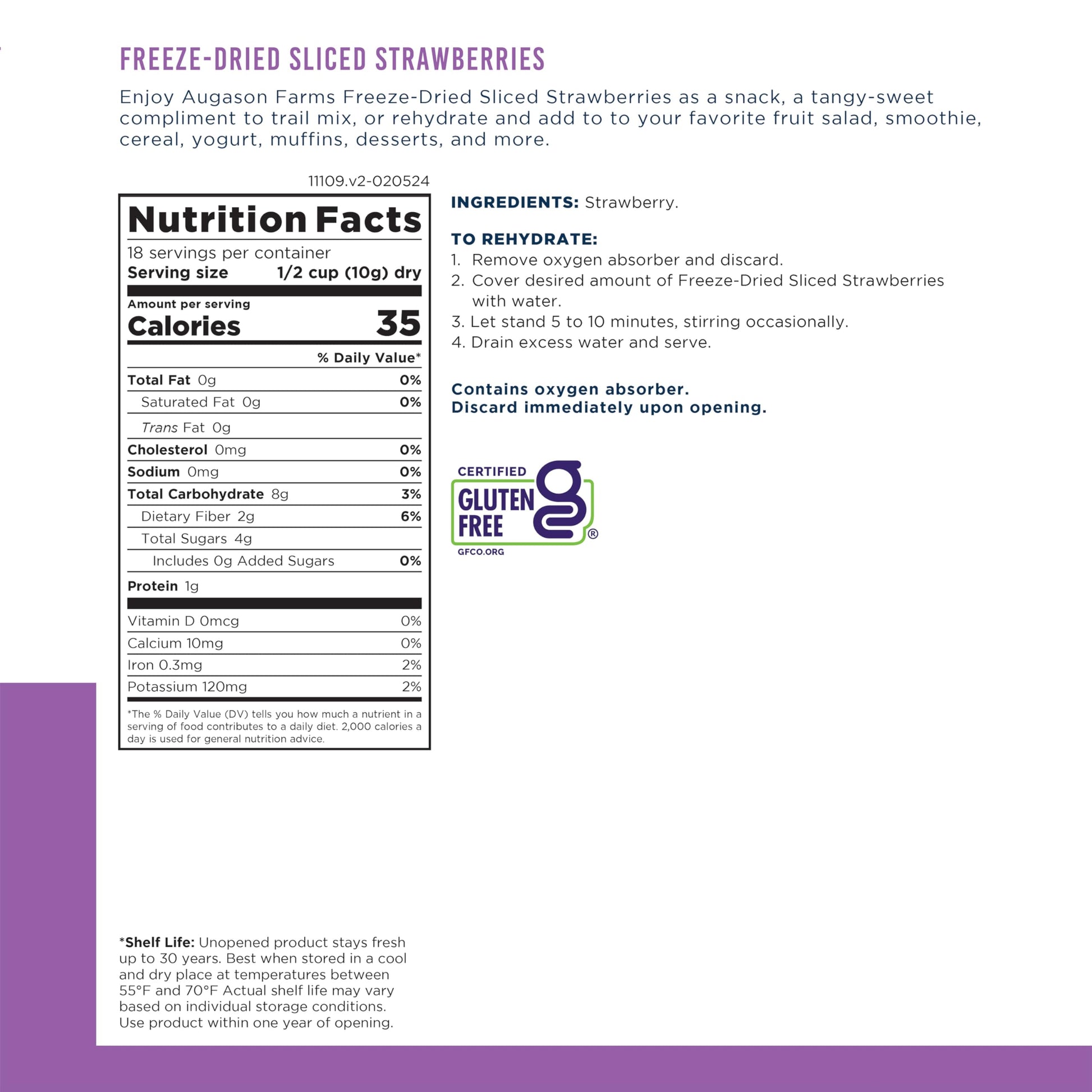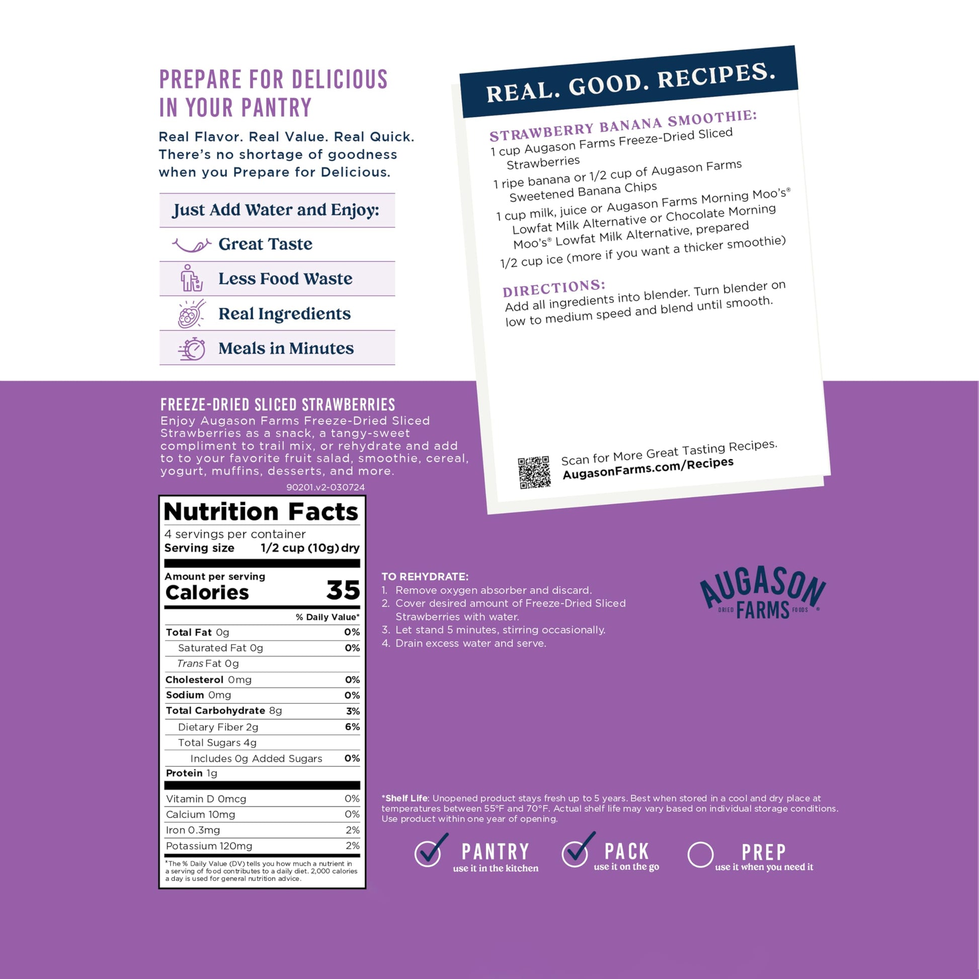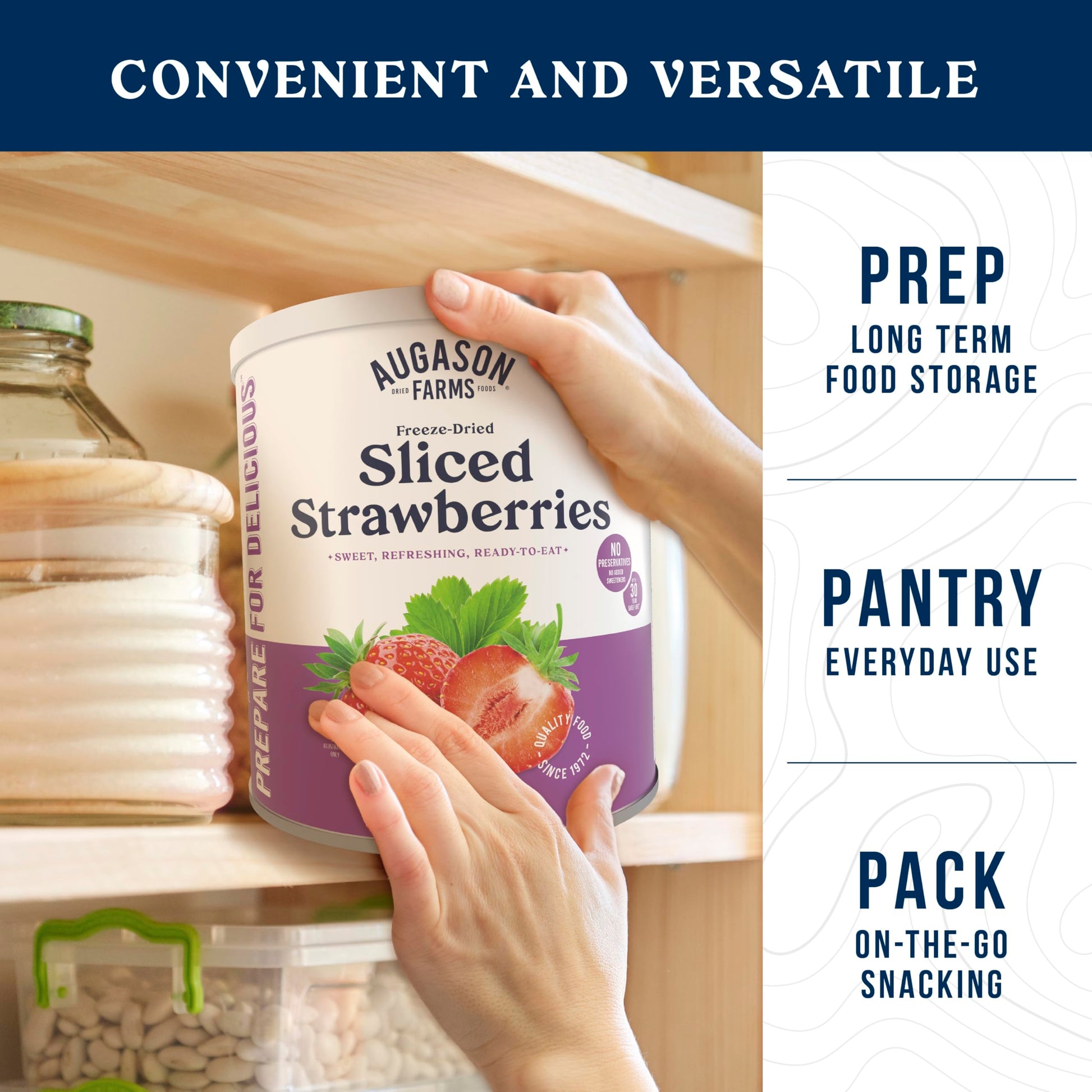 Augason Farms Freeze-Dried Sliced Strawberries can be enjoyed daily as a snack or to add a little natural sweetness to cold cereal or oatmeal. You can also reconstitute them with water and add them to your strawberry shortcake, strawberry milkshakes, or to top off your strawberry torte. Makes a great addition to trail mix, too. Shelf life up to 30 years based on storage conditions.