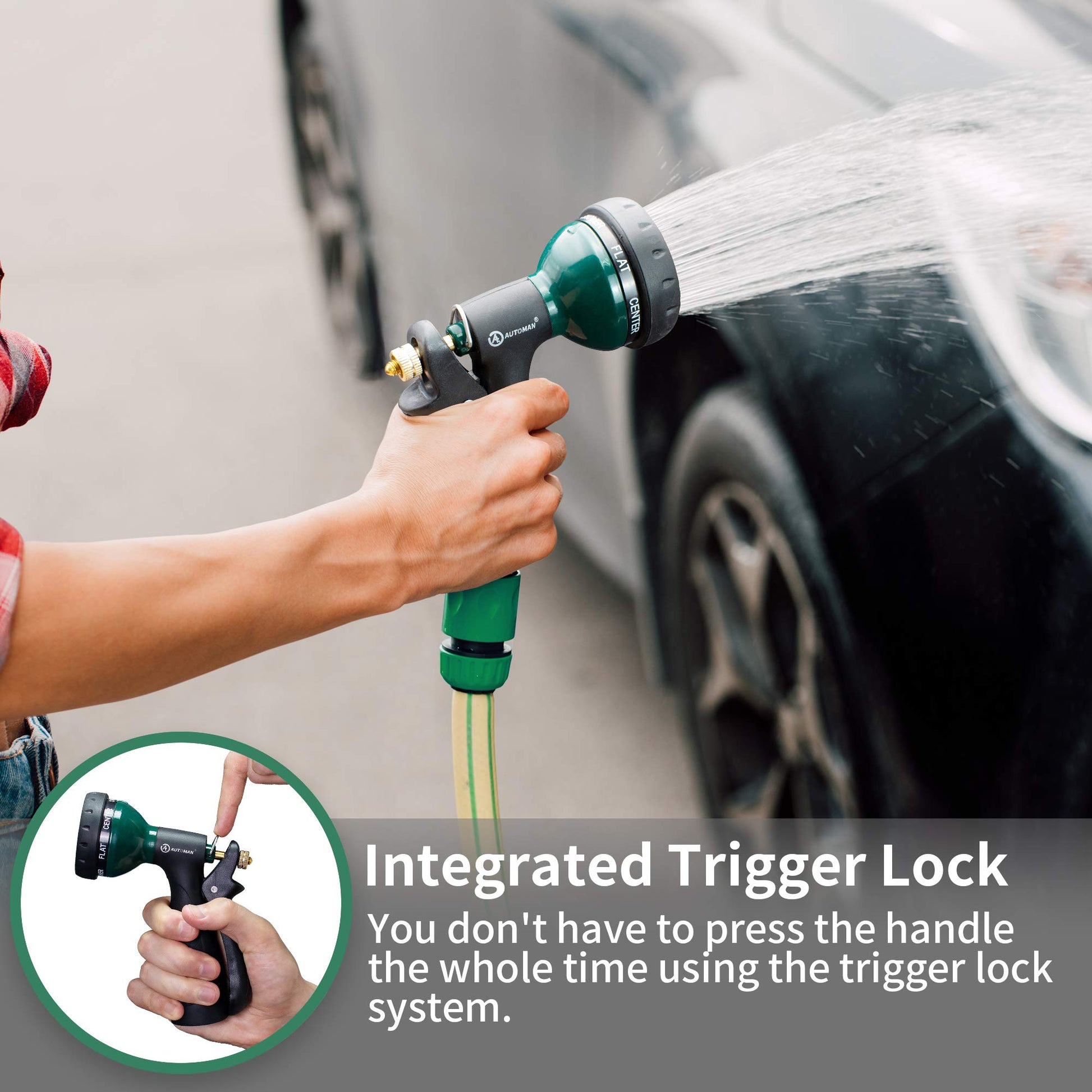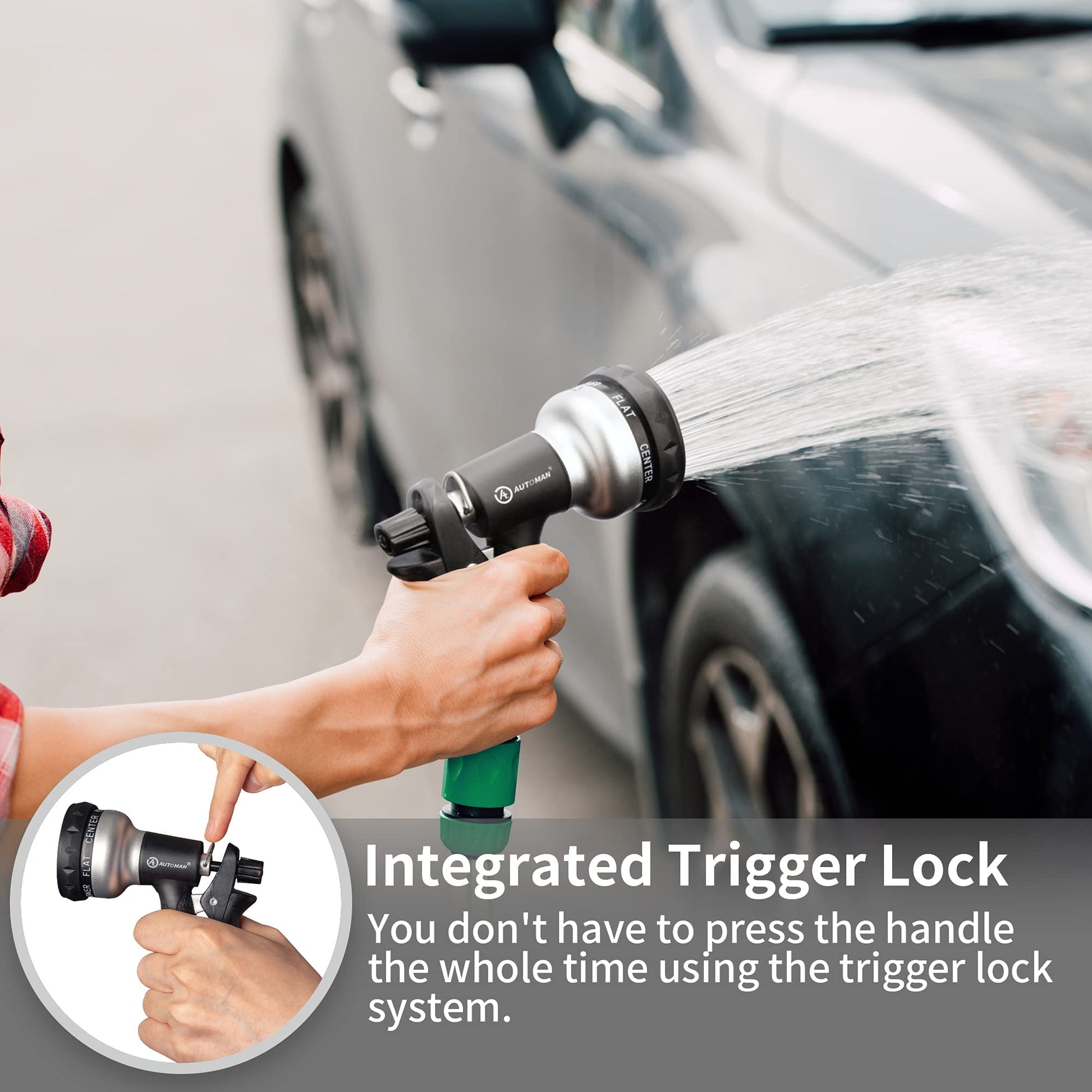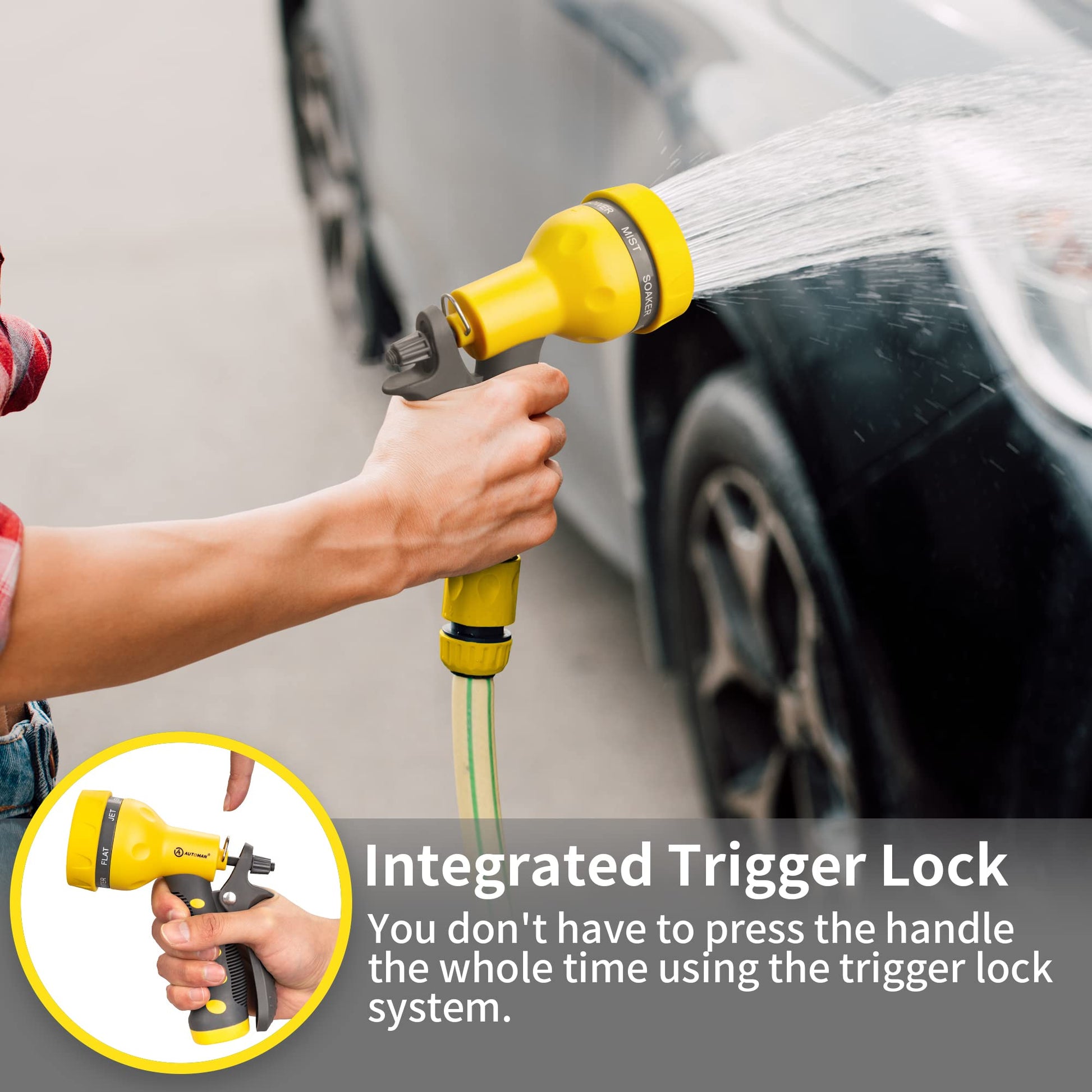 - LABOR-SAVING DESIGN: AUTOMAN garden nozzle features a nice lock bar at the top of the handle that keeps the water remains on without you having to apply any pressure.Just use the lock so you don't have to keep your hand holding it the whole time.