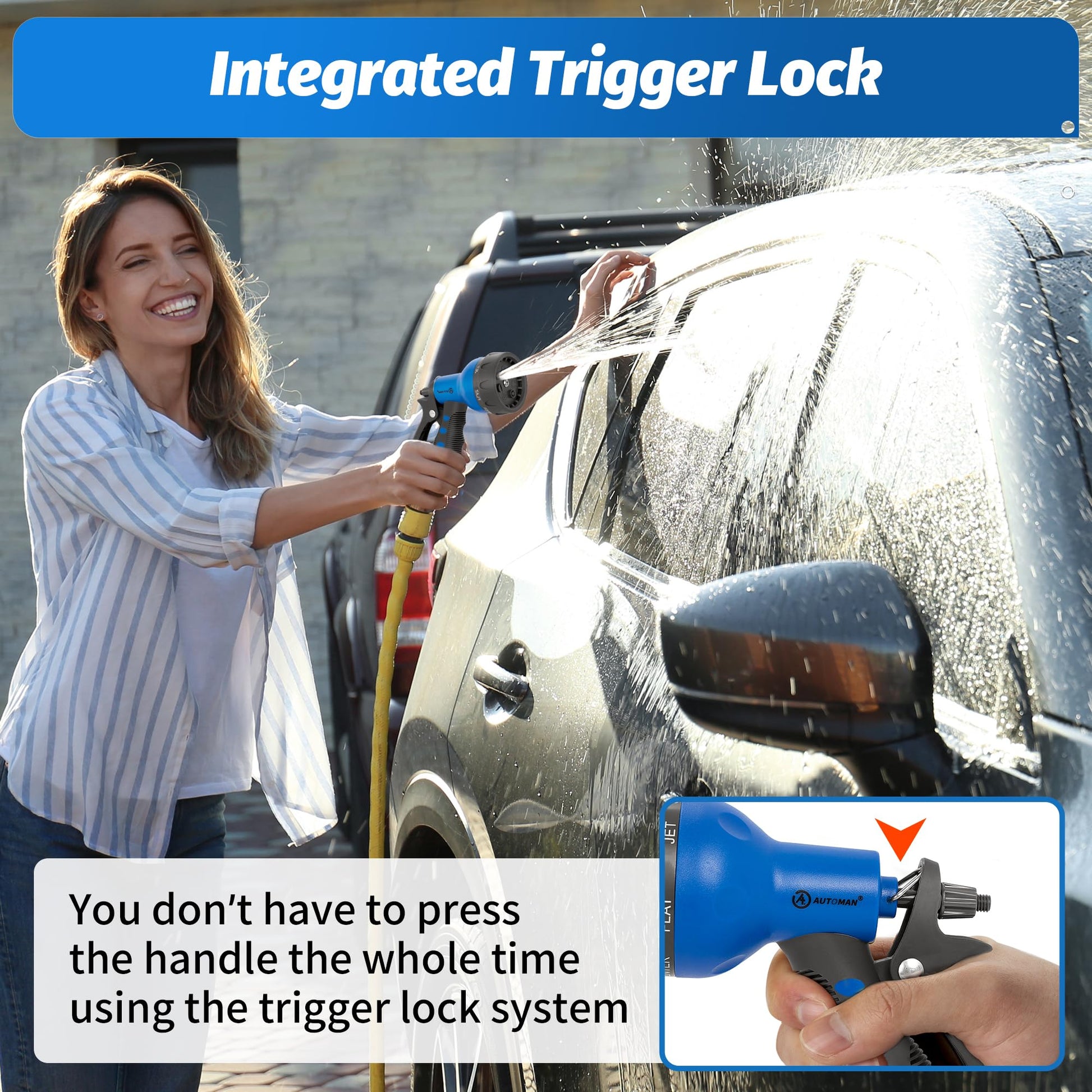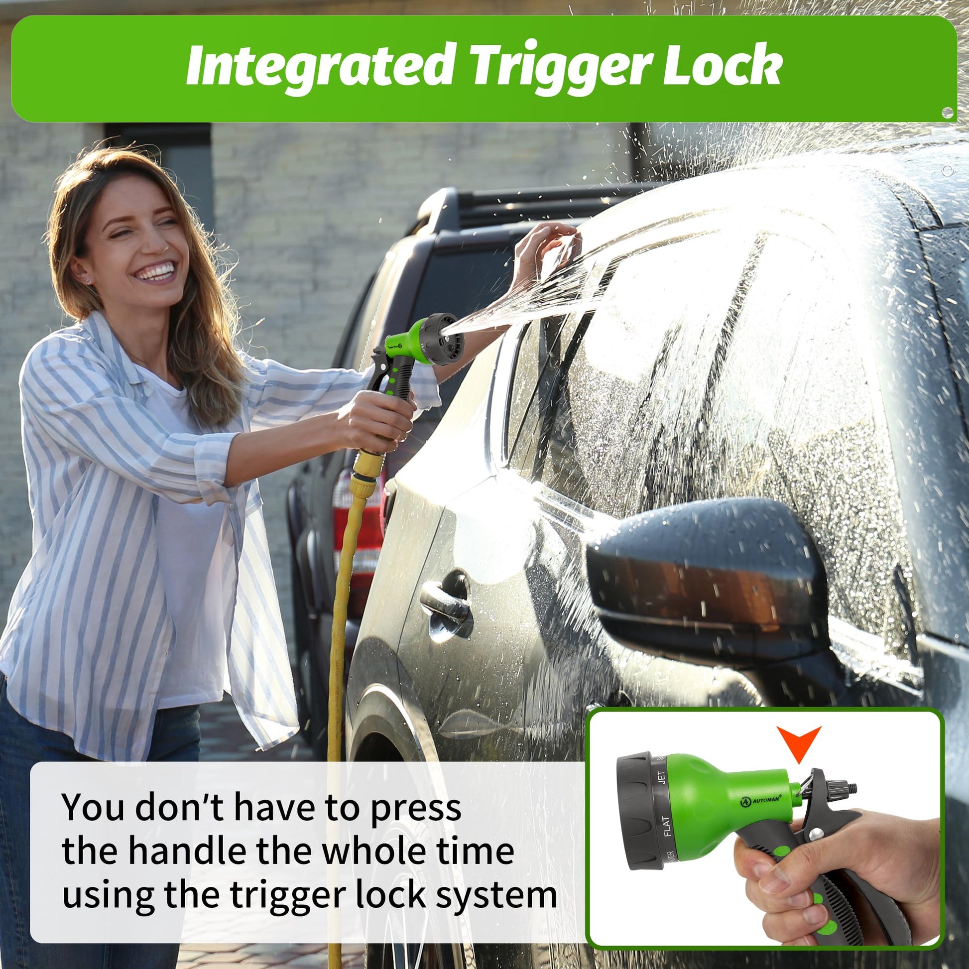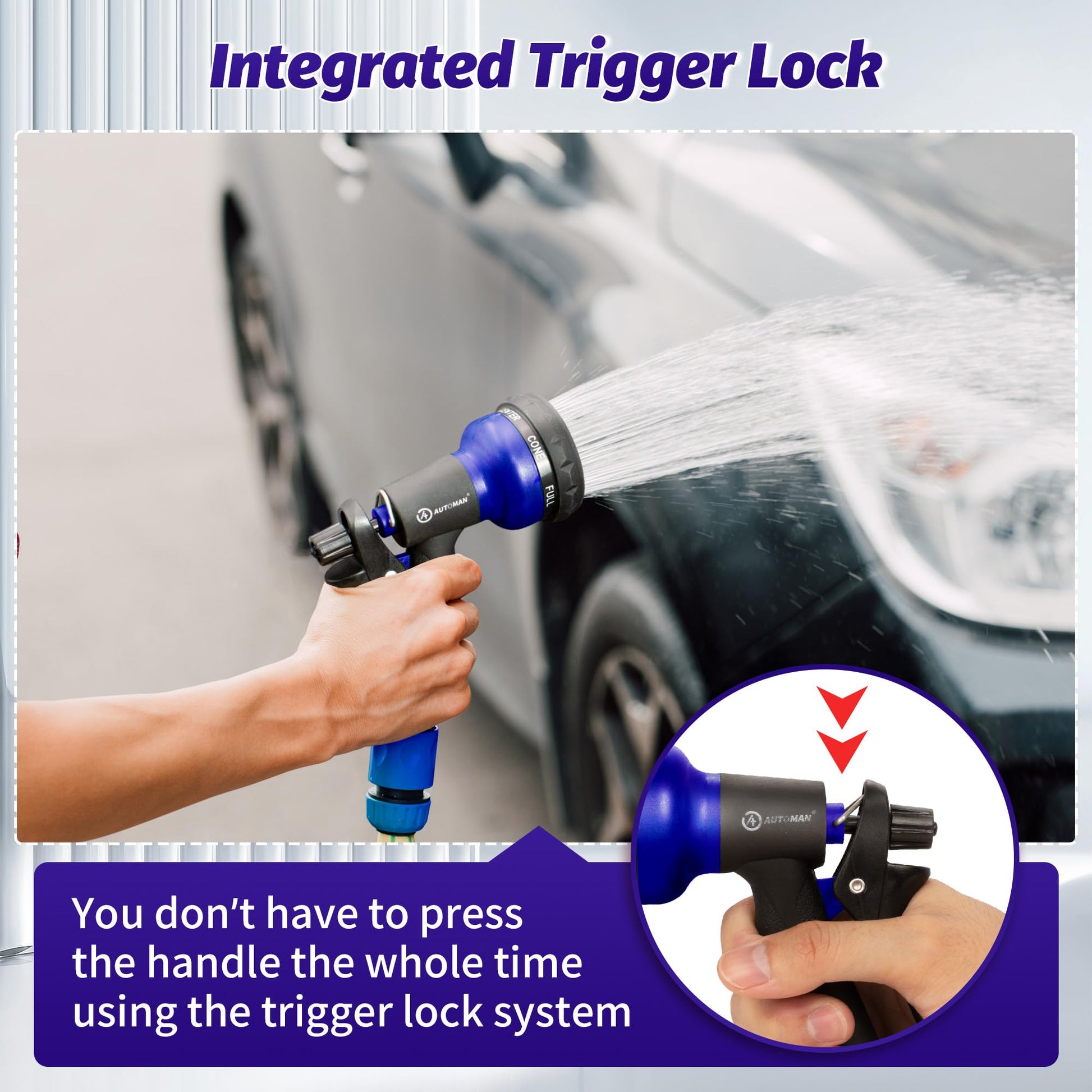 - LABOR-SAVING DESIGN: AUTOMAN garden nozzle features a nice lock bar at the top of the handle that keeps the water remains on without you having to apply any pressure.Just use the lock so you don't have to keep your hand holding it the whole time.