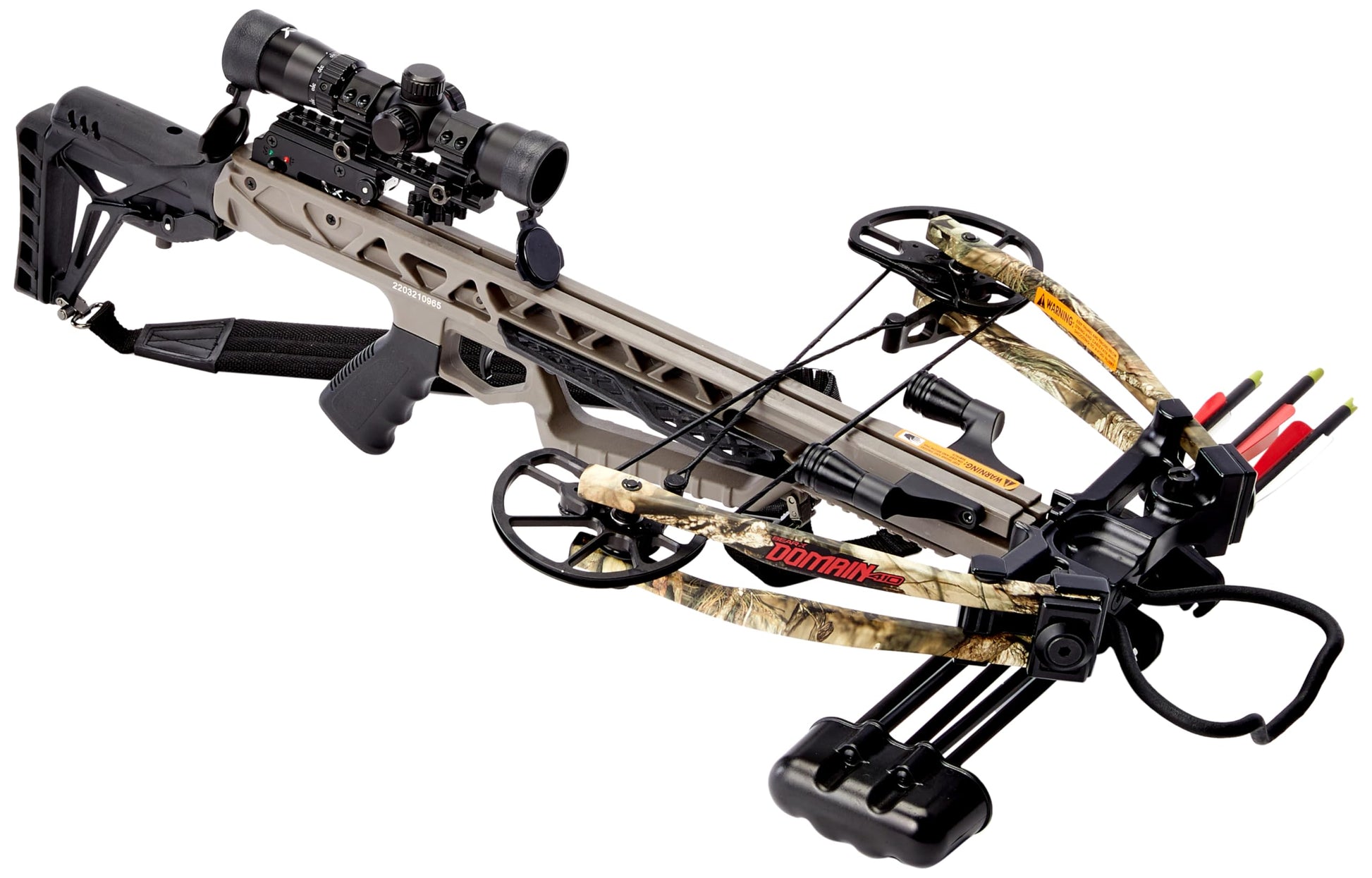 - This ready-to-hunt crossbow package includes an Illuminated Reticle Scope, 3 Bear X TrueX Max arrows, a 4-arrow quiver, sling, manual cocking sled, and arrow lube/string wax