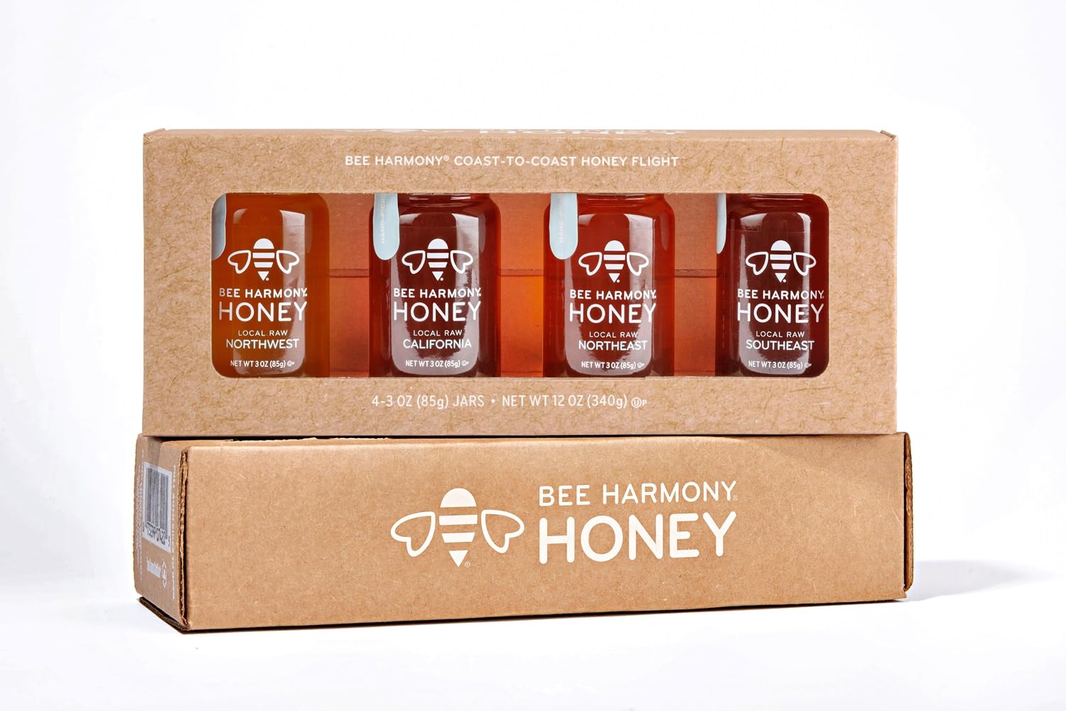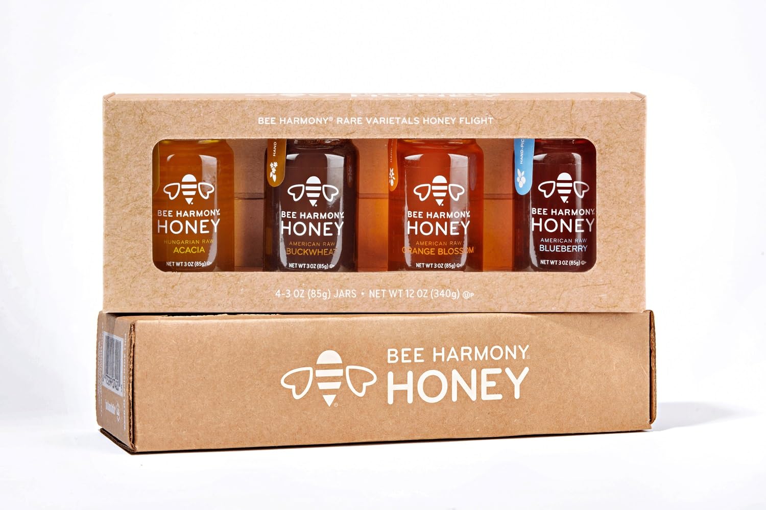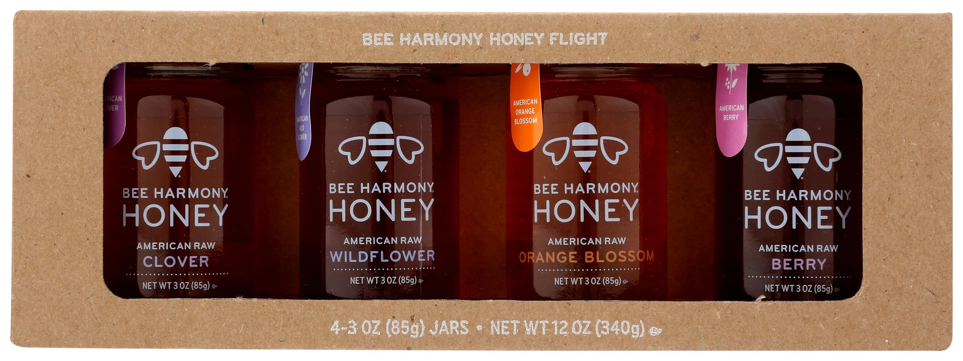 - INCLUDES 4 mini jars of raw honey, 3 ounces each. Bee Harmony Classic Honey Flight Varieties include: American Clover, Wildflower, Orange Blossom and Berry. Packed and sealed with care in clear glass jars.