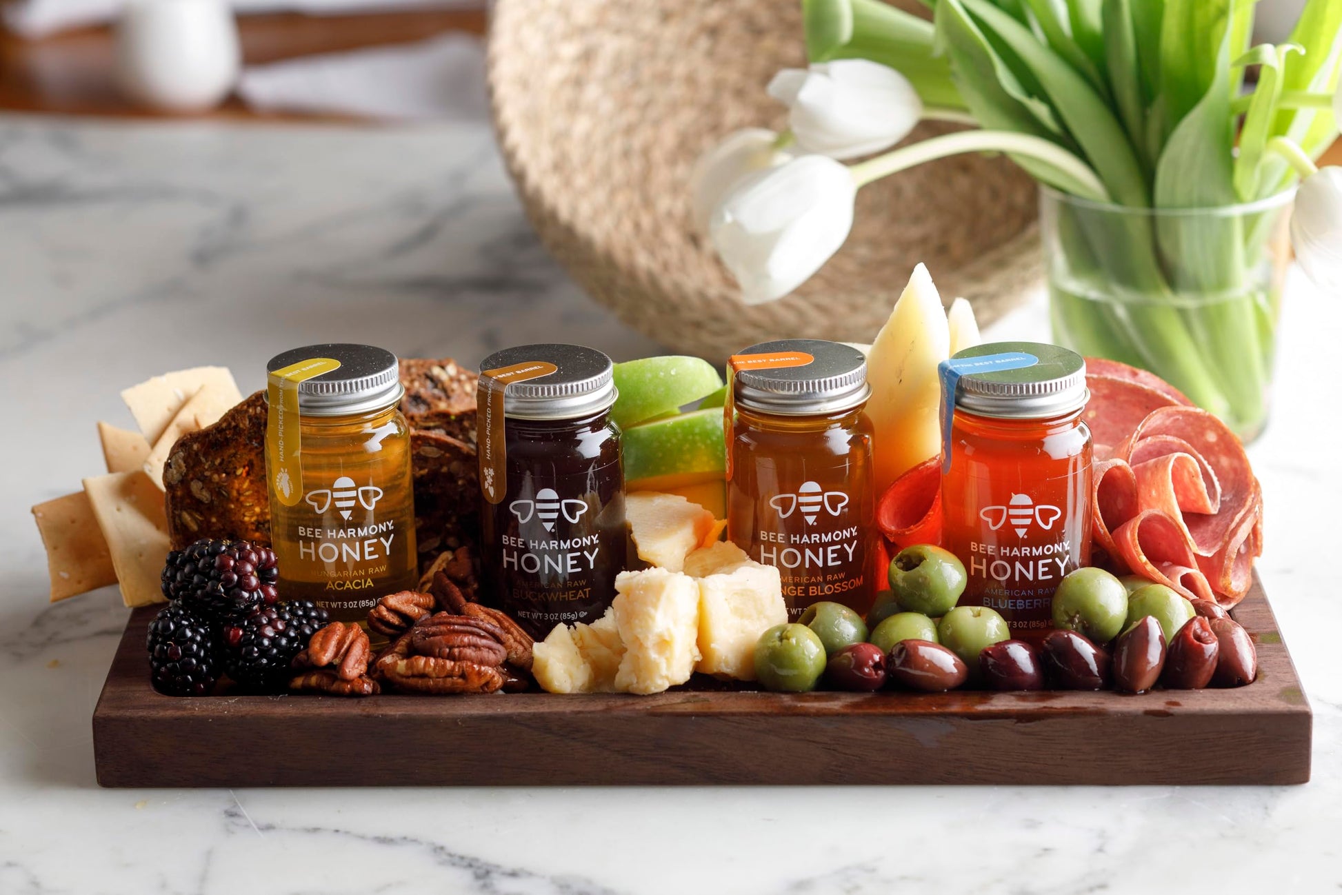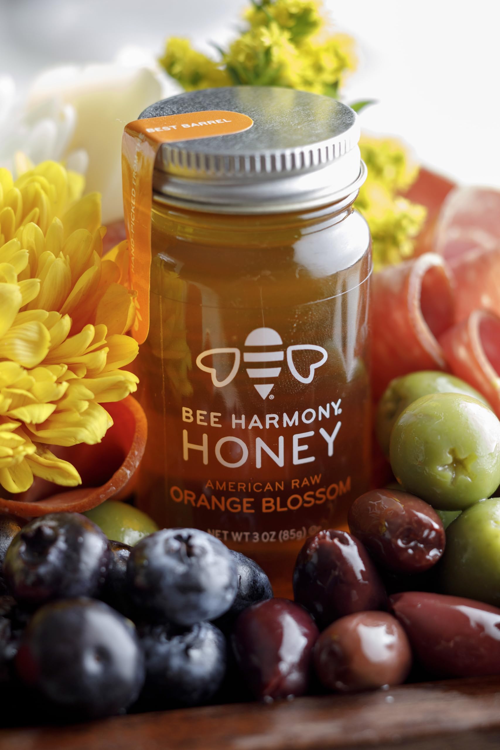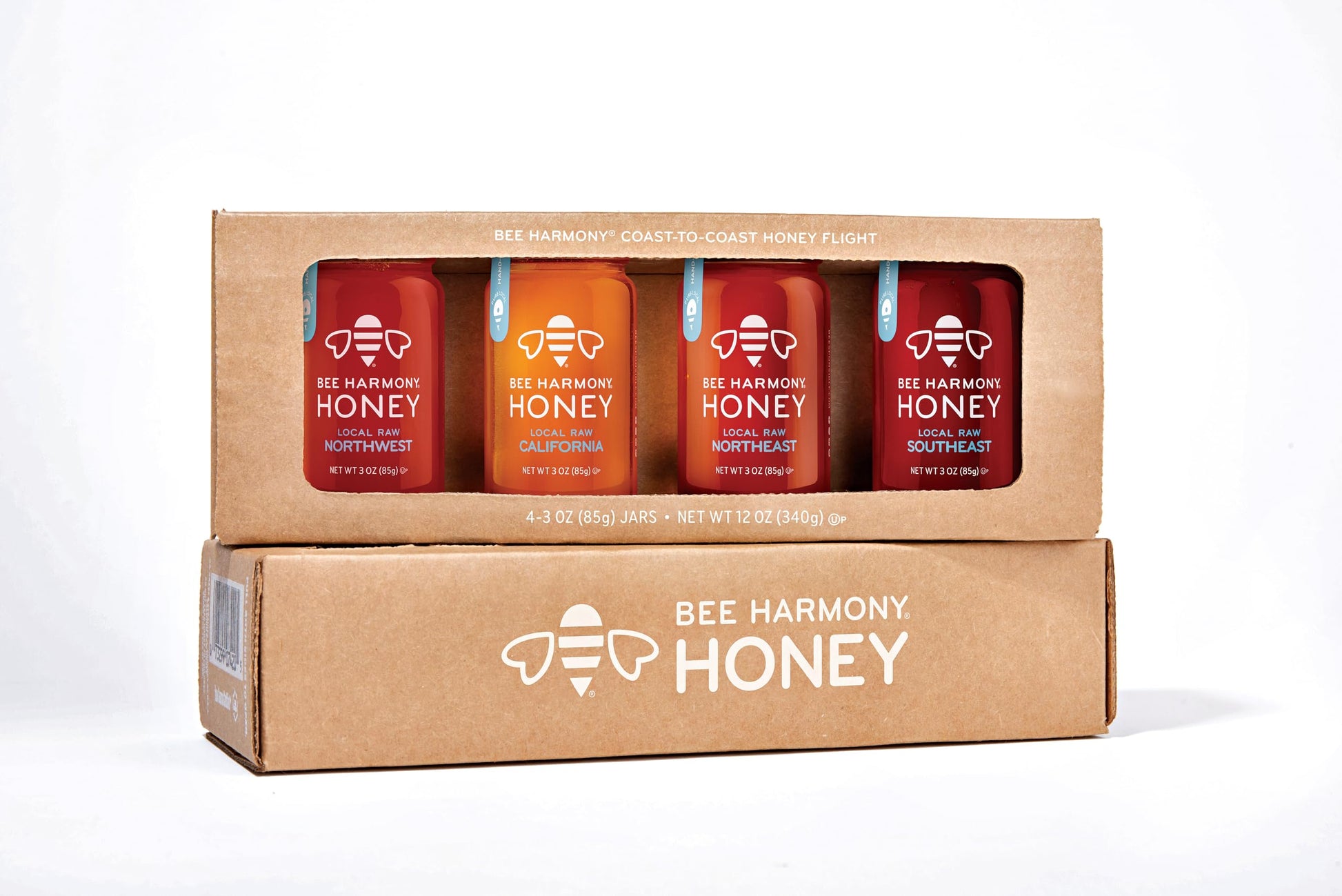 - INCLUDES 4 mini jars of raw honey, 3 ounces each. Bee Harmony Classic Honey Flight Varieties include: American Clover, Wildflower, Orange Blossom and Berry. Packed and sealed with care in clear glass jars.