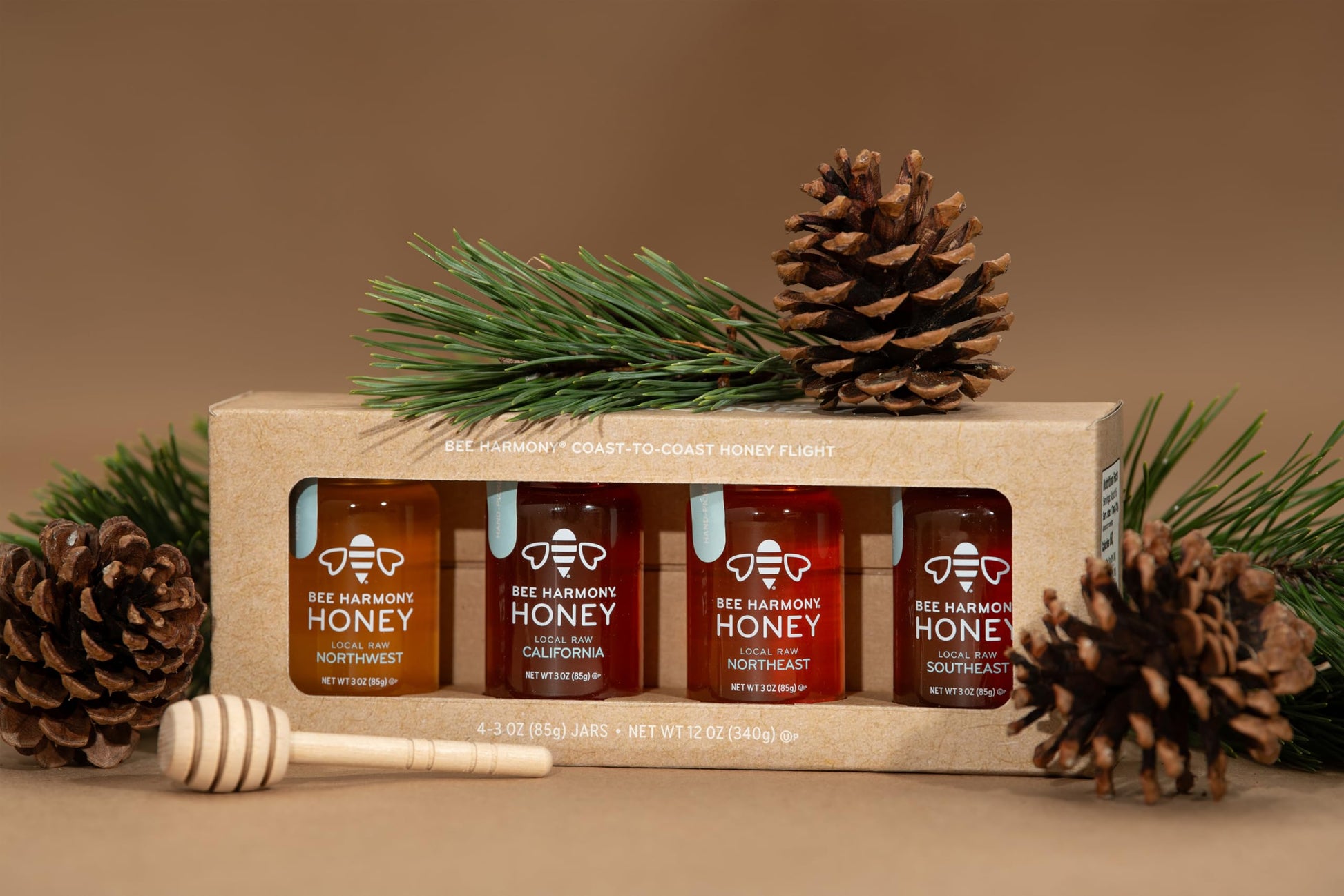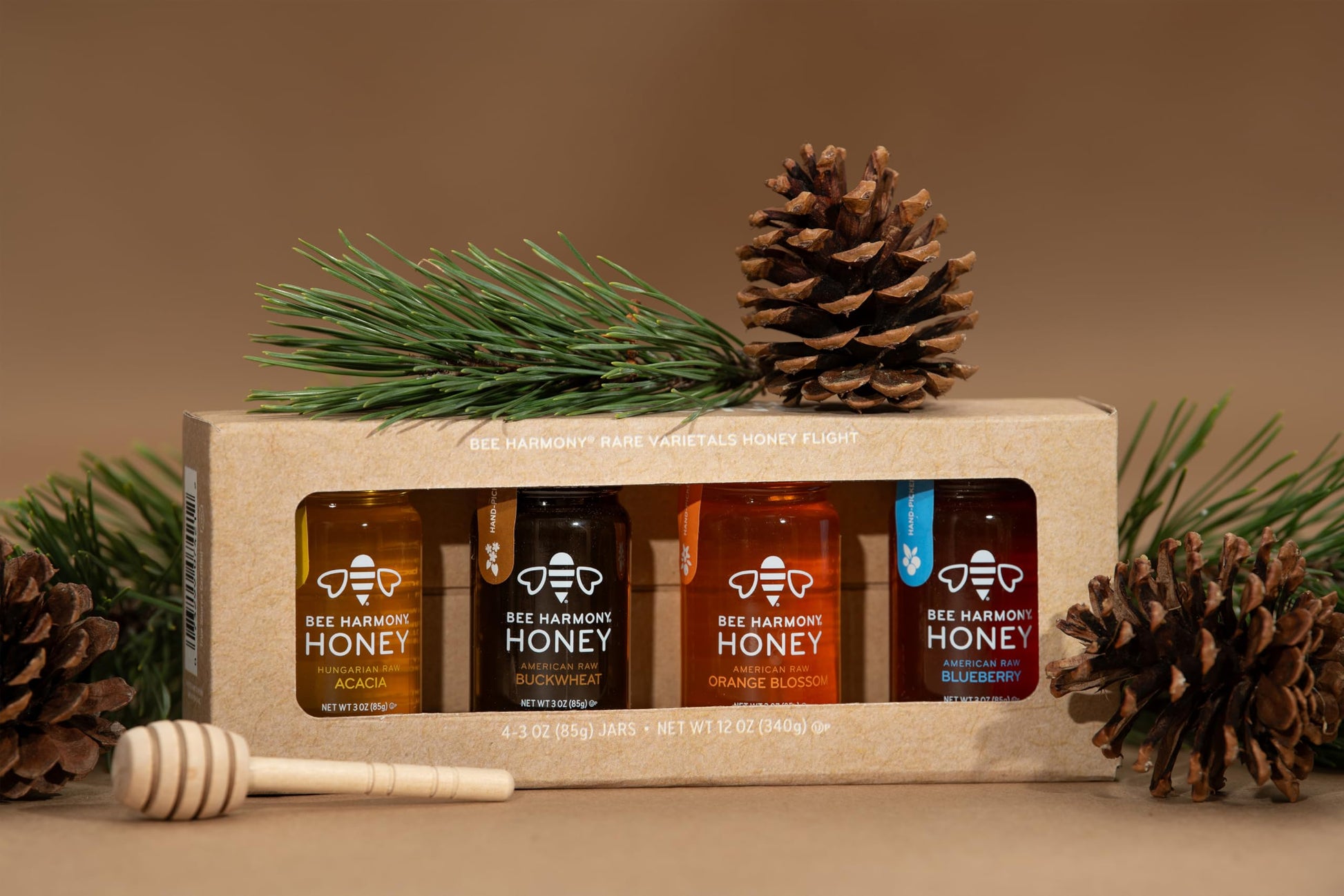 These specially packaged honey flights each feature four 3 oz. jars of premium raw Bee Harmony Honey varietals — a delicious showcase of the unique flavors that come from bees and the flowers they visit. A mini taster spoon is also included within the kraft packaging.