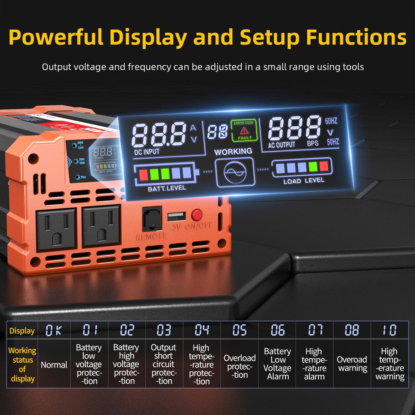 - 【INTELLIGENT LCD DISPLAY】: This 1000Watt inverter comes with a high-brightness real-time smart screen that simultaneously displays input and output voltages, battery and load status, multiple operating conditions for timely troubleshooting. At the same time, the output voltage and screen can be adjusted independently in a small range