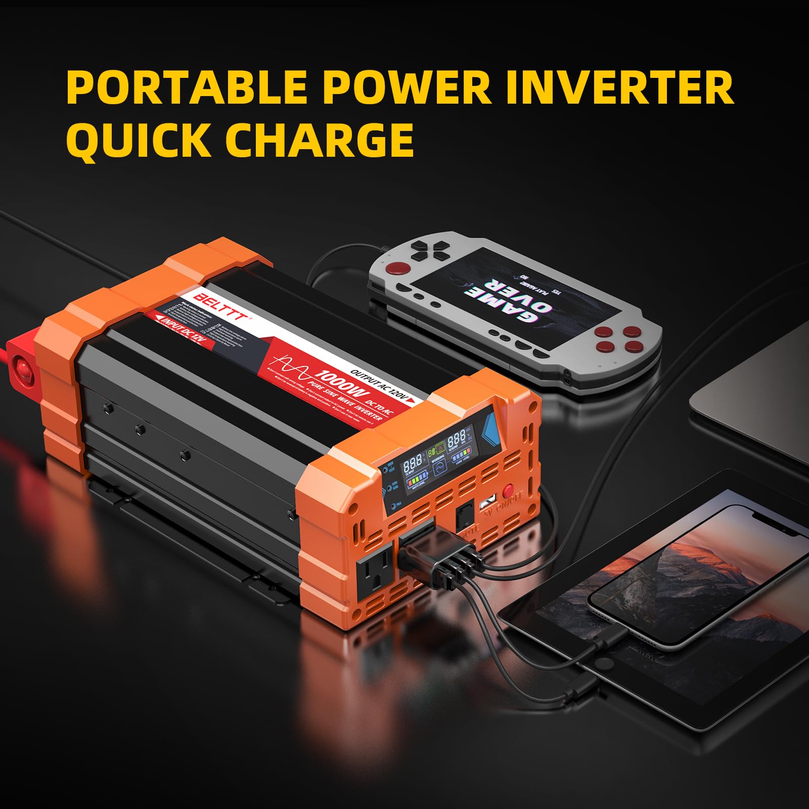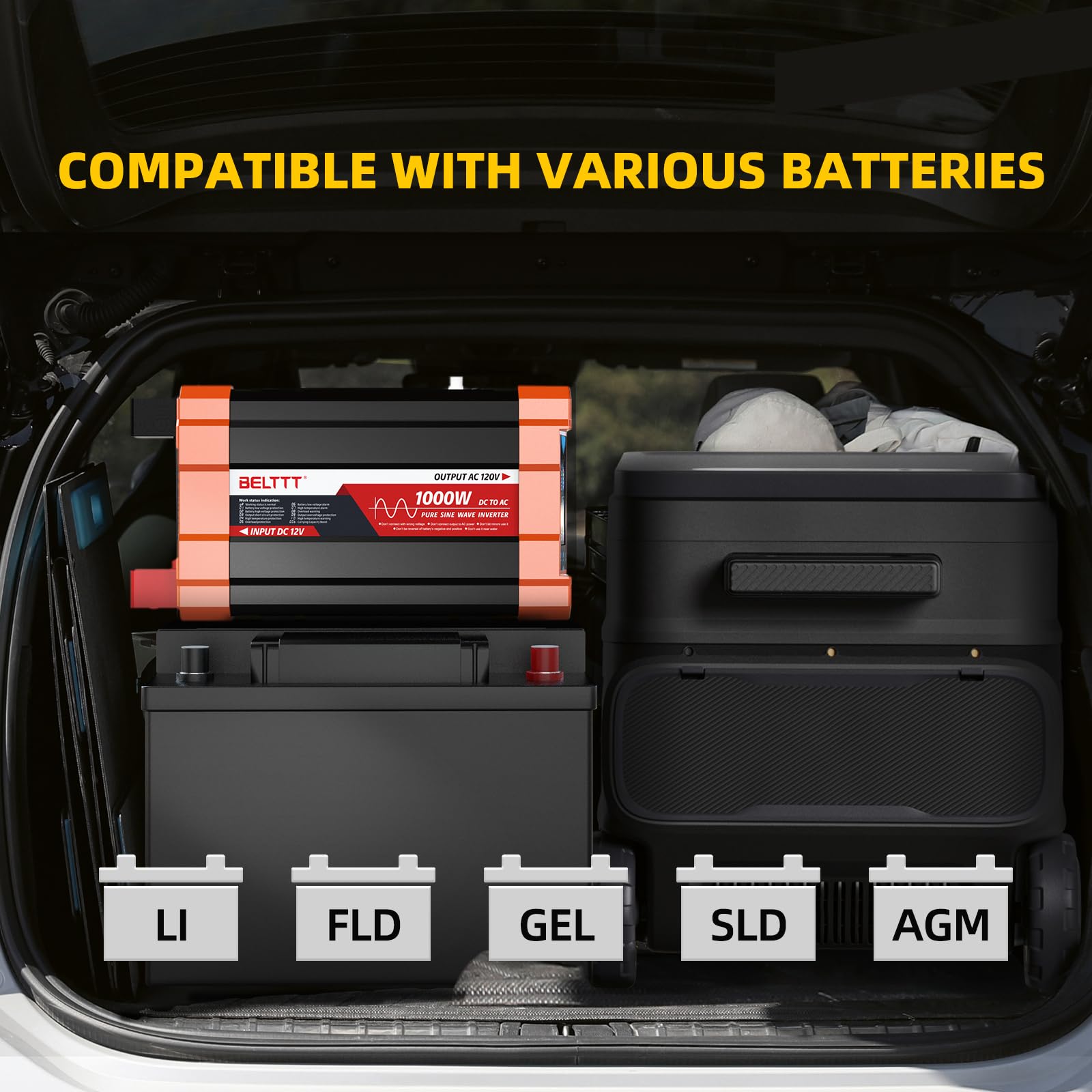 BELTTT 1000Watt Pure Sine Wave Inverter 12V DC to 120V AC for RV, Truck, Off-Grid Solar Car Power Inverter 12V to 110V Converter with Dual AC Socket and 5V 2.1A USB, Intelligent LCD, 2000W Peak