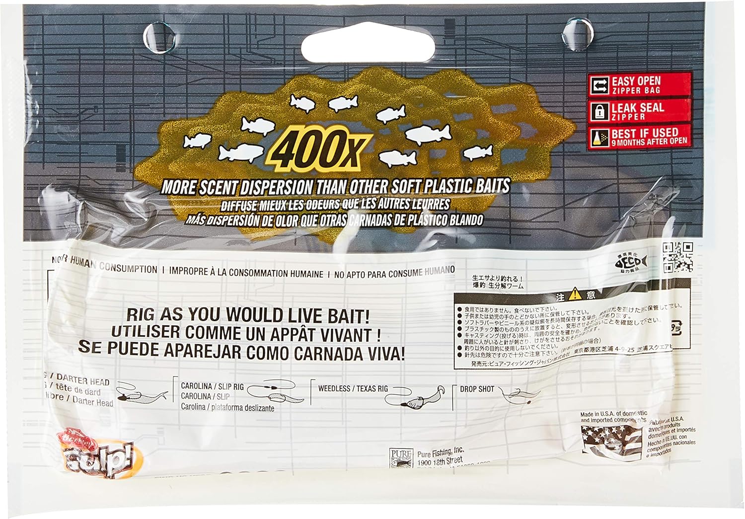 - Rapid scent dispersion, 400x more than other plastic baits