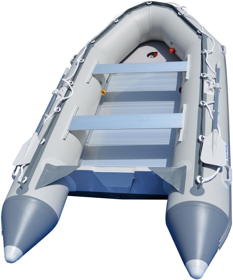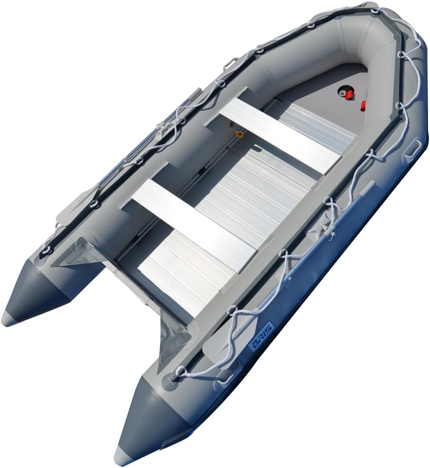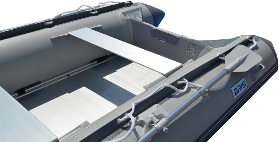 - Features: Heavy-duty sectional aluminum floor provides sturdy, corrosion-proof platform for any type of water activities - diving, fishing, snorkeling. Separate internal air chambers for safety on water. All around, durable rubber strike to prevent punctures. Marine plywood transom for outboard motor. Transoms covered with triangular splash guards to minimize back splash and protect the transom holders from heat and exposure to UV rays, deep V-keel with rub-strake protection for easy planing.