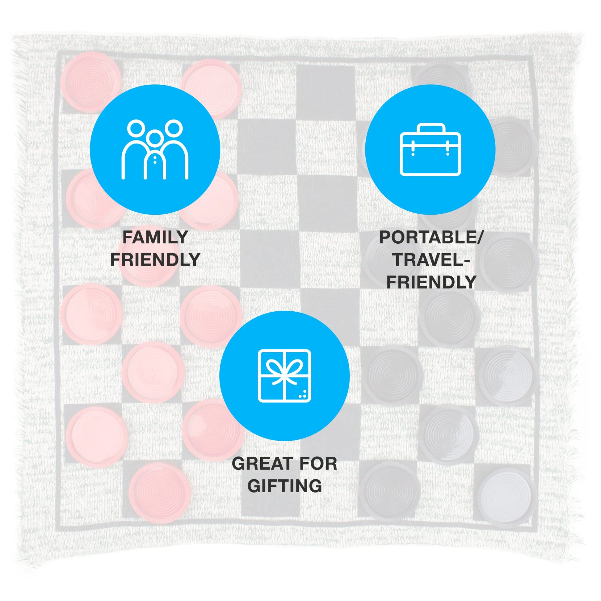 - Reversible Rug - The soft, woven rug measures 26 x 26 in and features a checkerboard on one side. Flip it over for the Tic-Tac-Toe board. Can also be used for chess or as a classy décor for a table. On the go, Roll it up and take it with you
