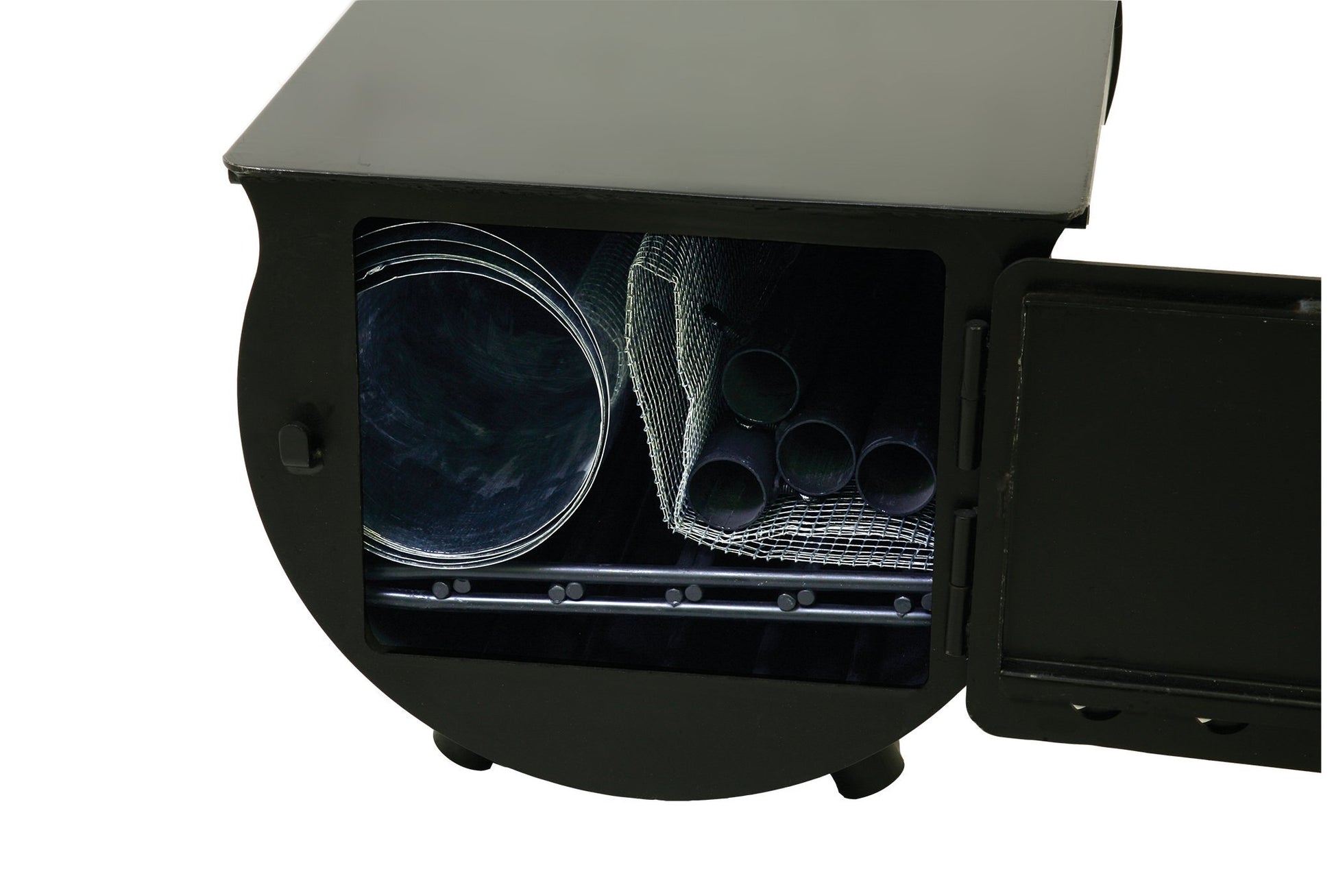 - Convenient Wood Stove System: This cylinder stove system includes damper, internal log grate, spark arrestor, accessory shelves, and five-piece nesting pipe
