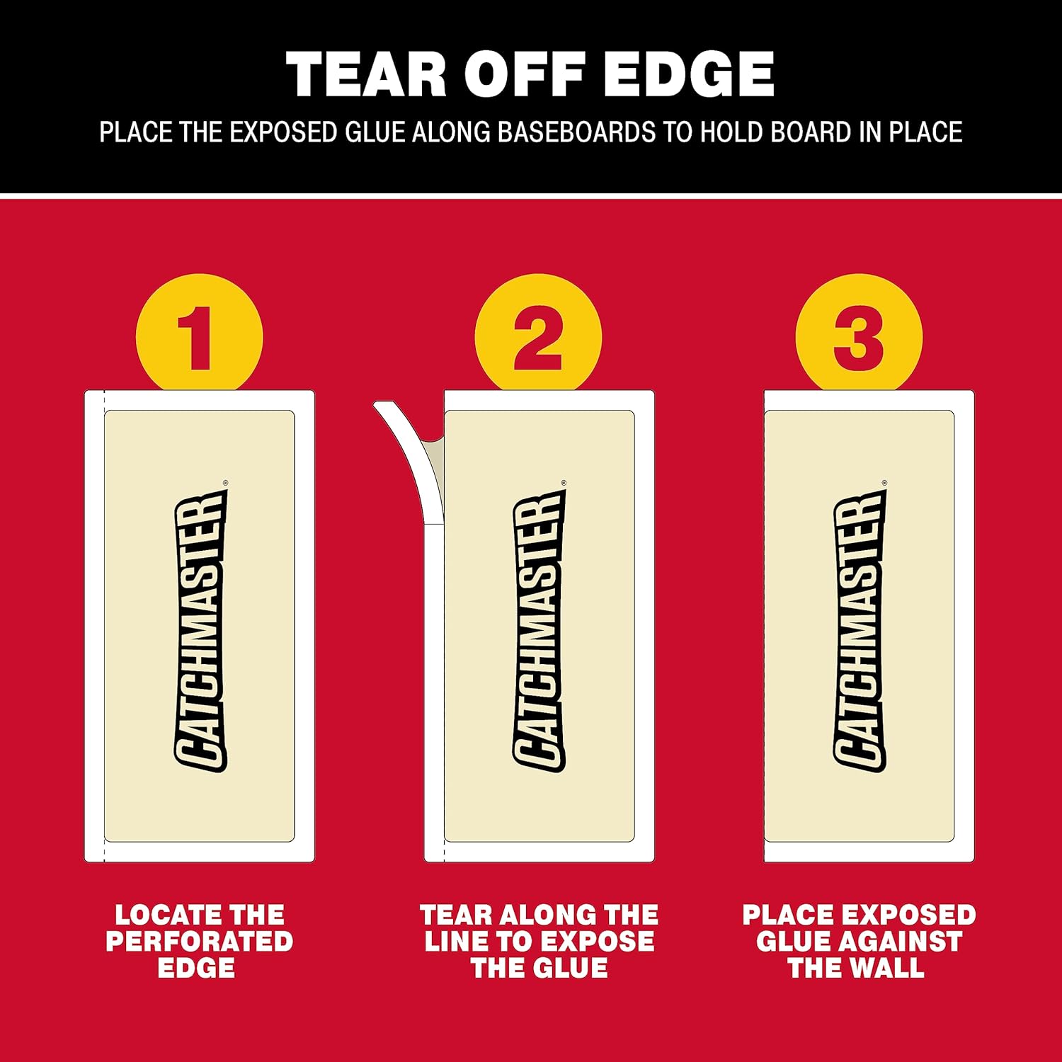 Are you tired of other flimsy or poorly made mouse traps that are difficult to set up, or worse, just fall apart? Our proprietary tear-off edge makes setting this trap as easy as 1-2-3. Locate the perforated edge, tear along the line to expose the glue, and then place exposed glue against the wall.