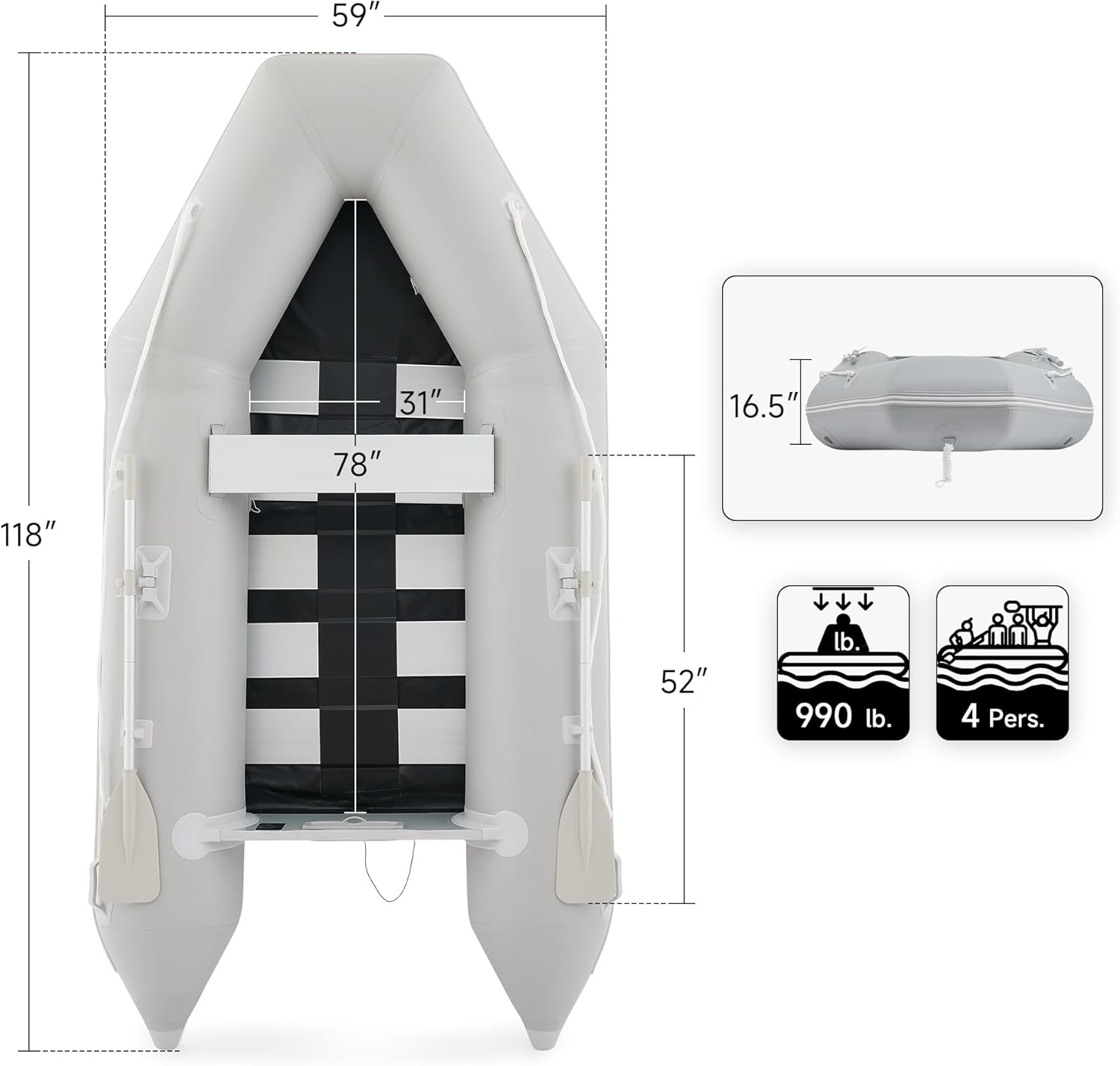 - 4-Person Fun: With a weight capacity of 990 lb, this 118"" x 59"" x 16.5"" inflatable dinghy comfortably fits four passengers. The corrosion-resistant aluminum alloy floorboard and seat provide added stability and comfort for a smooth ride