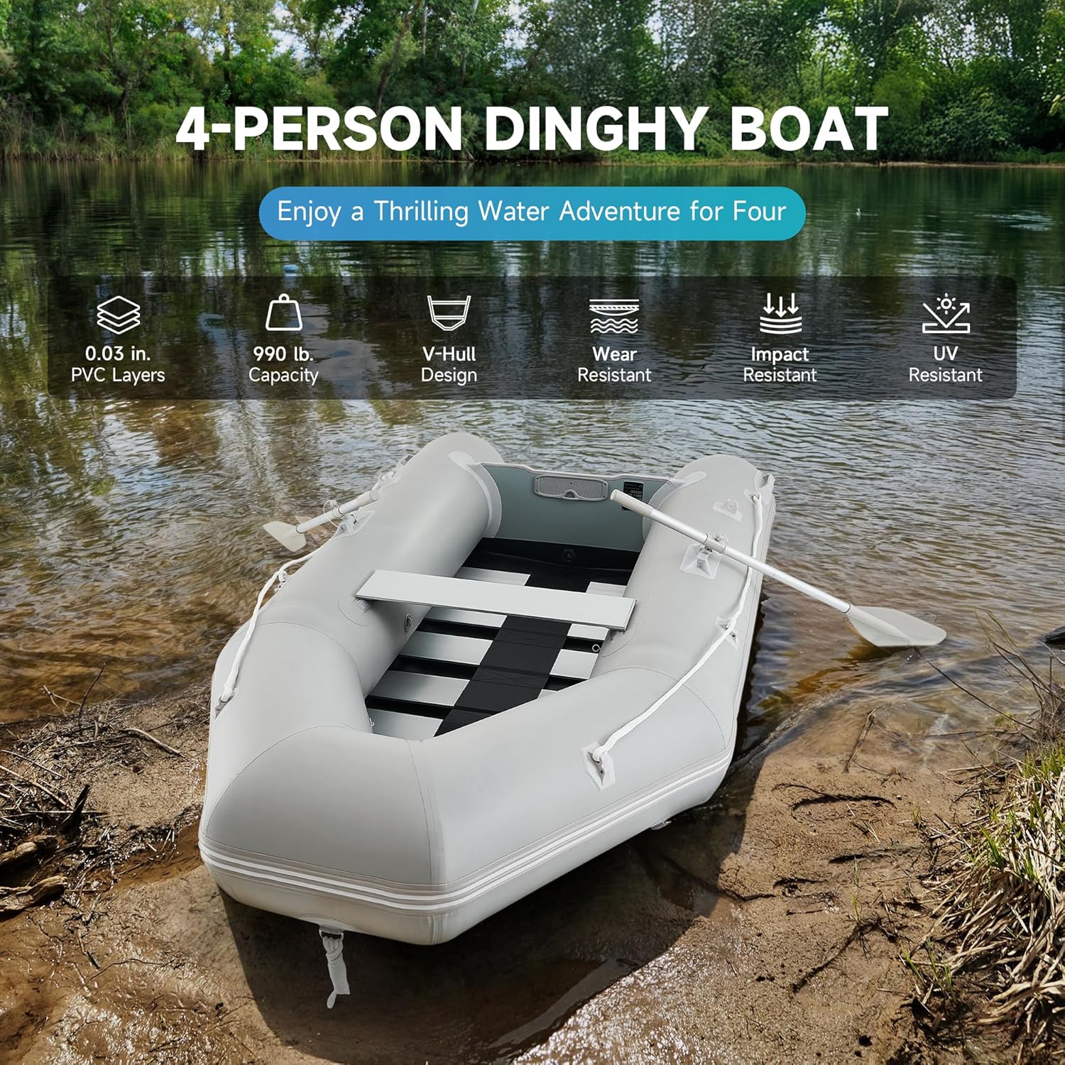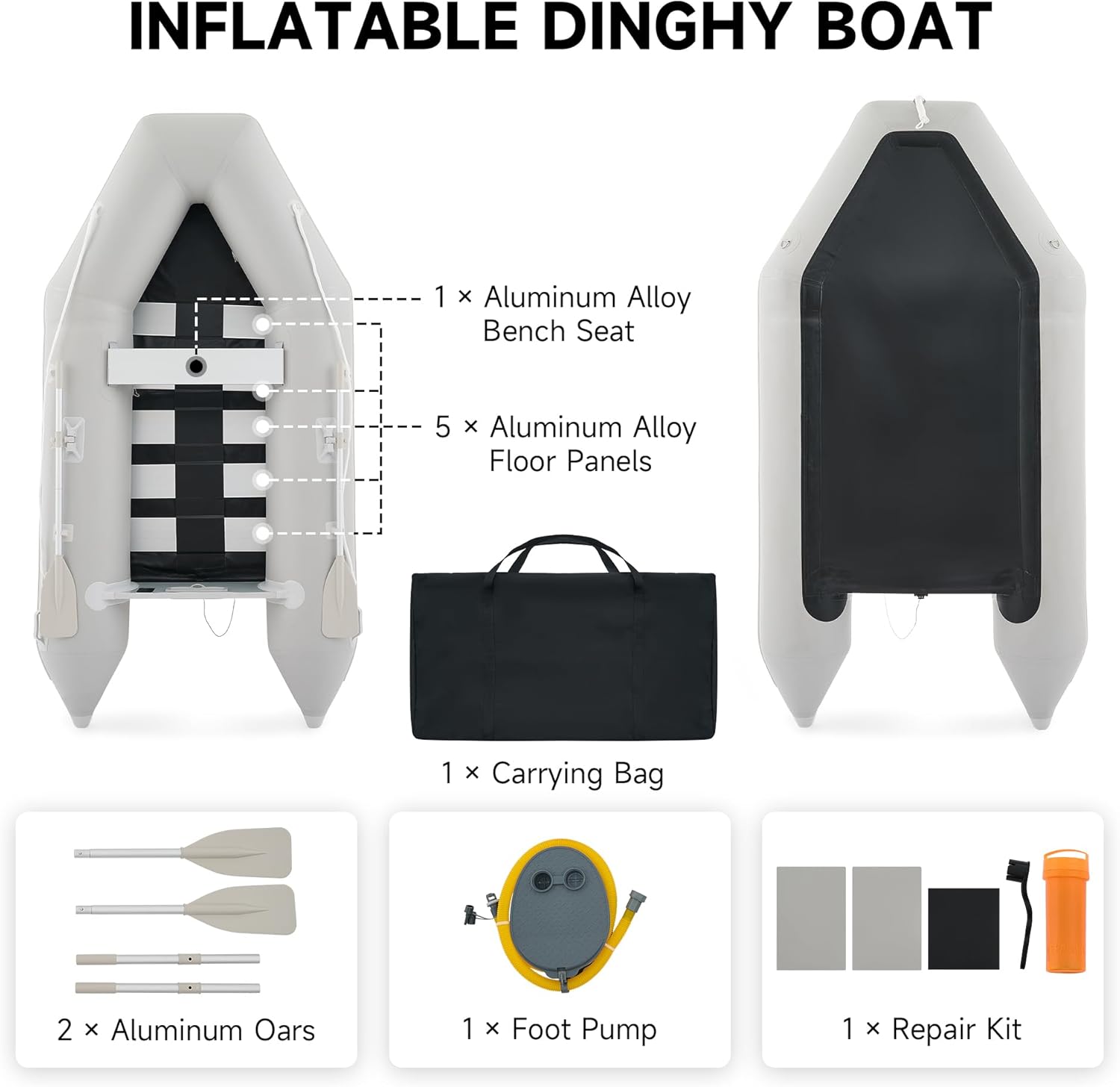 - All Essentials Included: Our inflatable dinghy boat comes complete with a pair of aluminum oars, a foot pump, a carry bag, and a repair kit. Everything you need to quickly inflate the boat, smoothly navigate the water, and easily transport it is provided