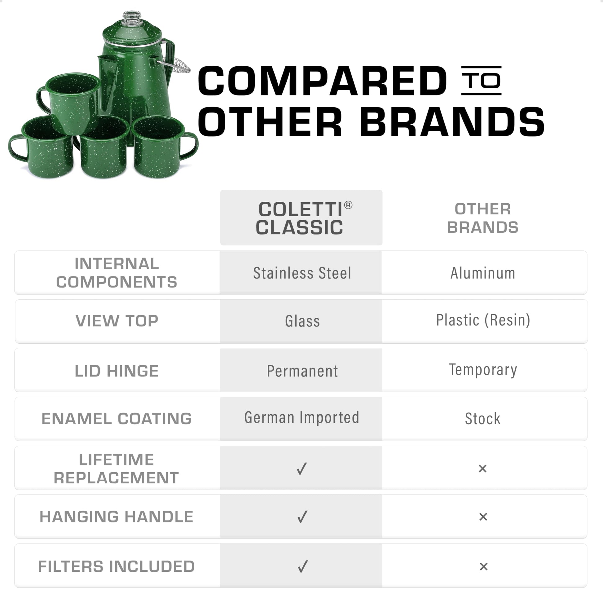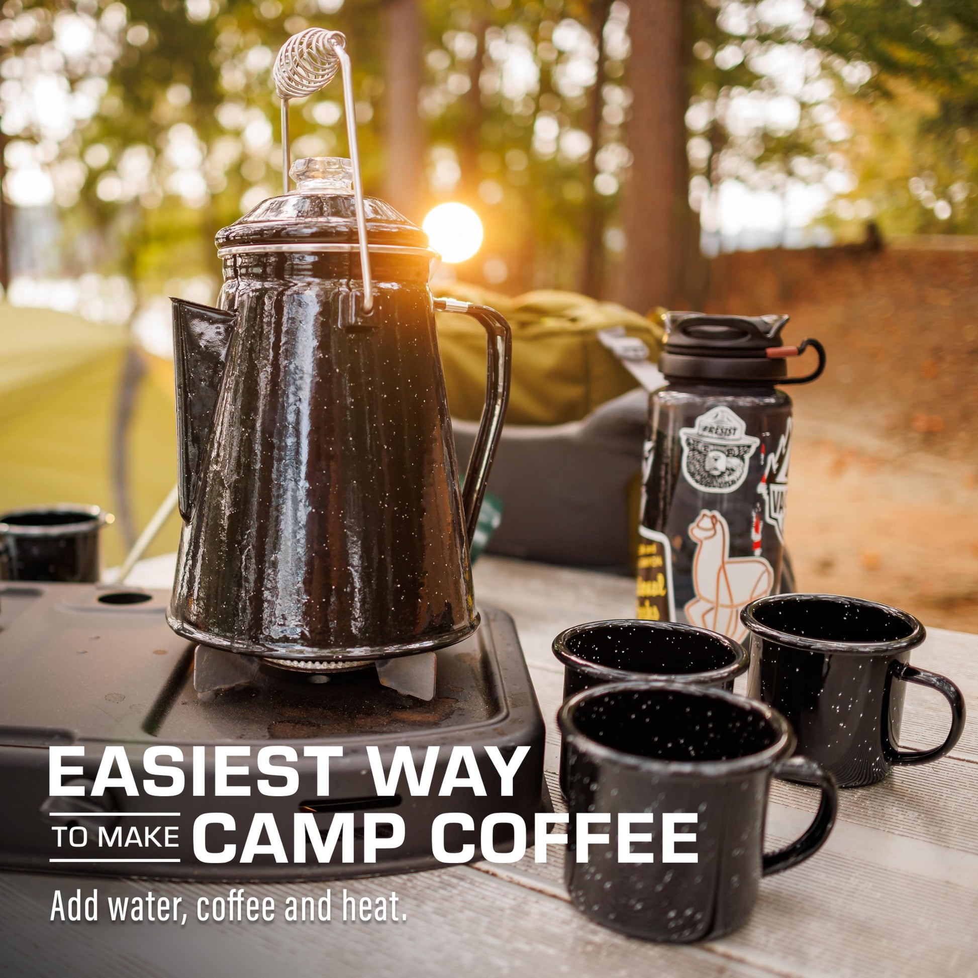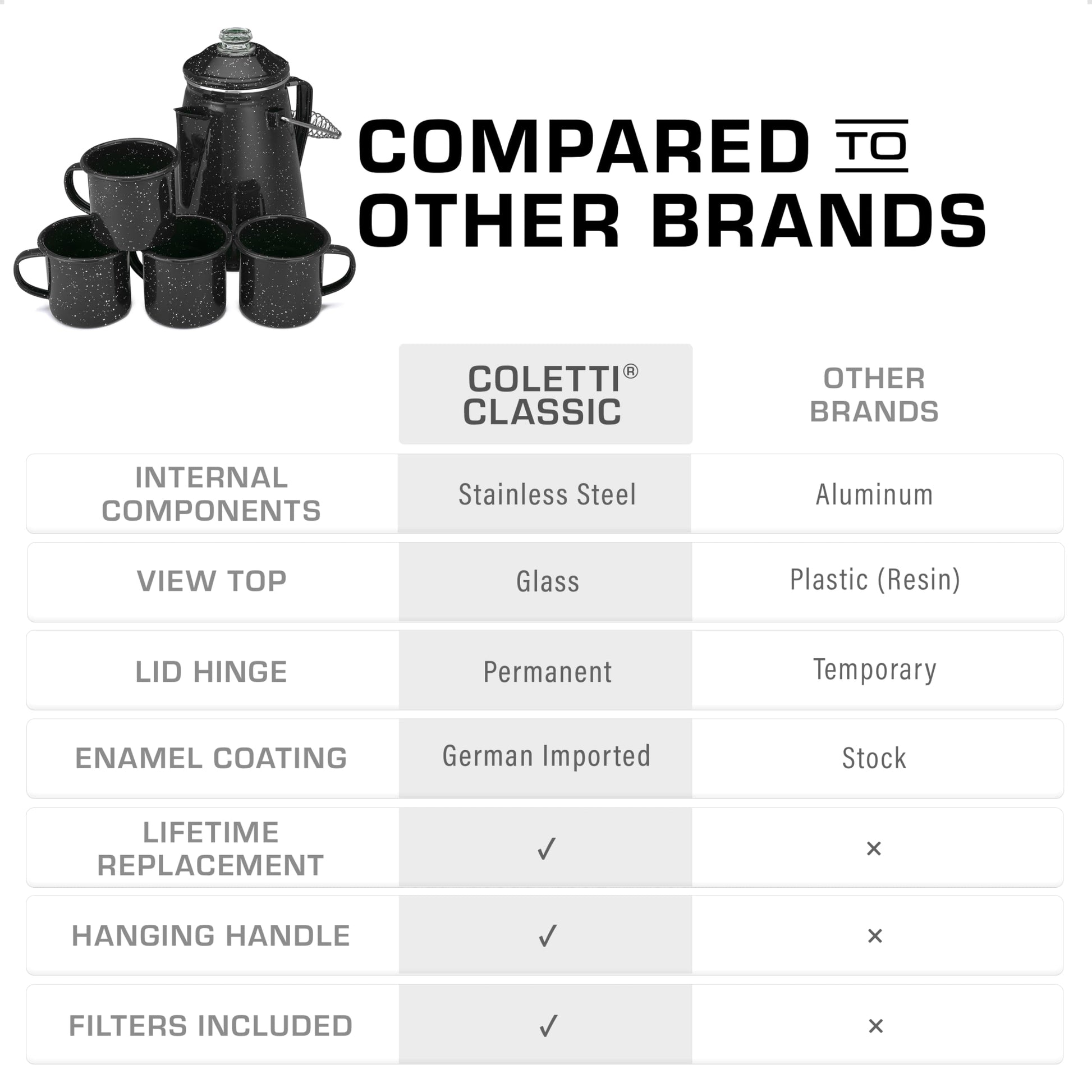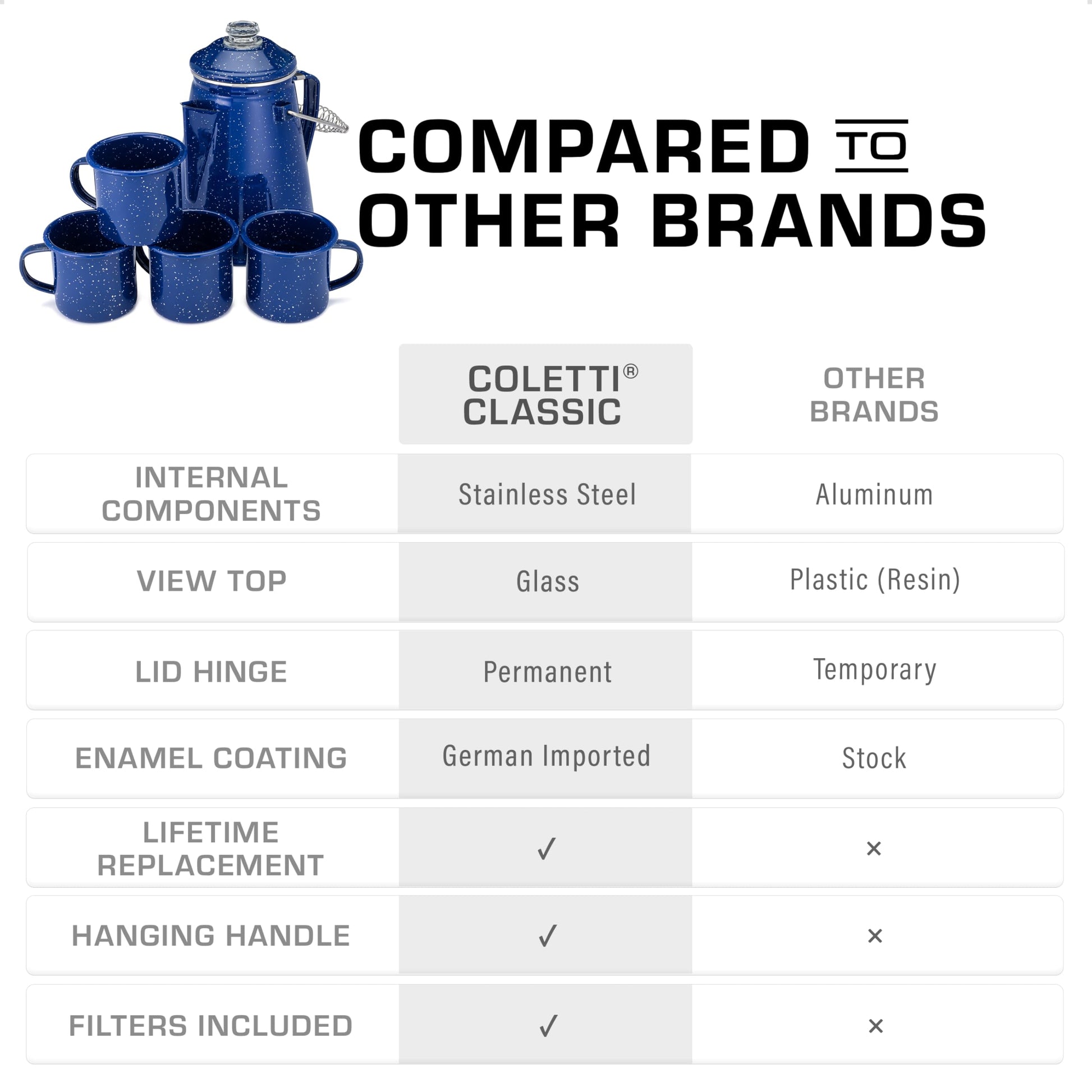 - CAMPING COFFEE MADE EASY: A percolator coffee pot is simple, efficient, & classic. When you want something strong, and it’s too early for beer, brew with a COLETTI Classic (NOTE: 1 coffee cup equals 6 fl oz). Your Perfect Cowboy Coffee Pot