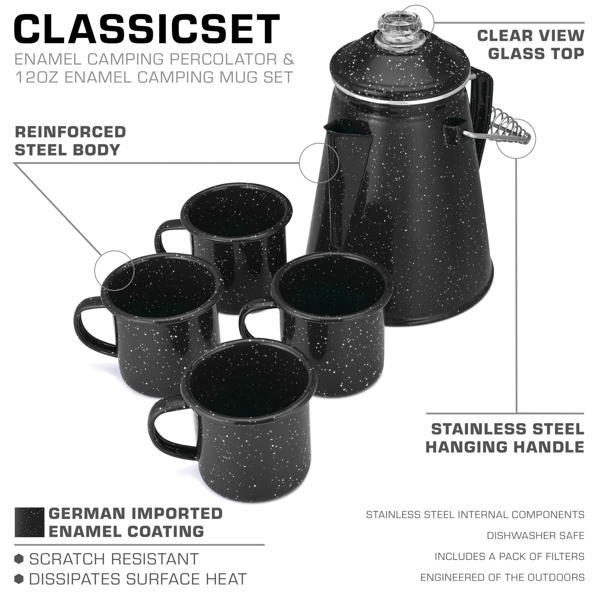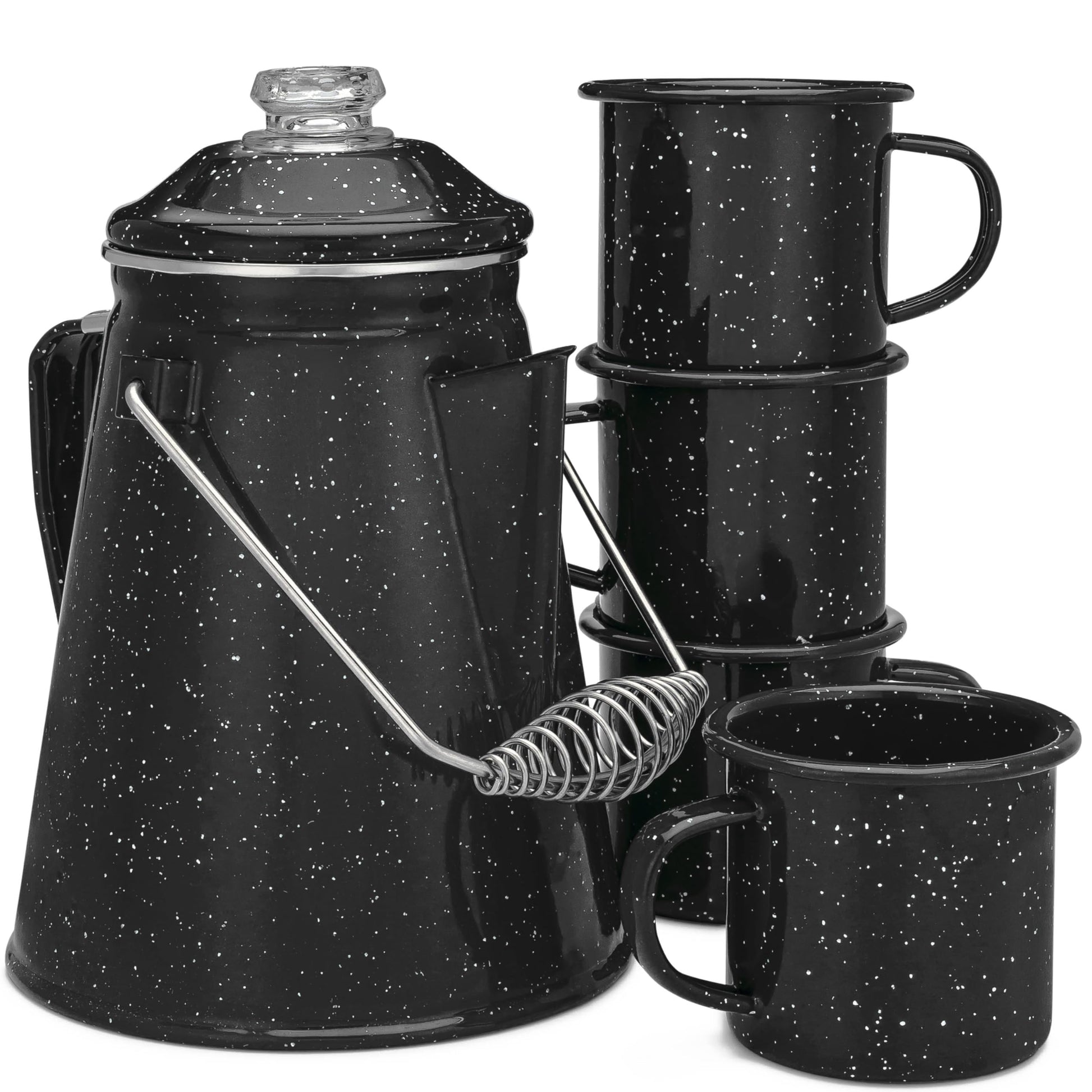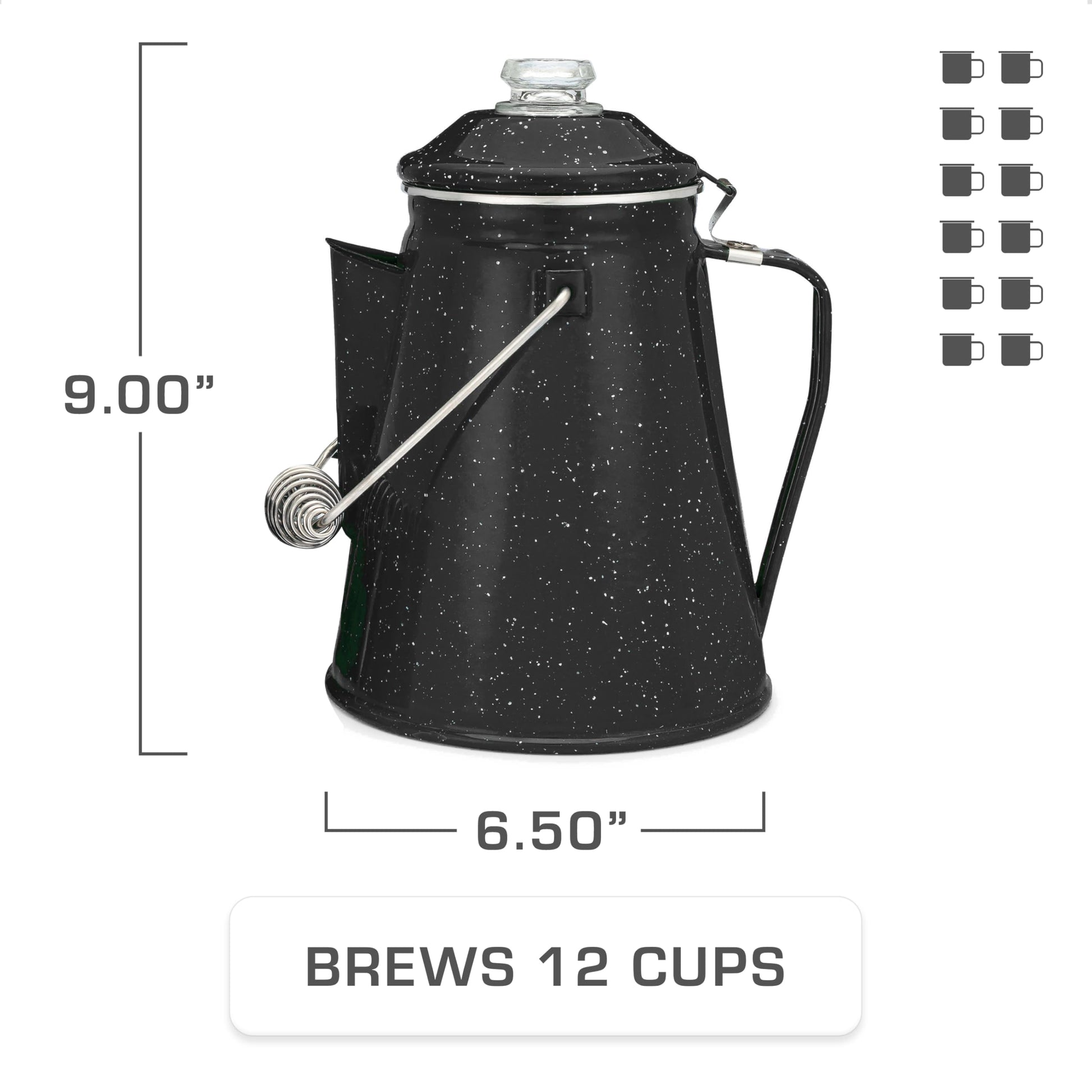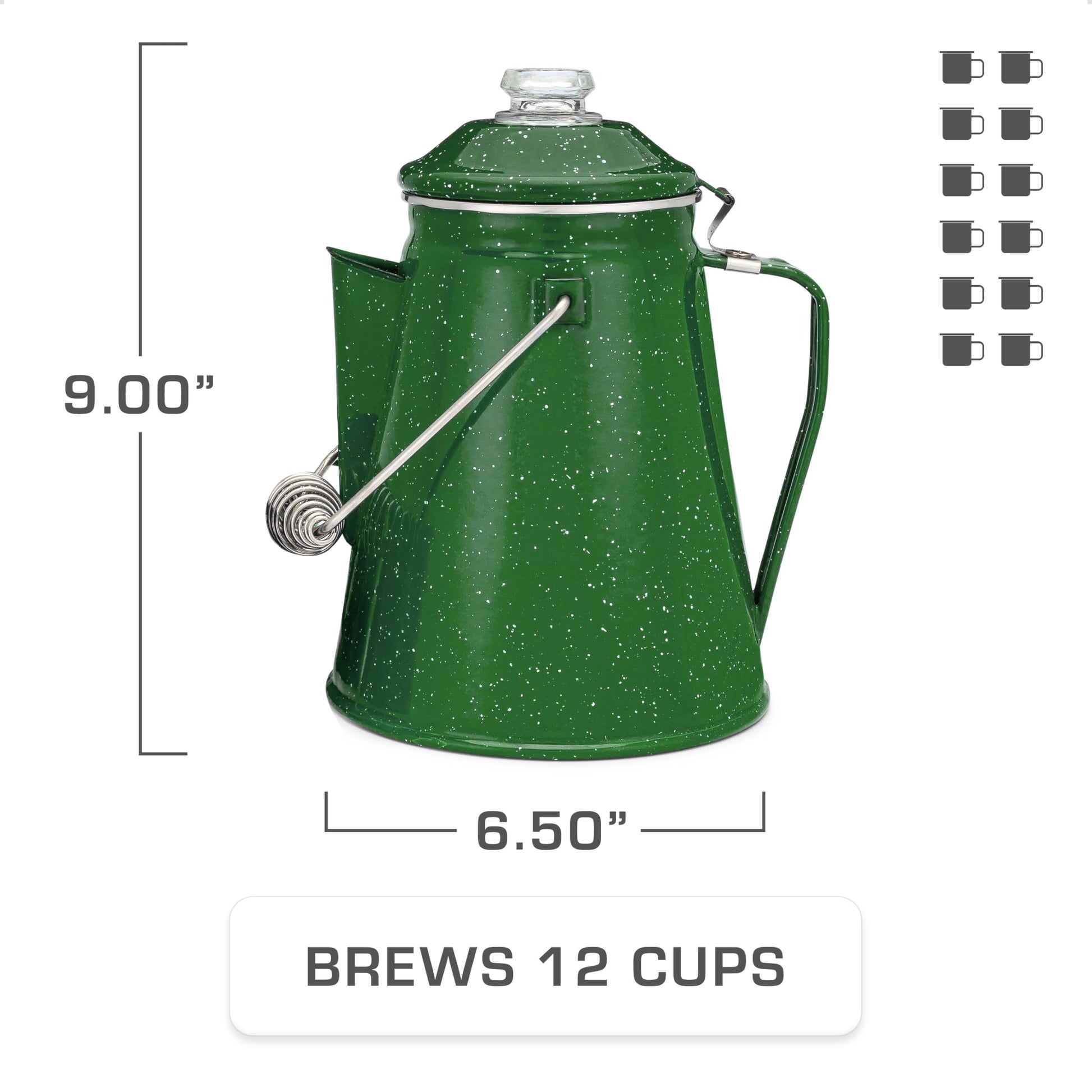 - CAMPING COFFEE MADE EASY: A percolator coffee pot is simple, efficient, & classic. When you want something strong, and it’s too early for beer, brew with a COLETTI Classic (NOTE: 1 coffee cup equals 6 fl oz). Your Perfect Cowboy Coffee Pot