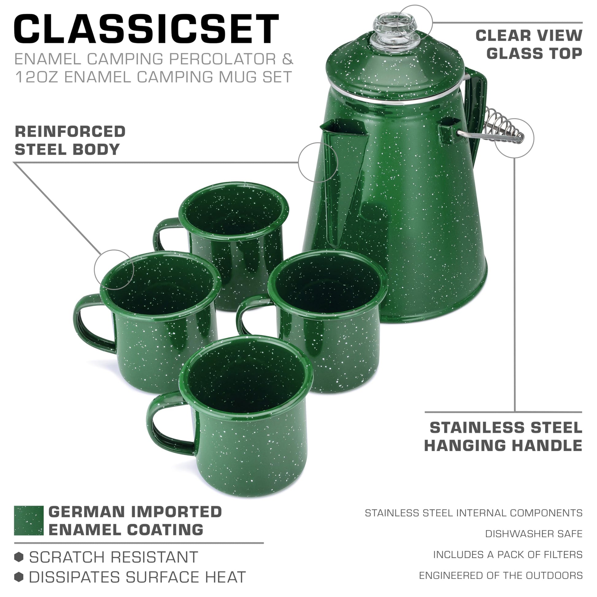 COLETTI Classic Camping Coffee Pot & Mug Set - Percolator Coffee Pot, Enamel Mug Complete Nostalgic Bundle German Imported Enamel Powder [12 oz, Set of 4] (Green)