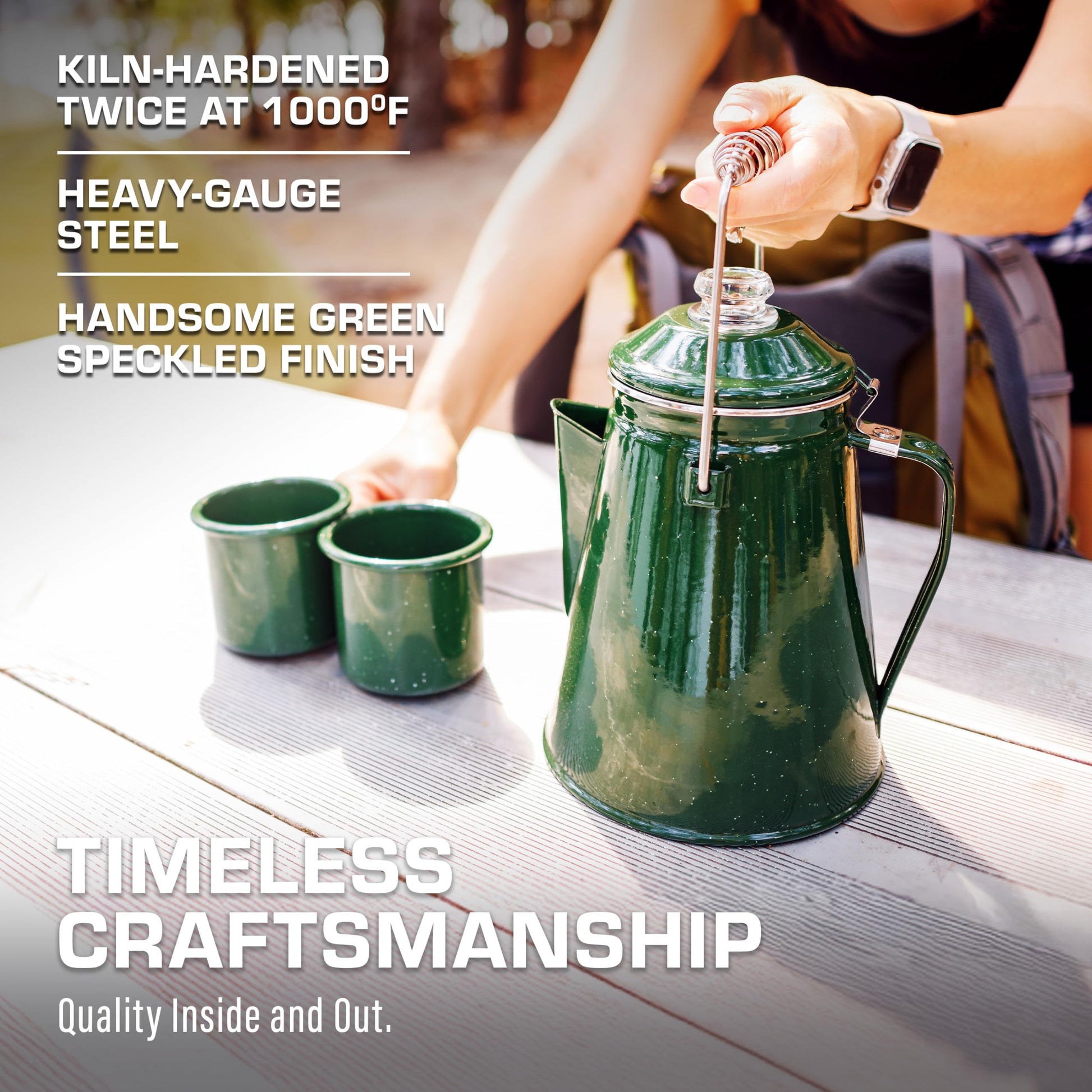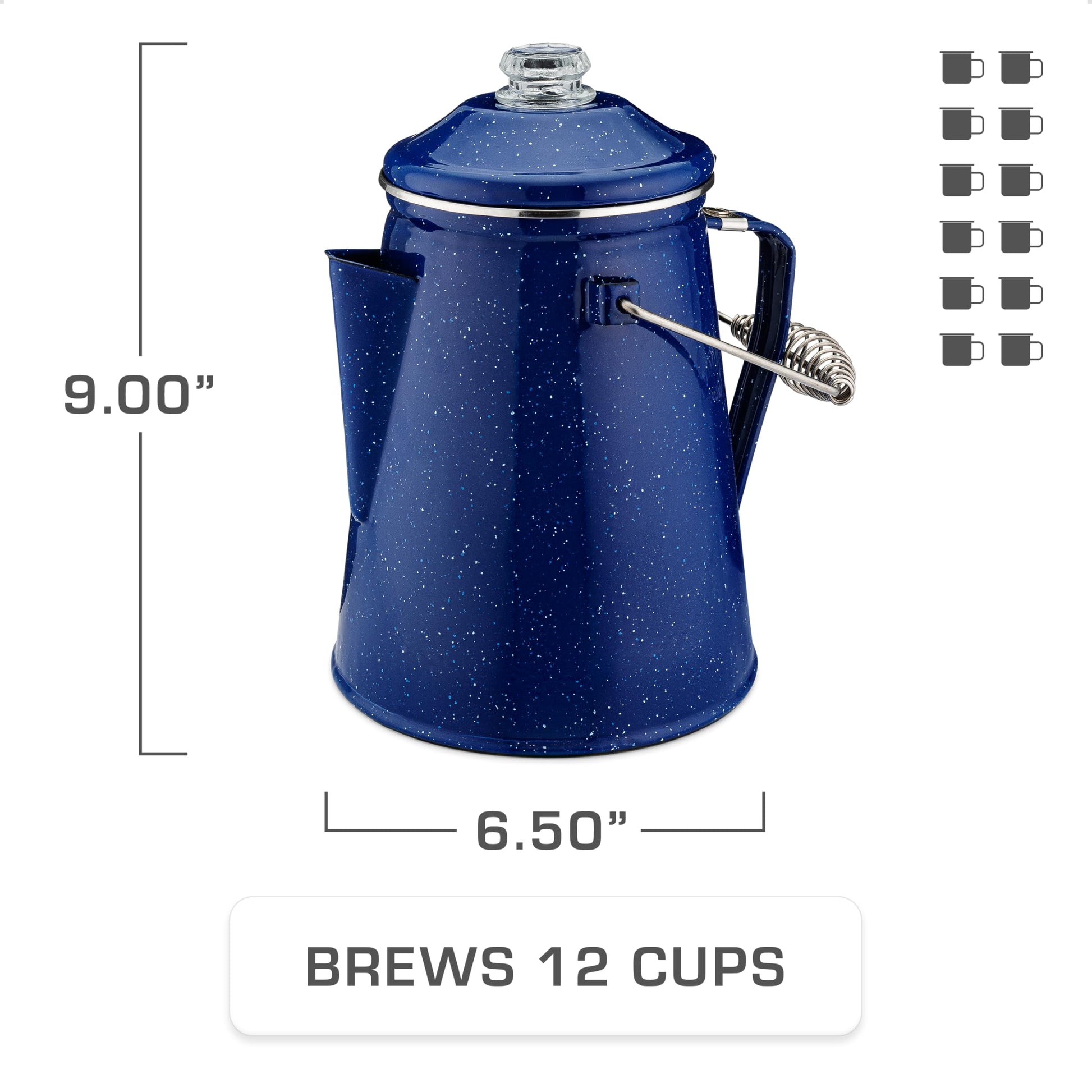 - TIMELESS CRAFTSMANSHIP: Built from heavy-gauge steel, every piece of this stovetop coffee maker is kiln-hardened twice at 1,000℉. A handsome blue camping coffee pot built to last