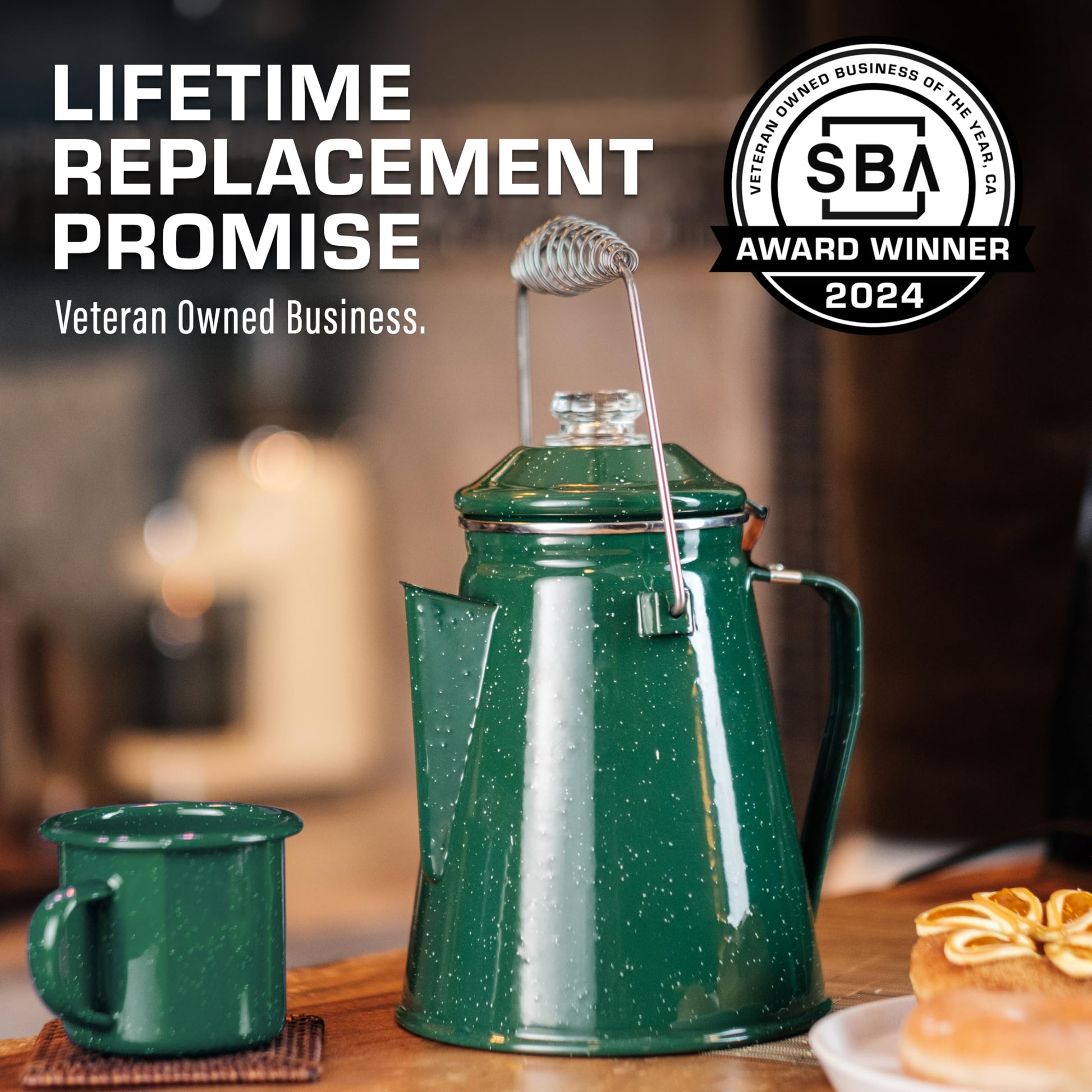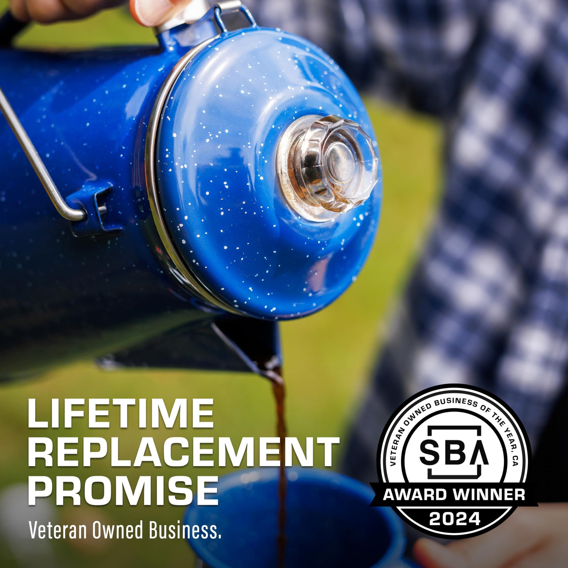 - LIFETIME REPLACEMENT PROMISE: Top materials & workmanship enable a superb promise. Shop with confidence. This is the last camping coffee pot you will ever need. US-based