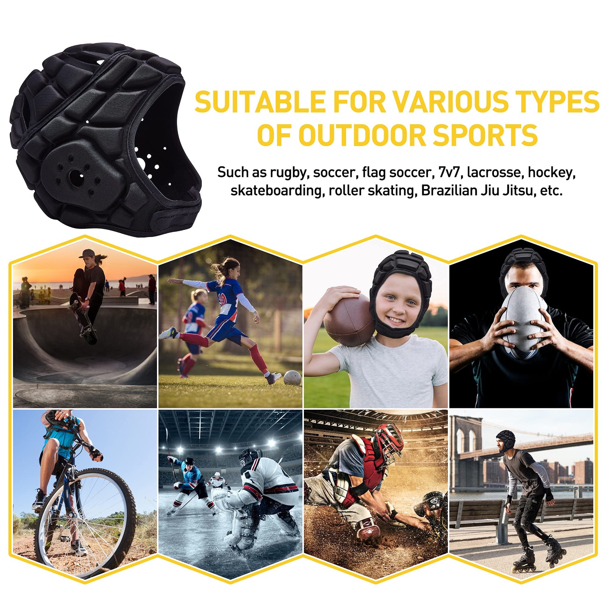 - The adjustable chinstrap and elastic back rear laces ensure the proper fit. The chin fastener attaches the rugby helmet to the head and is easy to put on and take off. Our Scrum Cap is suitable for various types of outdoor sports such as rugby, soccer, flag football, 7v7, lacrosse, hockey, skateboarding, roller skating, Brazilian Jiu Jitsu, etc.