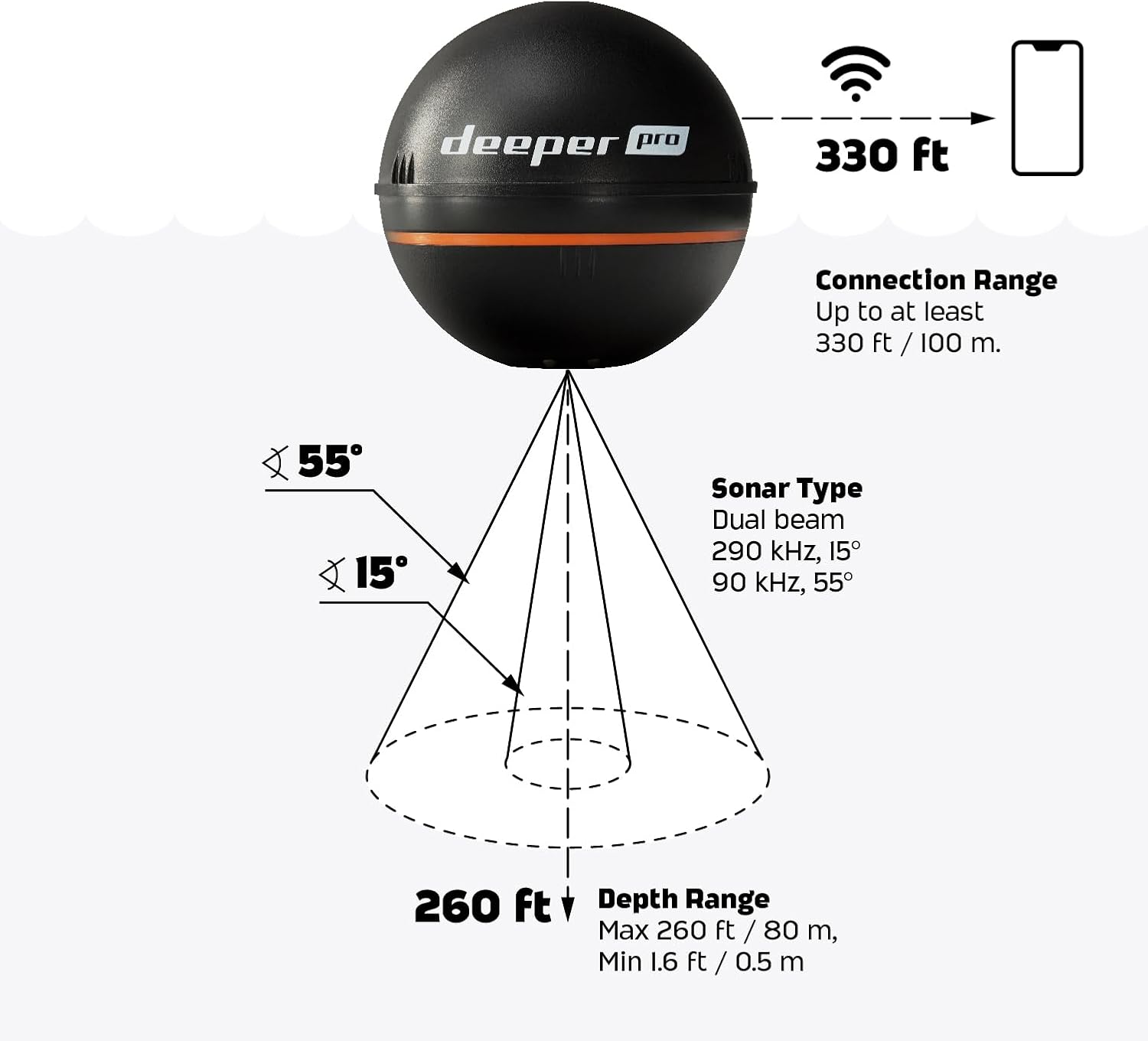 Deeper PRO Smart Sonar Fish Finder Bundle – Castable Wi-Fi Fish Finder with Smartphone Mount for Fishing Rod | Portable Depth Finder for Bank, Boat, Kayak, Ice Fishing | GPS Mapping & App Compatible