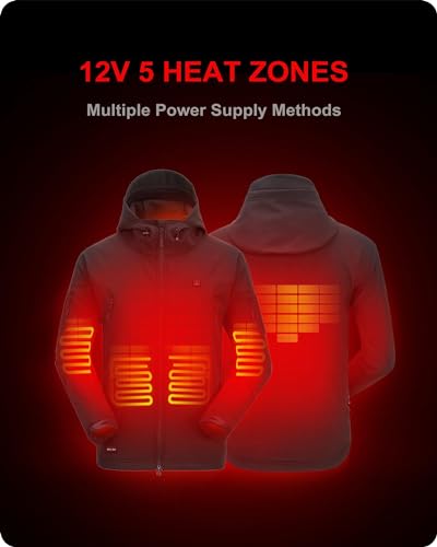 - 12V 5 Heating Zones: The heated jackets are equipped with 5 carbon fiber heating zones (two on front, one on back, and one on each arm). It can heat up your entire core body area and keeps you warm, there are two heating zones near the front pockets that can keep your hands warm at the same time. You can adjust 3 heating modes by short-pressing the power button (Red, Blue, and Green).