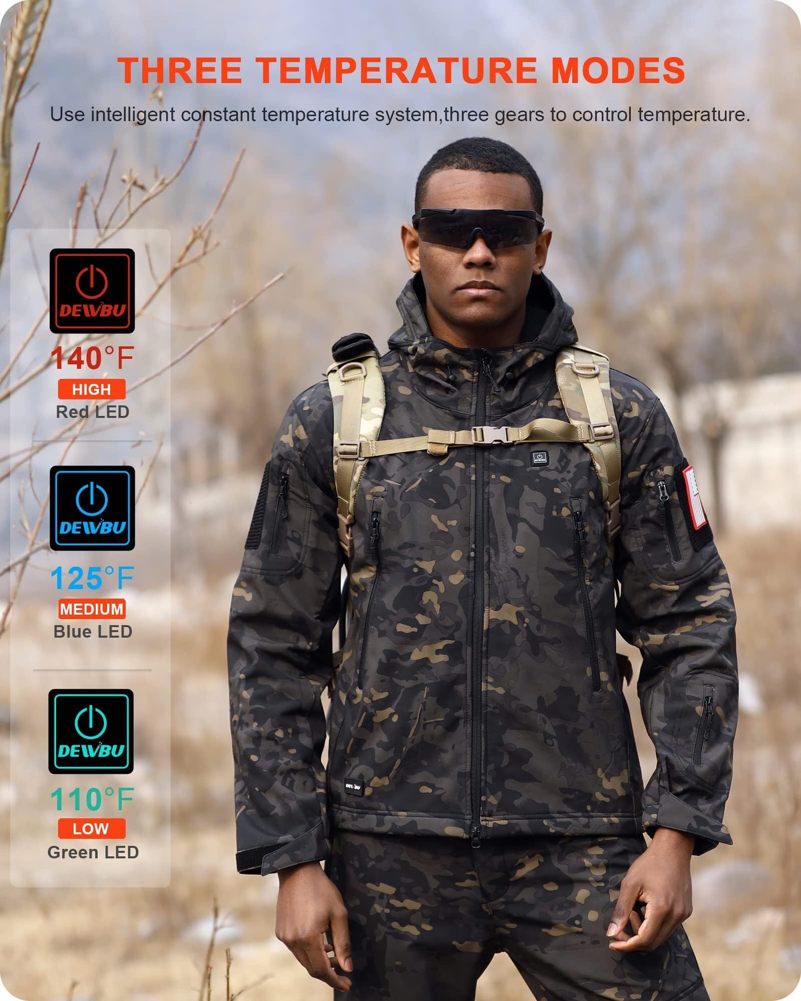 DEWBU Heated Jacket for Men with 12V Battery Pack Winter Outdoor Soft Shell Electric Heating Coat, Men's Black Camo, 2XL