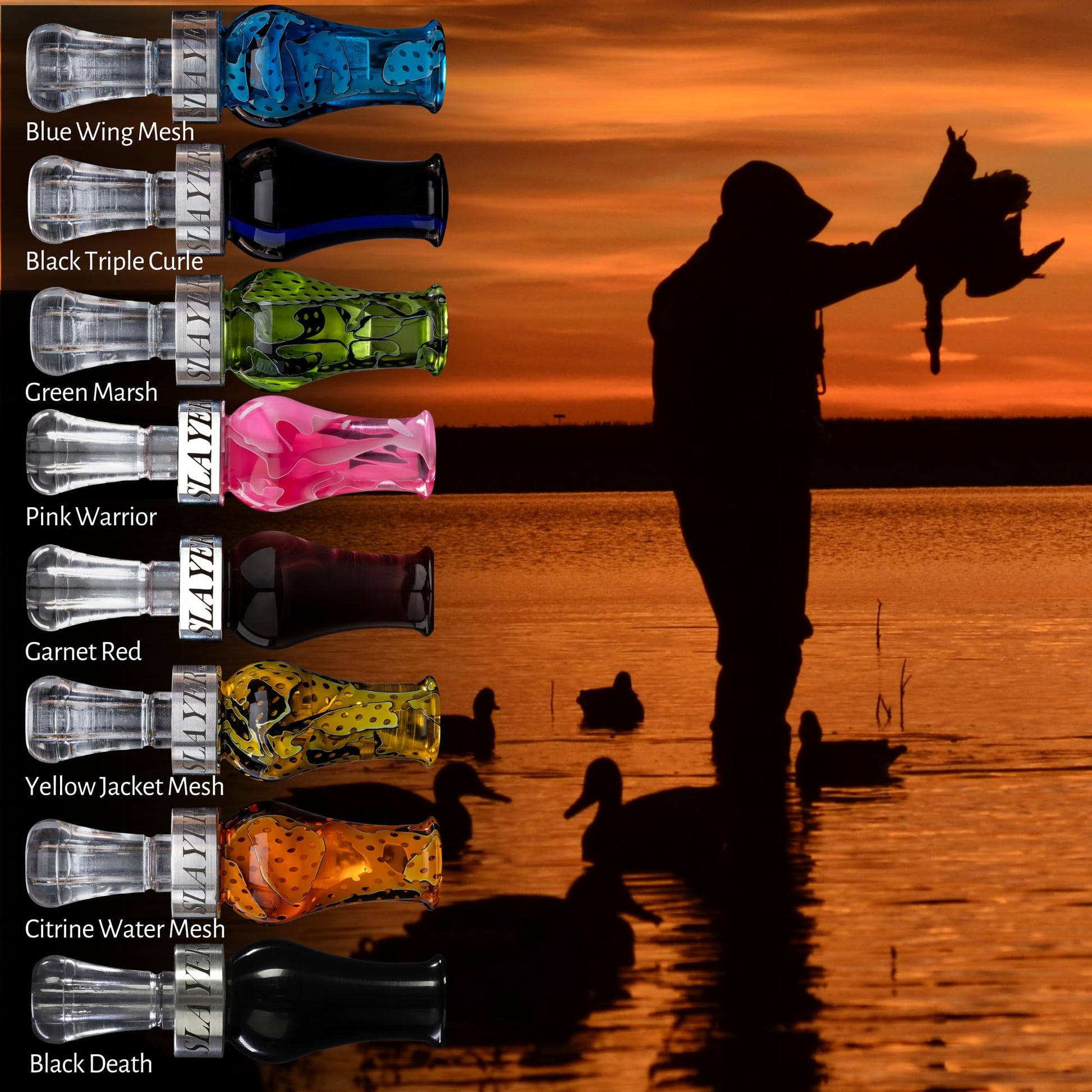 - A must have duck call for the lanyard — get your Slayer today and choose from Citrine Water Mesh (Orange), Yellow Jacket Mesh (Yellow), Blue Wing Mesh (Blue), Green Marsh (Green), Triple Curle (Black with Blue Thin Line) and Black Death (Black) acrylic.