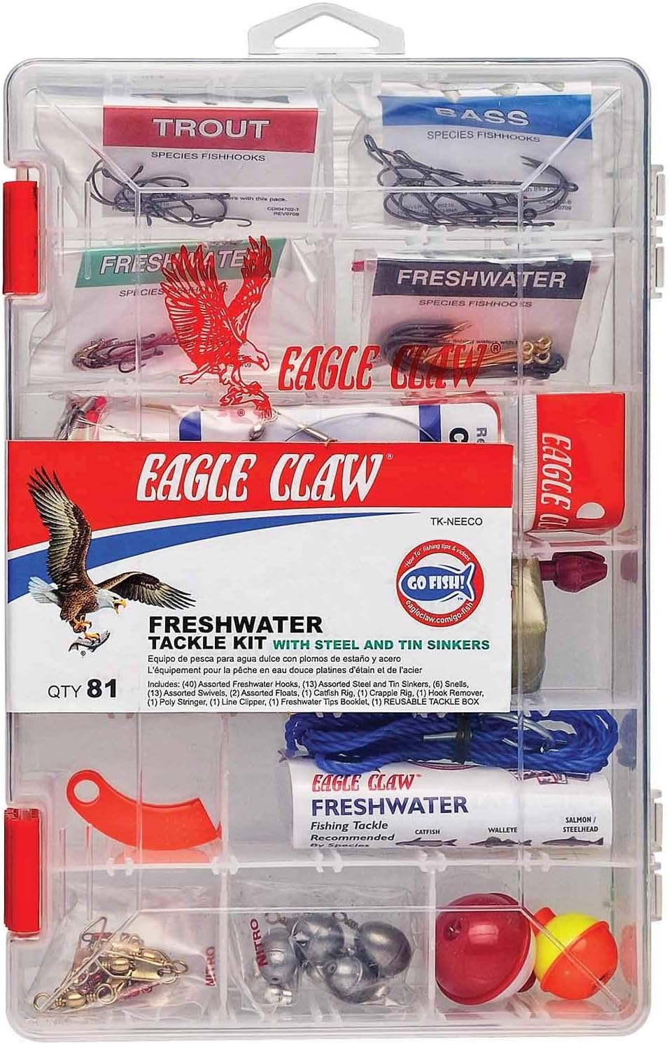 - THE EAGLE CLAW LEAD ALTERNATIVE FRESHWATER TACKLE KIT INCLUDES: 40 Assorted Freshwater Hooks, 13 Assorted Sinkers, 6 Snells, 13 Assorted Swivels, 2 Assorted Floats, 1 Catfish Rig, 1 Crappie Rig, 1 Hook Remover, 1 Poly Stringer, & 1 Line Clipper!